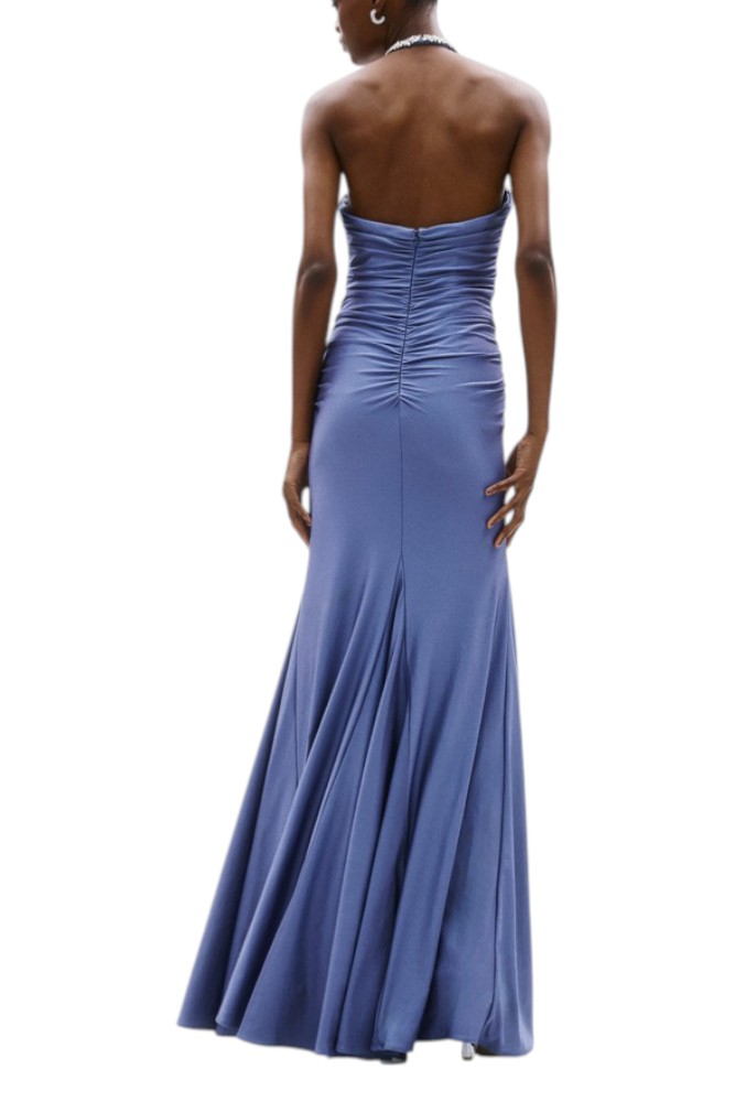 The jewelled neckline adds a luminous and sophisticated touch, elegantly enhancing the décolleté. Strategic gathers along the garment accentuate the figure, creating a flattering and harmonious effect.