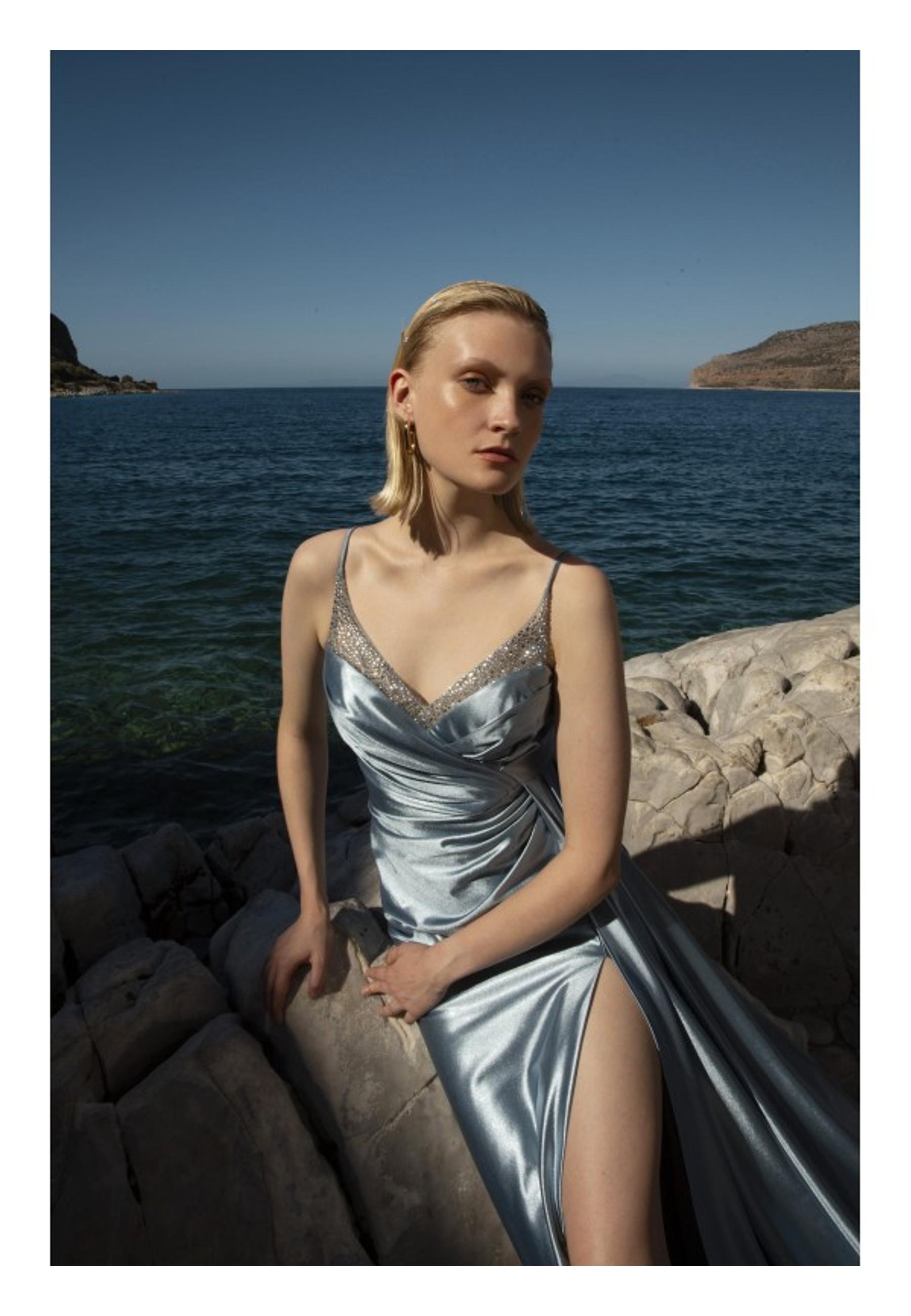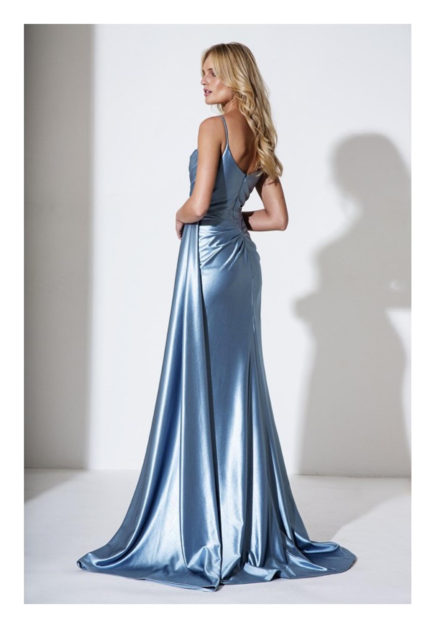 LONG LAMINATED FABRIC DRESS WITH SLIT ALLURE | dress | A4229LIGHT BLUE