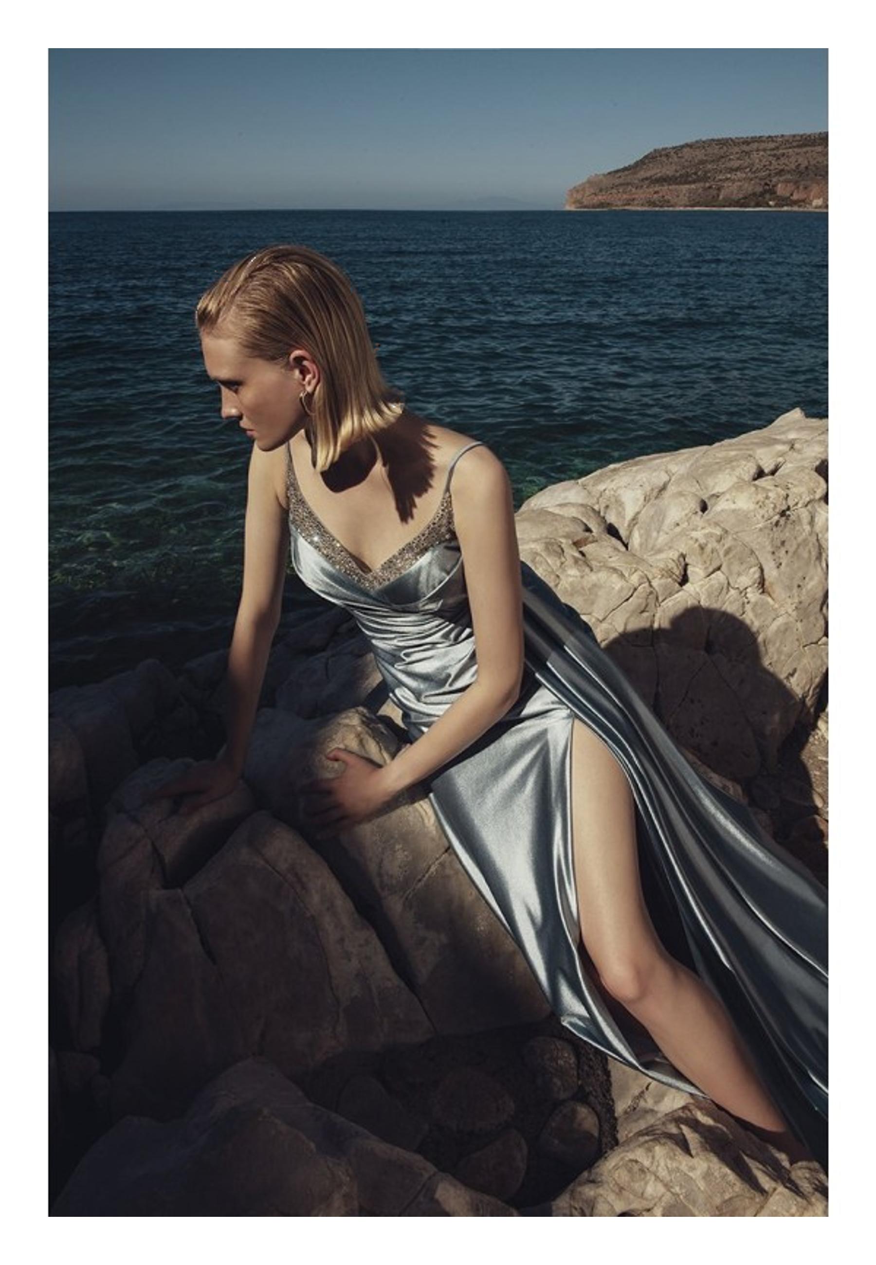 Elegance and brilliance meet in this laminated fabric long dress, designed to catch the eye. The luminous finish gives the garment a sophisticated and modern effect, perfect for special evenings or glamorous events.