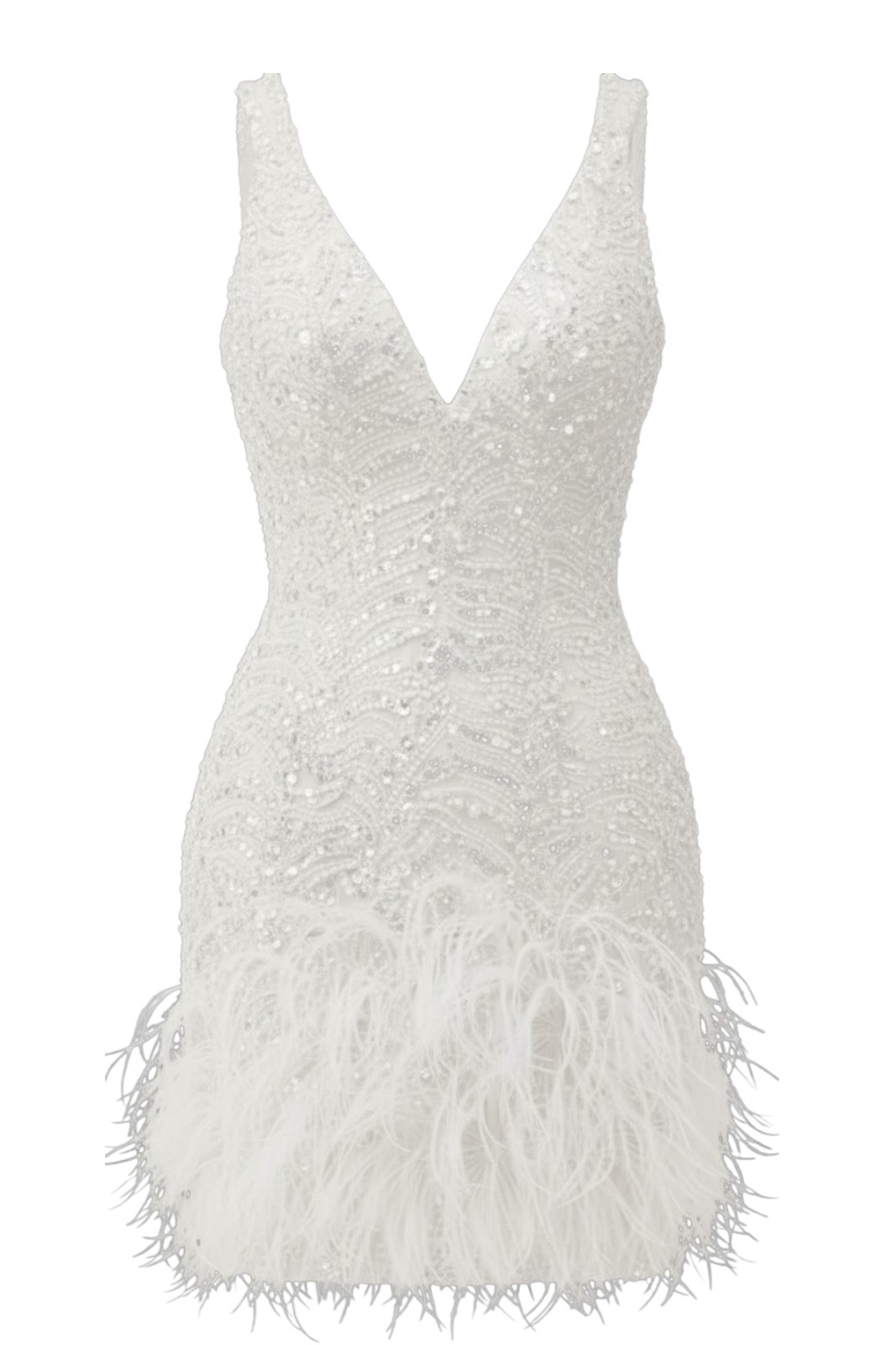 The band of feathers at the hem lends lightness and dynamism to the design, enhancing the short cut with a touch of glamour. The sleeveless style, featuring straps and padded cups, flatters the décolleté and ensures a structured yet comfortable fit.