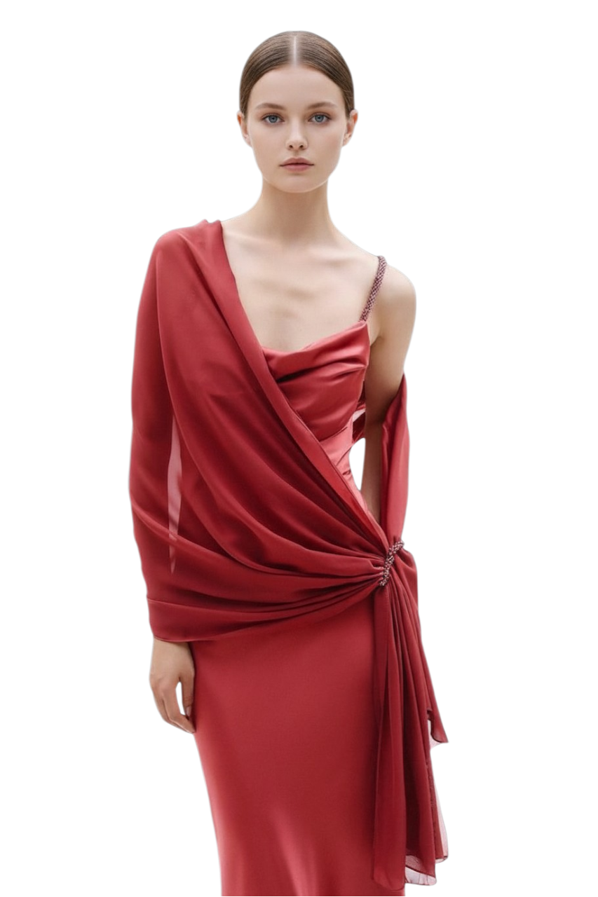 Slippery dress with jewelled straps and stole