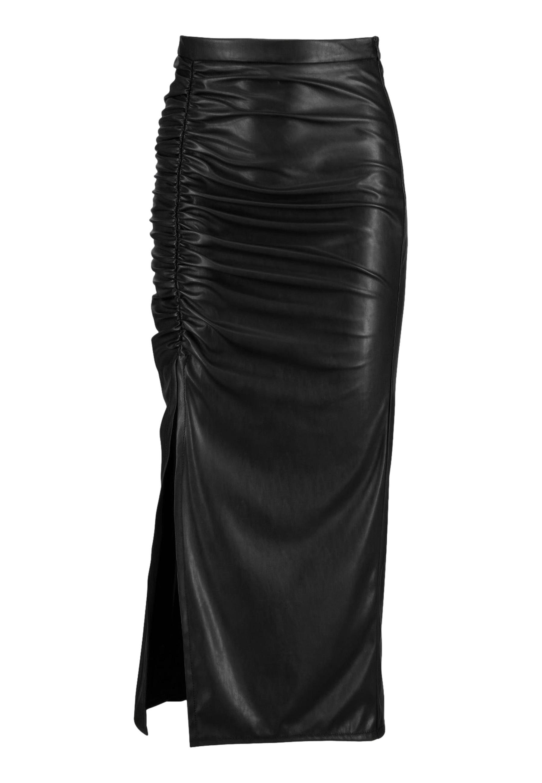 High-waisted midi skirt made of stretch faux leather. Model with a slit and side gathers that give movement to a garment that is tight-fitting by nature.