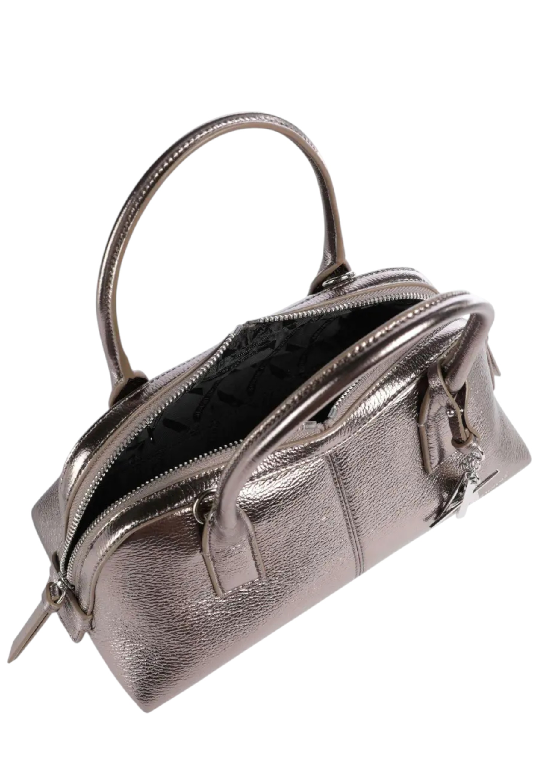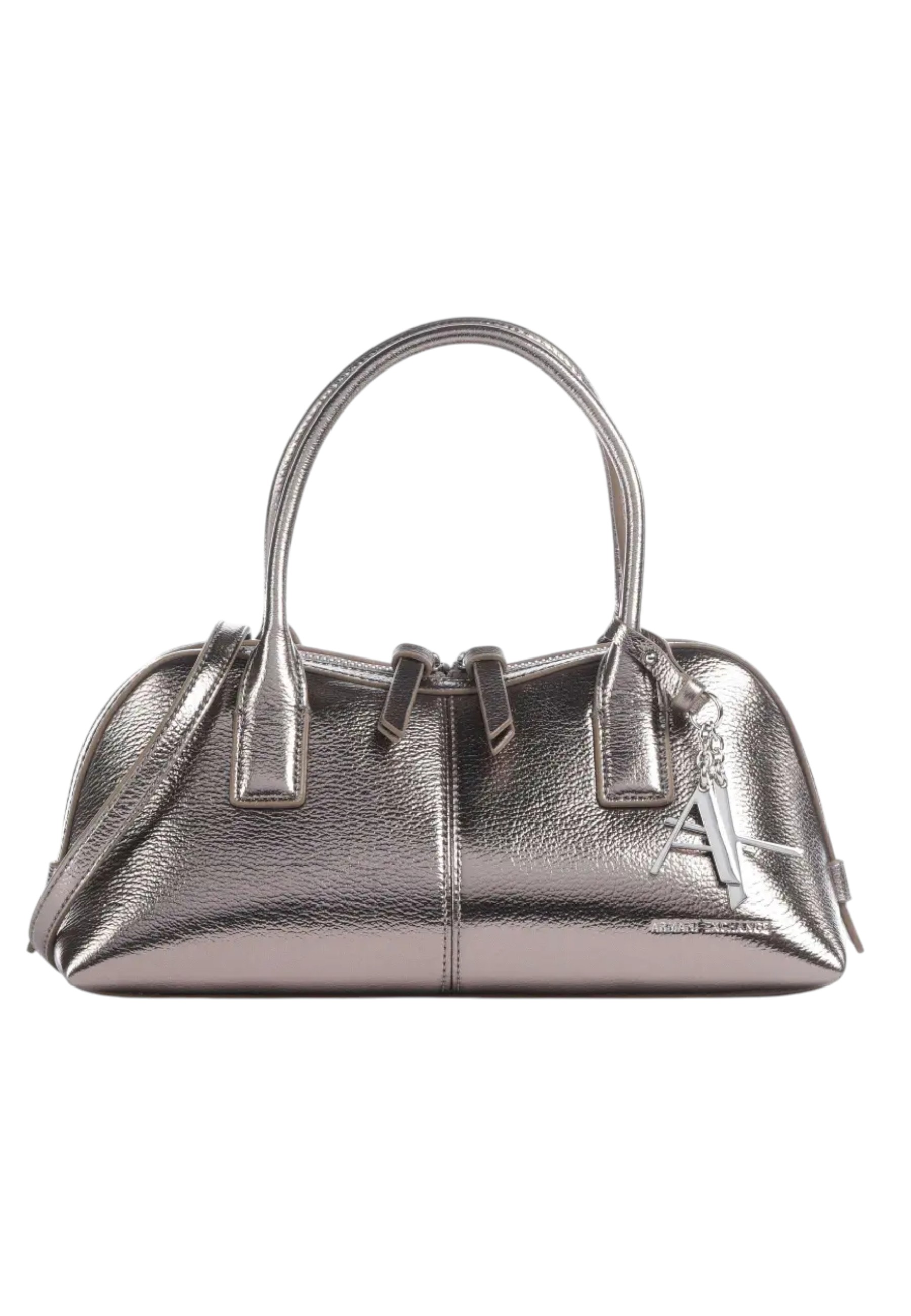 The Armani Exchange bag strikes the perfect balance between urban style and modern sophistication. Crafted from high-quality synthetic leather, it stands out for its silver metal finish and detachable charm, which adds a distinctive and sophisticated detail. The compact and versatile design is completed by two handles and an adjustable and removable shoulder strap, allowing you to carry it comfortably by hand or on your shoulder.