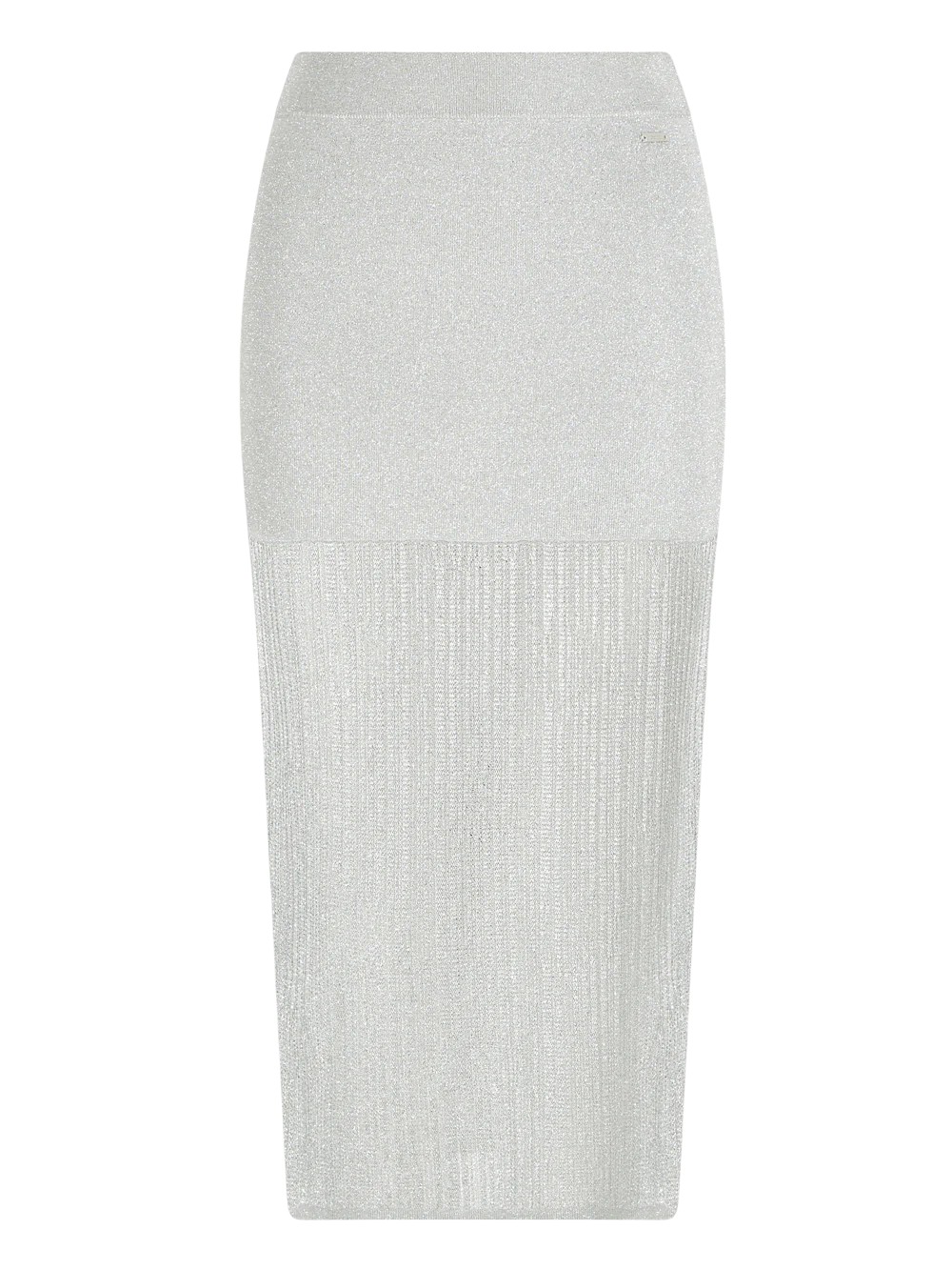 Lurex yarn skirt, designed to add a touch of sparkle to your wardrobe. The sophisticated design features an underskirt for added comfort and coverage, ensuring discreet elegance. The elasticated waist offers a practical and versatile fit, adapting perfectly to the silhouette. On the back, a metal plaque with logo adds an exclusive and refined detail. Perfect for evening occasions or special events, pair with coordinated tops or light blouses for a glamorous and chic look.