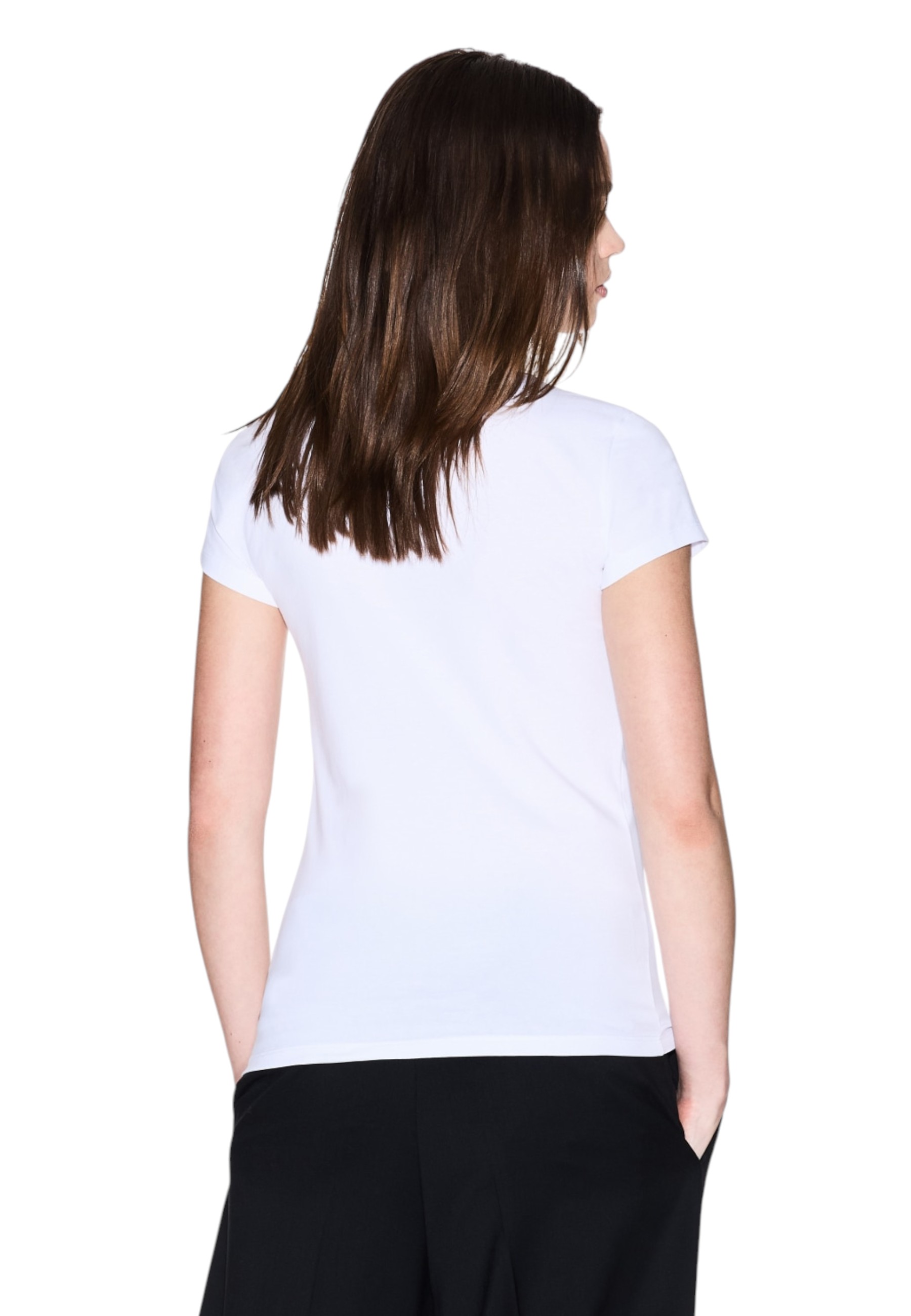 This Armani Exchange women's T-shirt combines simplicity and character in a contemporary style. Made from soft cotton jersey, it offers a slim fit that flatters the silhouette without compromising on comfort. The minimalist design is embellished with a tone-on-tone Armani Exchange logo on the front for an elegant and discreet effect. Ideal for pairing with casual or more refined looks, it is a versatile must-have for any wardrobe.