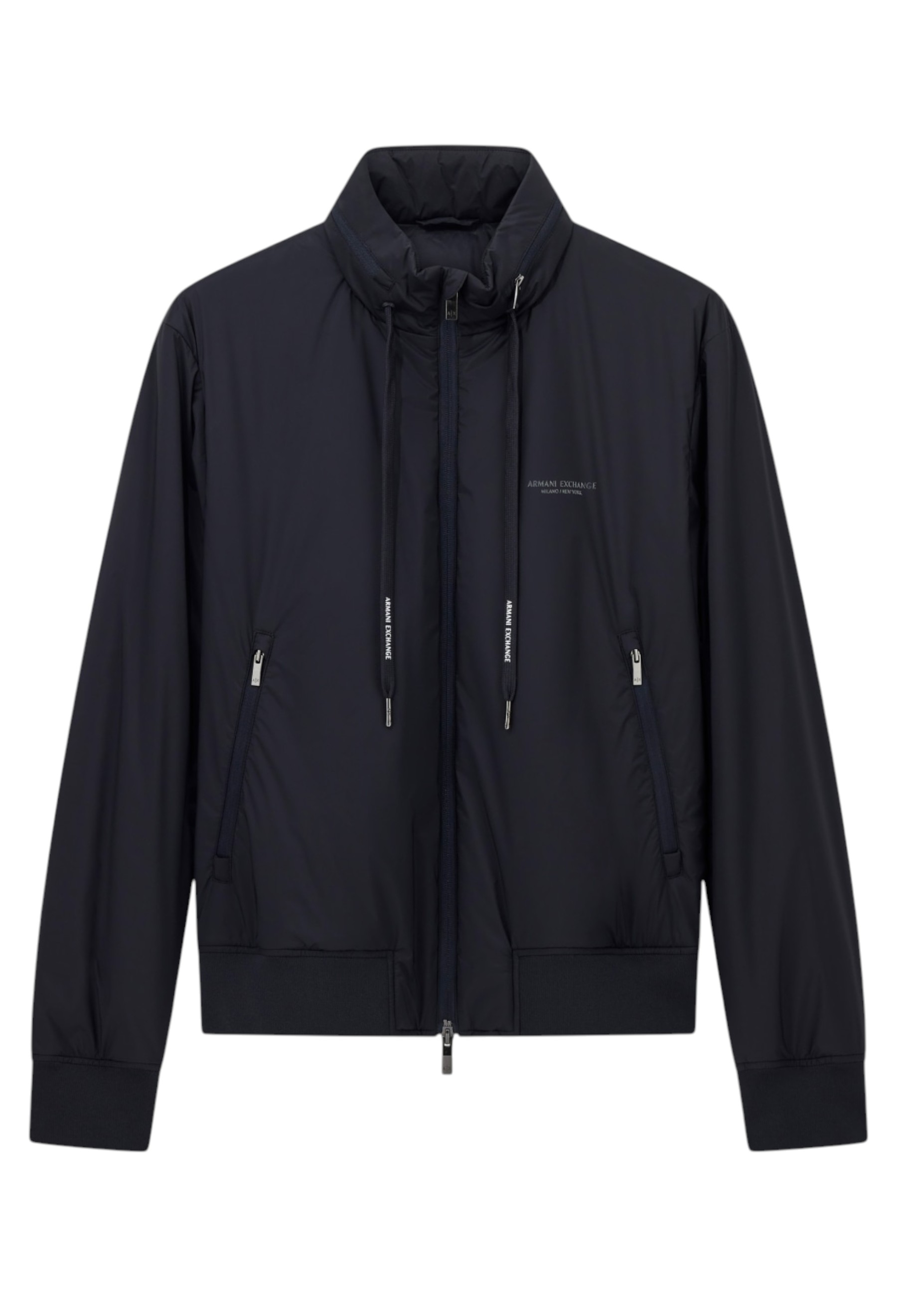 This jacket is made from a lightweight fabric, making it the perfect garment for tackling unpredictable weather with a dynamic, contemporary style. It stands out for its high collar with adjustable logo drawstrings, a functional detail that adds a distinctive urban touch. The front zip fastening and practical side zip pockets define its minimalist design. The discreet 'Armani Exchange Milano / New York' logo printed on the chest gives the garment an unmistakable identity.