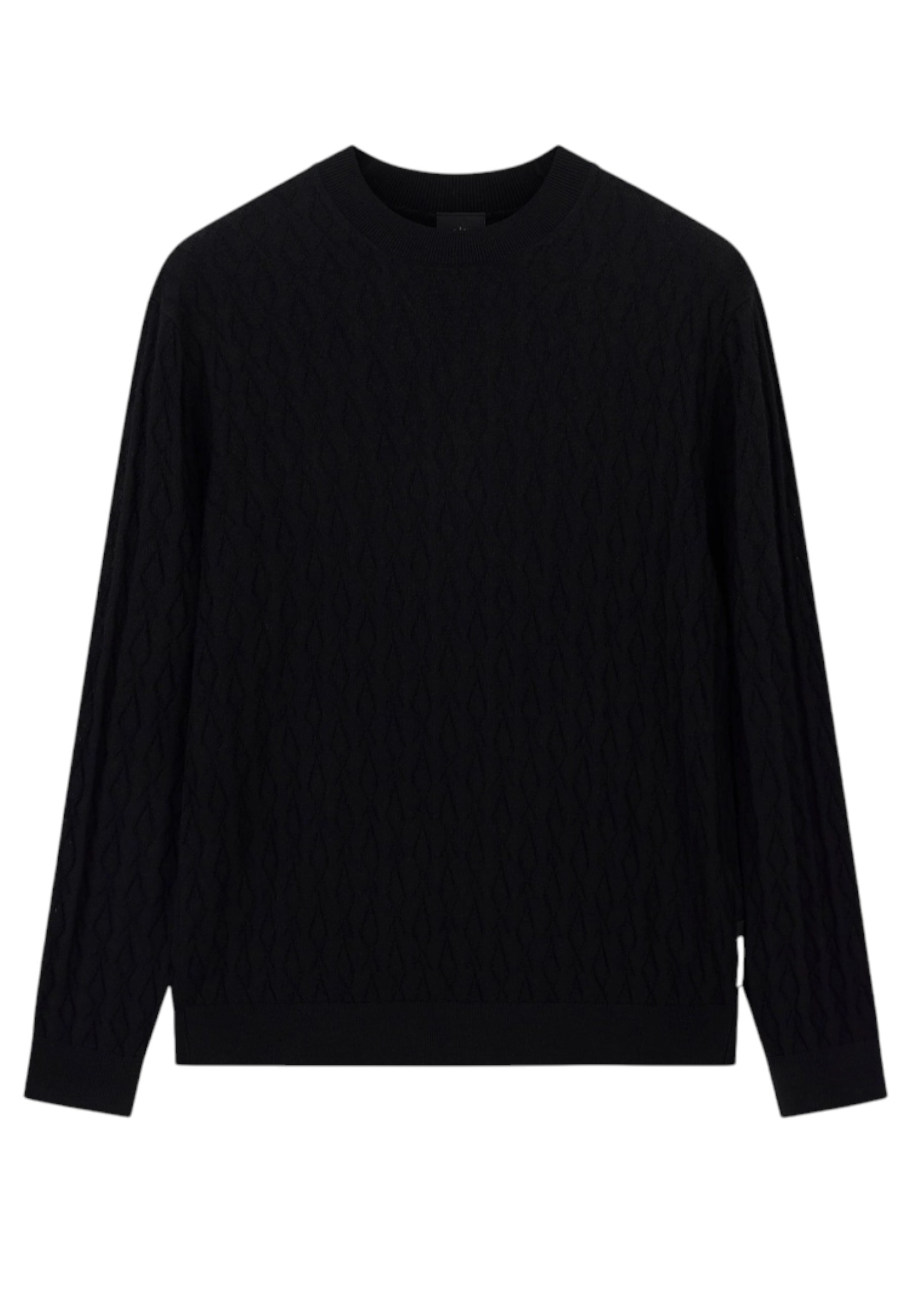 A warm and comfortable wool blend crew neck jumper featuring a refined wave pattern with a see-through effect and ribbed trim that adds structure to the garment. A logo label completes the design, making it ideal for a casual yet polished look. Made from a blend of acrylic and virgin wool, with knitted details including polyamide and elastane, it offers comfort, softness and a flawless fit.