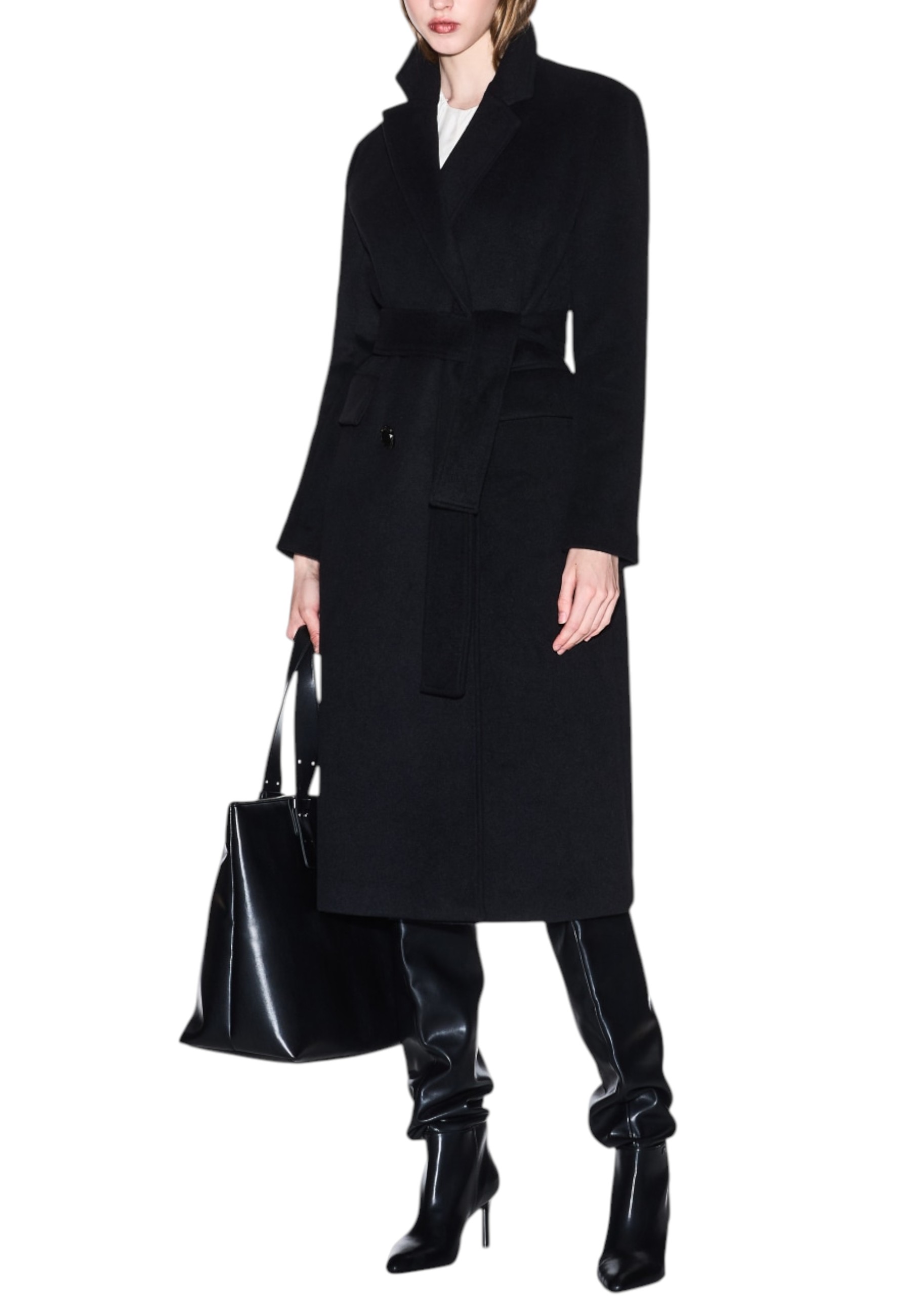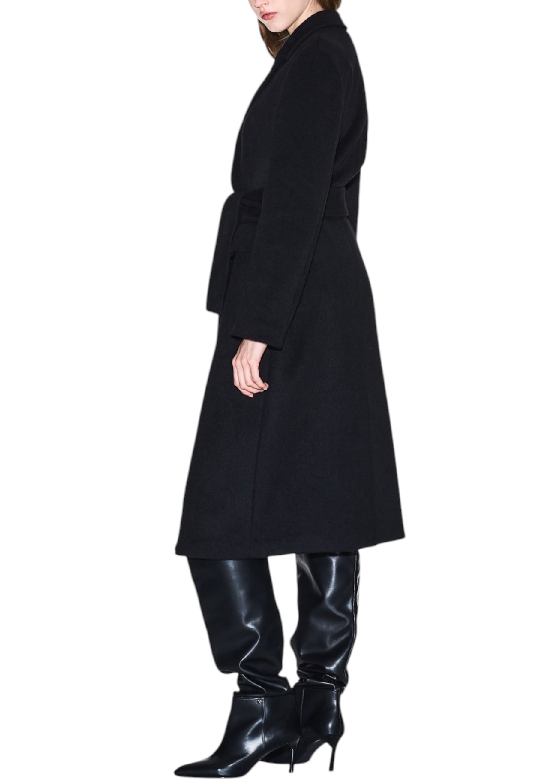 Long coat made from a soft, enveloping fabric, ideal for offering warmth and a touch of sophisticated elegance. Its flowing silhouette and clean lines make it a versatile and timeless piece, perfect for any occasion. The design is enhanced by a wide waist belt that defines the figure, enhancing the garment's sophistication.