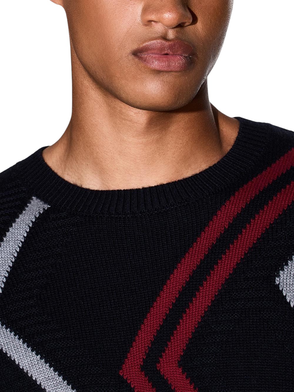 Crew neck jumper made from a soft and comfortable yarn, chosen for its ability to provide warmth and a pleasant feel against the skin. Its compact yet flexible texture ensures a versatile fit and a defined silhouette. The geometric intarsia knit adds an original visual element.