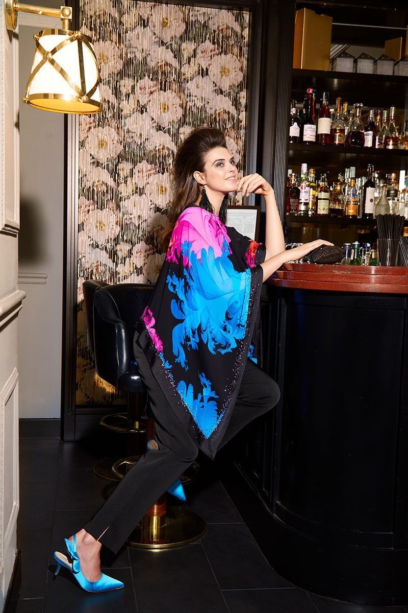 A refined and versatile outfit consisting of a black tank top, plain black trousers and a multicoloured patterned chiffon tunic. The light tunic, with contrasting black edging, gives movement and colour to the look, enhancing the figure with elegance and freshness.