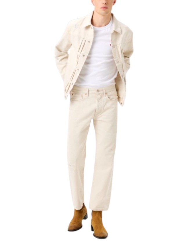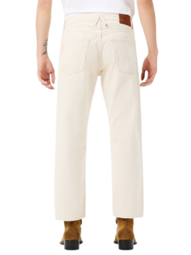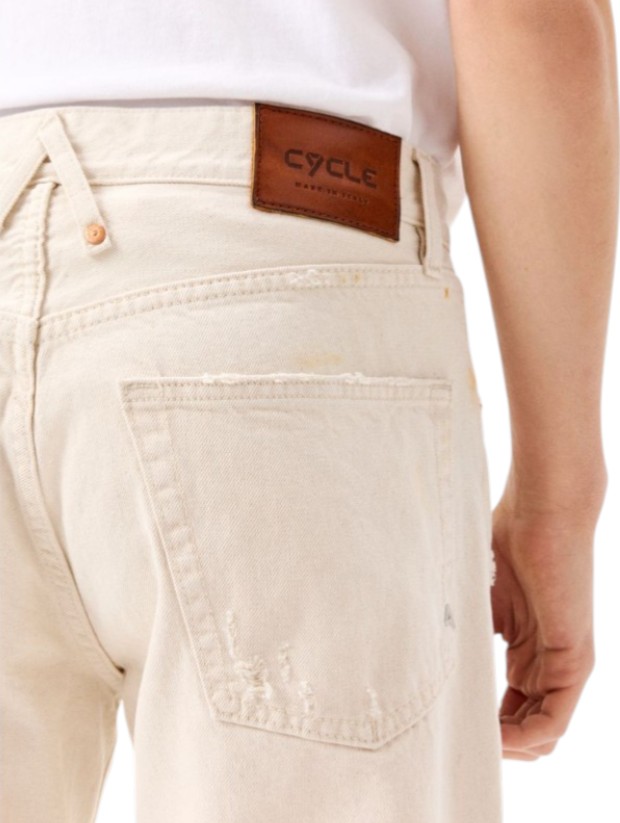 Men's straight-fit jeans with a low, straight waist. Featuring a straight, cigarette-style leg with a 90s vibe, this five-pocket style is crafted from comfortable, stiff bull denim made from pure GRS (Global Recycled Standard)-certified organic cotton and is garment-dyed in a faded ecru shade with a worn effect, accentuated by mended rips. The back features unmistakable references to the Cycle logo: the crossed belt loops and the small plated detail on one of the two patch pockets.