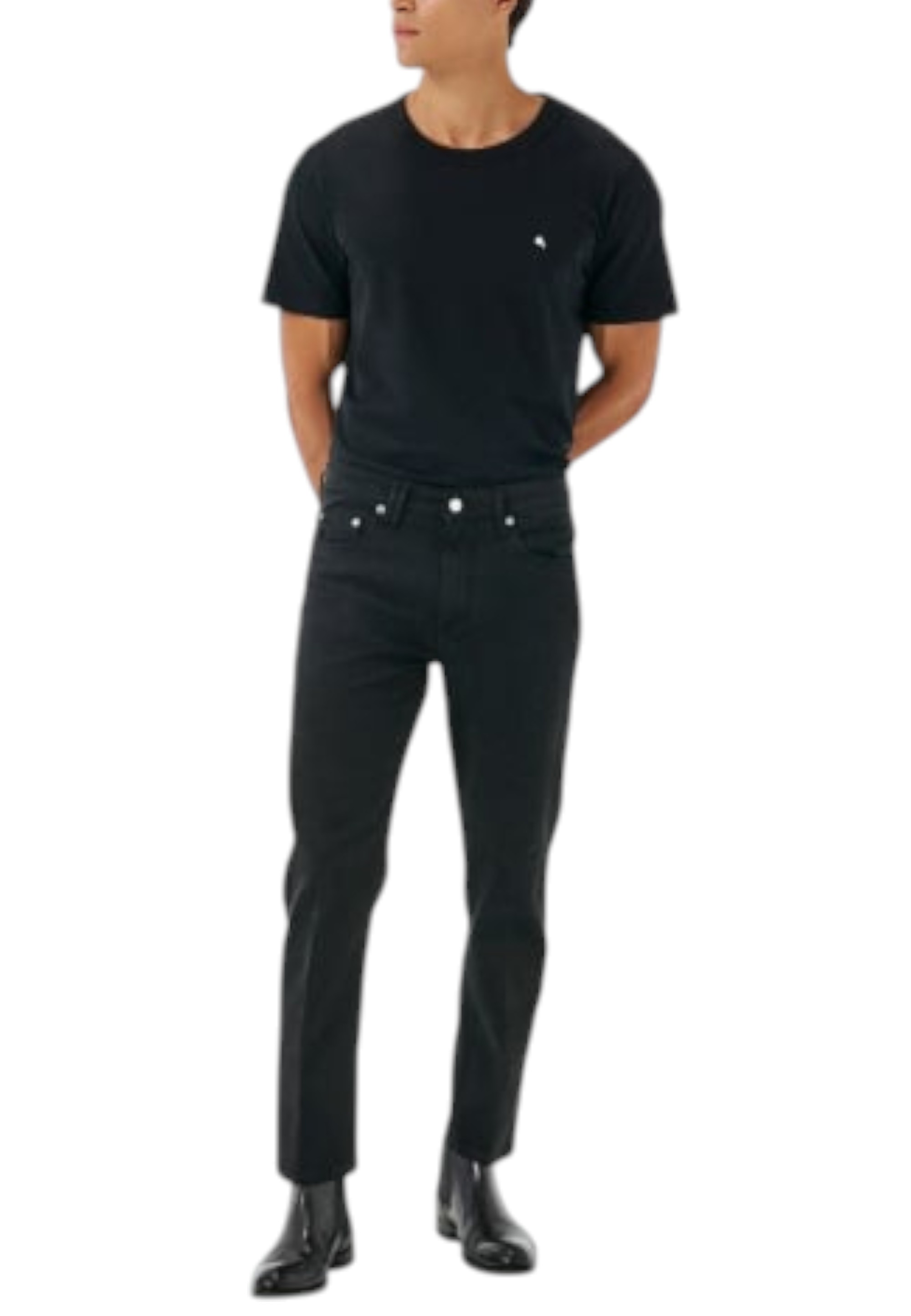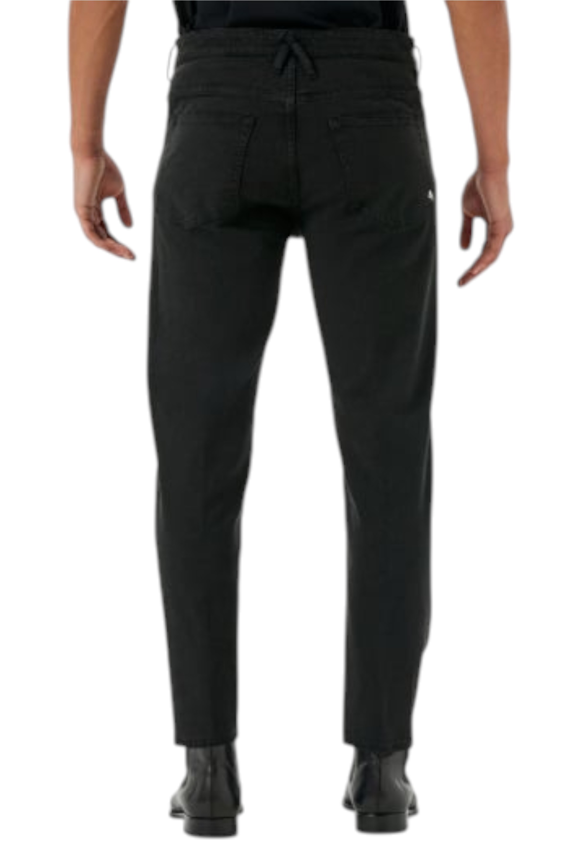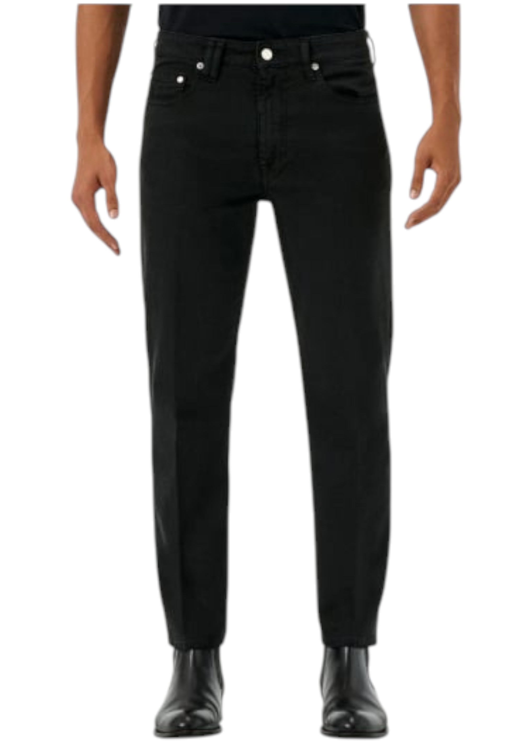 High-waisted tapered fit jeans. This five-pocket style features a softer waist and a regular leg that tapers towards the bottom. The fabric, a comfortable black garment-dyed bull denim, is characterised by its used look, highlighted by small tears at the edges of the pockets and the bottom of the legs. The distinctive touch is provided by the crossed belt loops on the back, which echo the logo, and the unmistakable plated logo on the back pocket, an expression of the brand's DNA. An urban garment in pure Cycle style, designed to elevate your everyday looks.