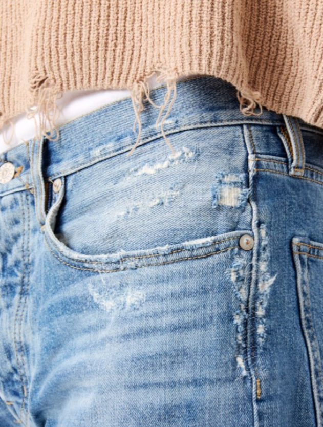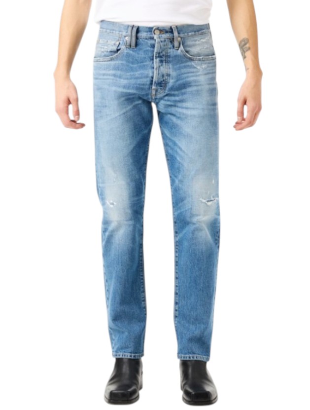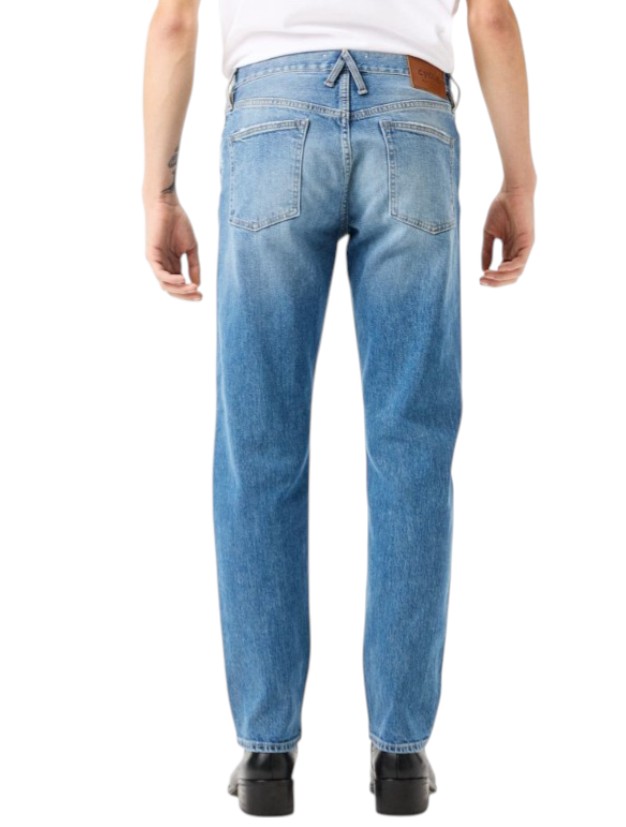 Men's straight-fit jeans with a low, straight waist. This five-pocket style, featuring a straight, cigarette-cut leg with a 90s vibe, is crafted from comfortable stretch cotton denim with an orange-peel texture, and comes in a blue shade with an antique vintage wash and small mended rips for a worn look. The back features unmistakable references to the Cycle logo: the crossed belt loops and the small plated detail on one of the two patch pockets.
