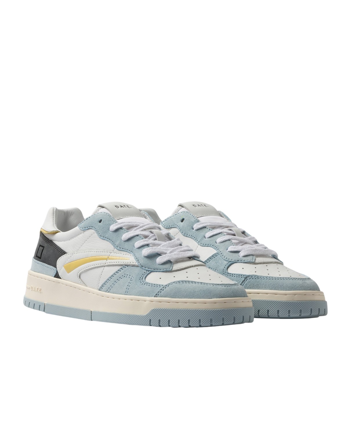 The toe is made of leather with perforations for improved breathability. On the tongue is stitched the leather label with the D.A.T.E. logo The laces are made of cotton and the square logo is stamped on the side. The heel is made of white leather. The model name is stamped on the back. Leather and cotton terry lining. The insole is raised by 2.5 cm for better comfort. The square logo and D.A.T.E. lettering are embossed on the sole. The rubber sole, 2.5 - 3.5 cm high, is stitched. All materials selected are Made in Italy. Fit: REGULAR