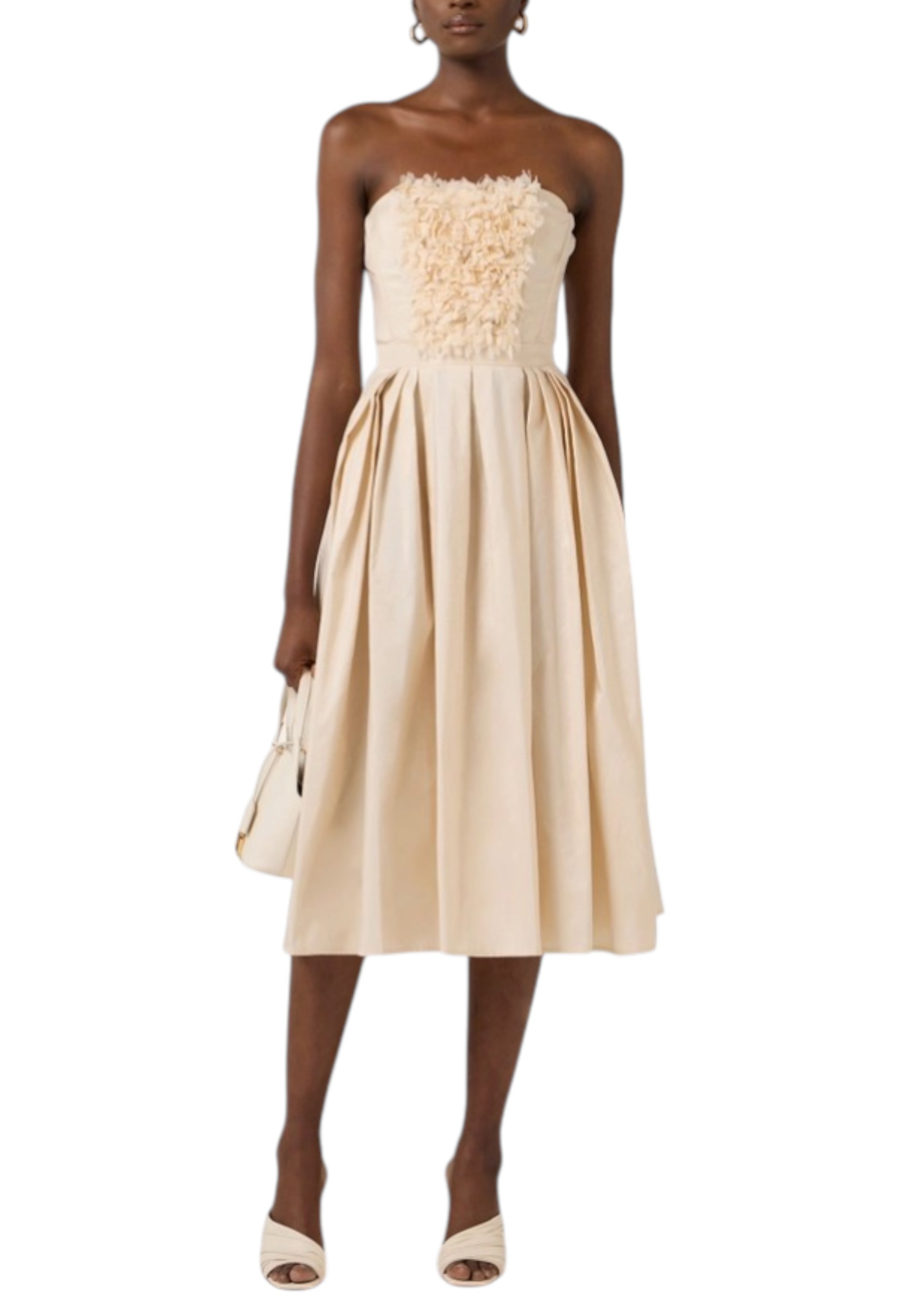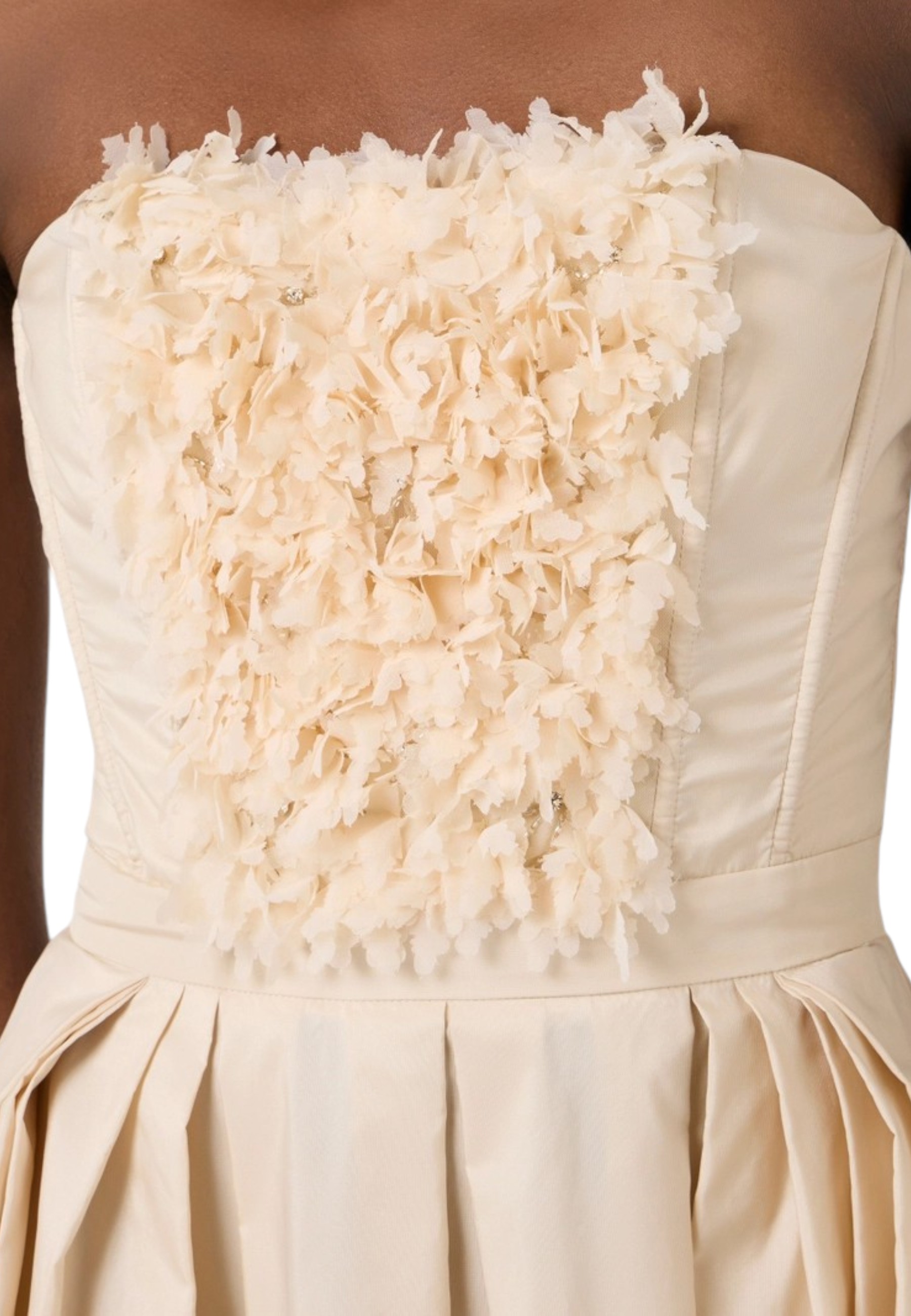 This off-the-shoulder design features a full skirt embellished with voluminous pleats that enhance the silhouette. The bodice is adorned with an embroidered panel featuring 3D petals, pearls and crystals that add a touch of sparkle. Regular fit.