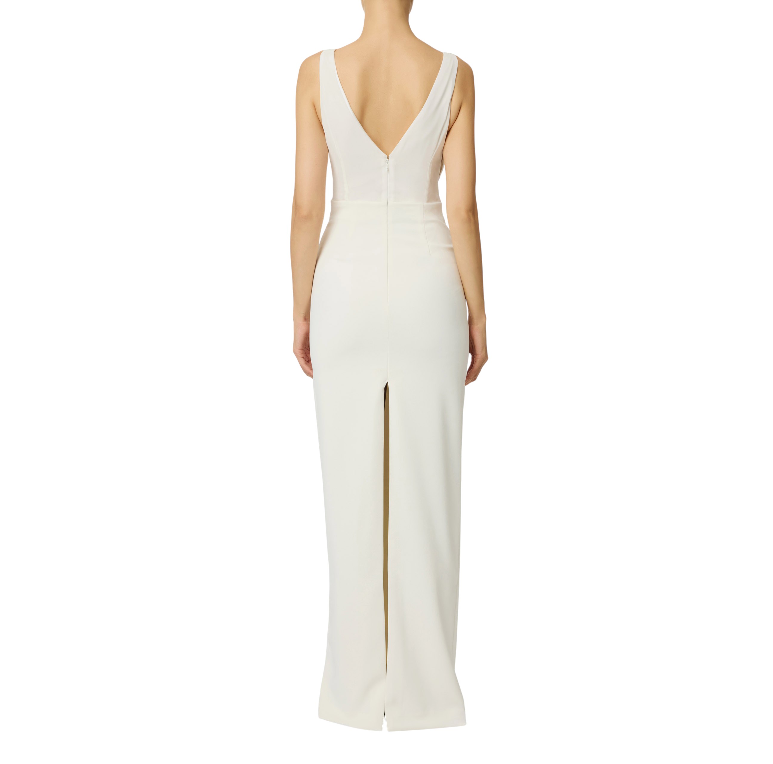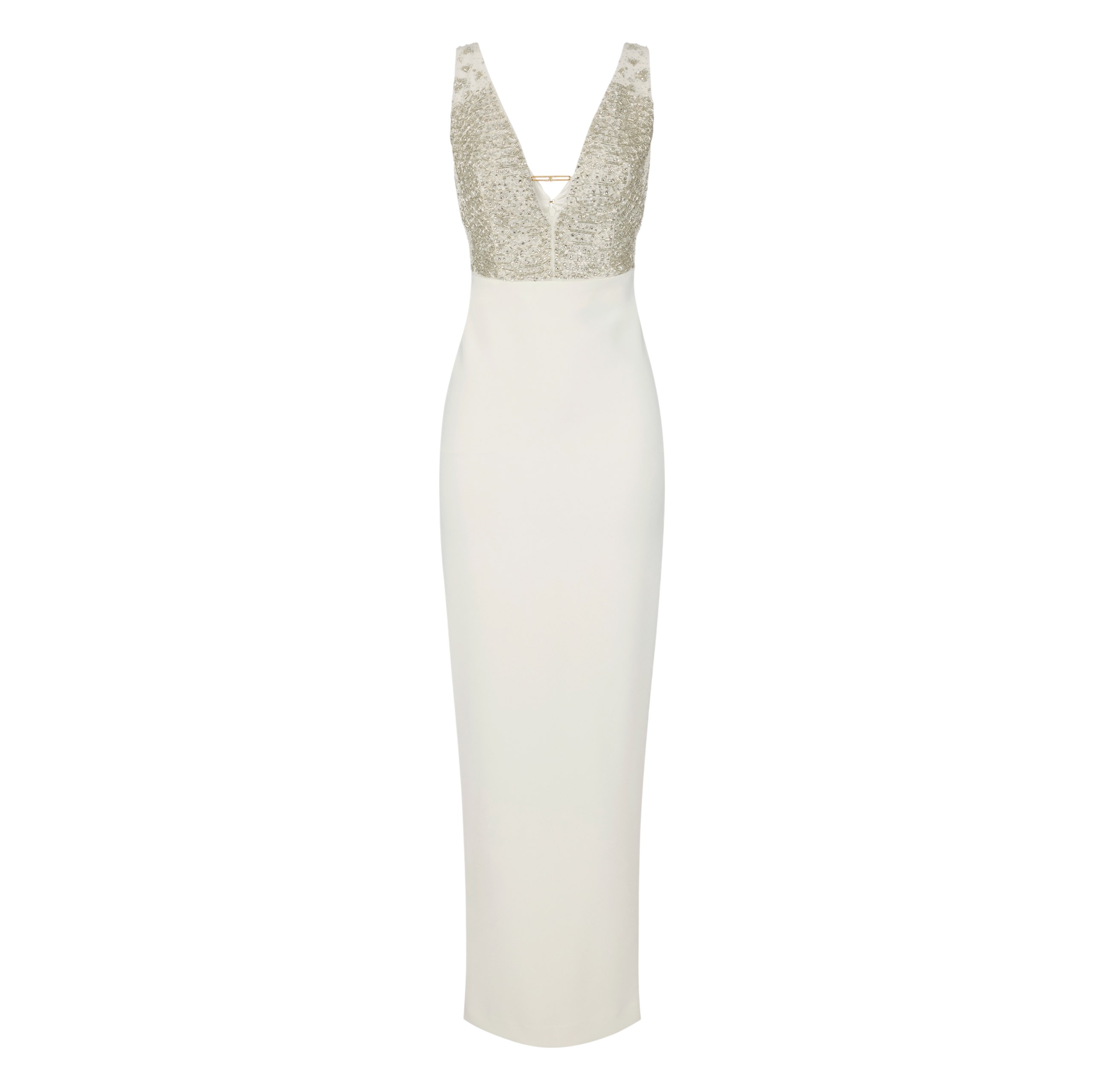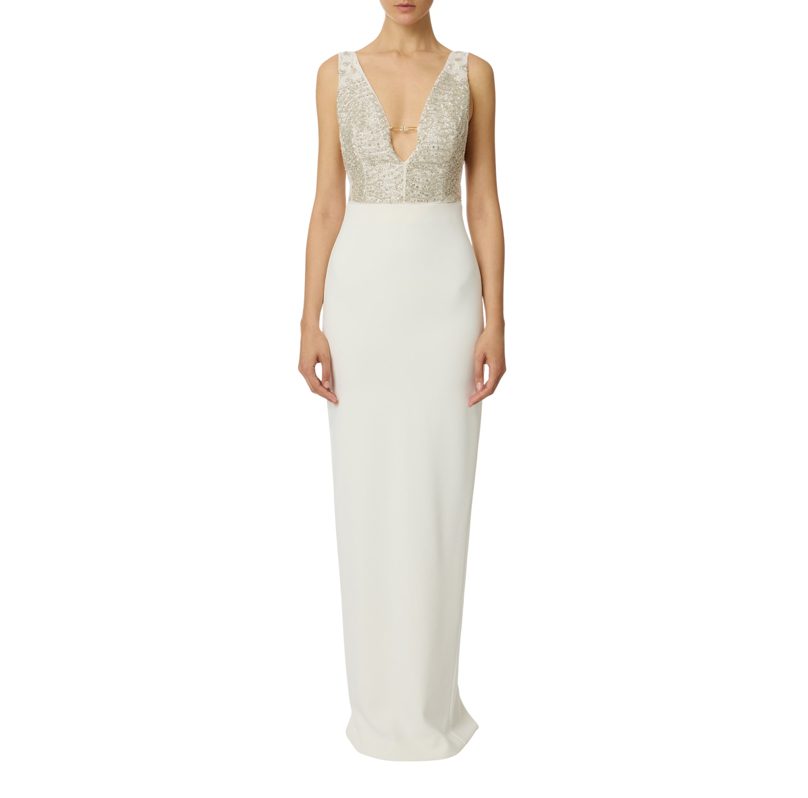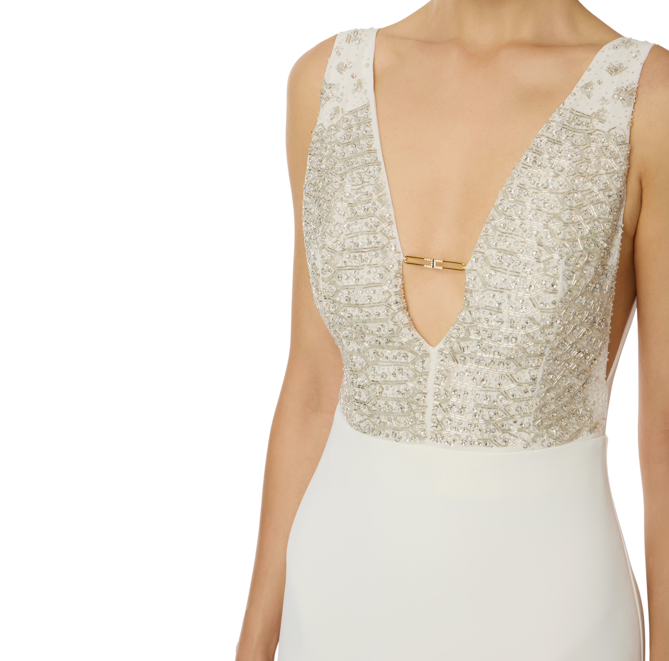 Slim-fit georgette evening dress. The sleeveless dress has a plunging neckline, embellished with a jewelled detail featuring the logo. The top is embellished with embroidered crystals that add sparkle, while the crepe skirt has a column silhouette and a deep side slit for a daring look.