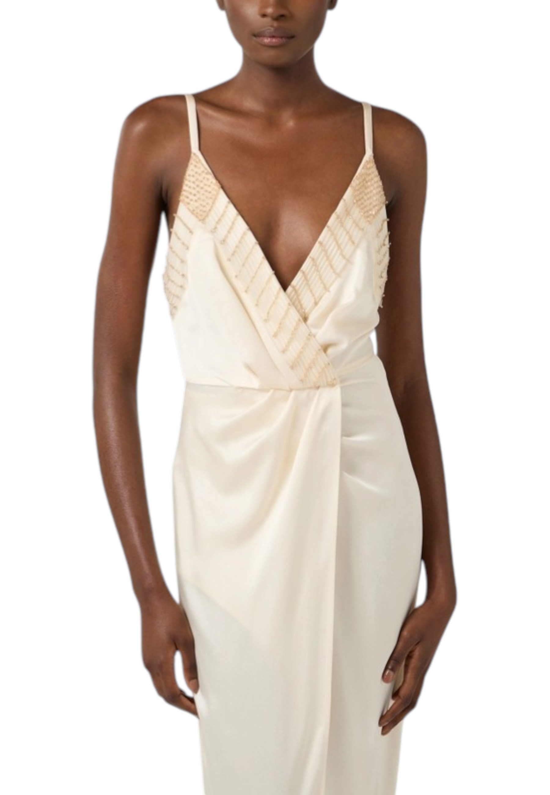Slim-fit satin evening dress. The dress has thin straps and stands out for its embroidered crystals on the neckline with geometric patterns, adding light and symmetry. The wrap-style skirt opens with a central slit.
