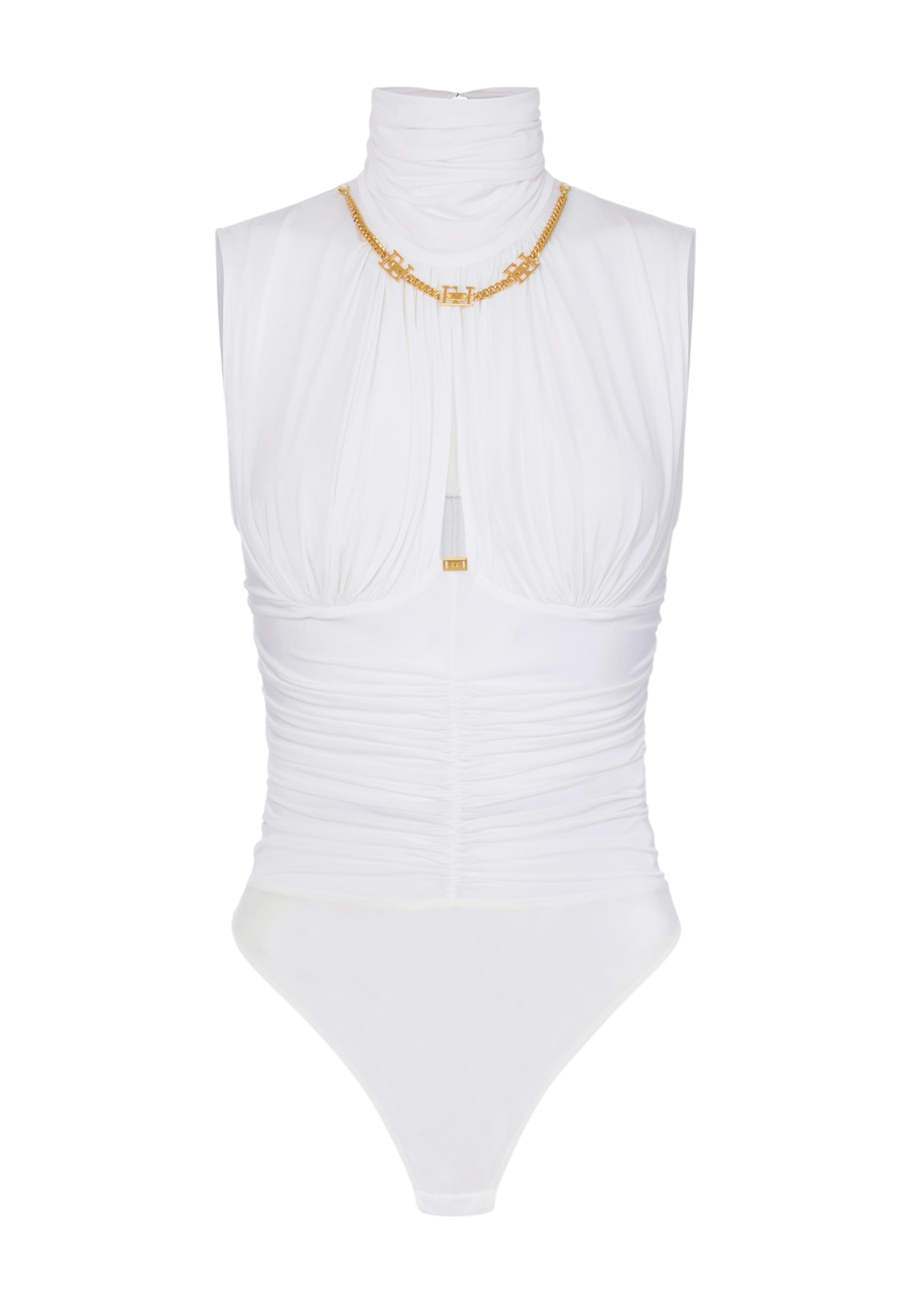 Lightweight crêpe jersey bodysuit, sleeveless with structured shoulders. The draping defines the silhouette with sophisticated volumes. The chain jewelled accessory frames the neck and adds sparkle with logo details. Close fit.