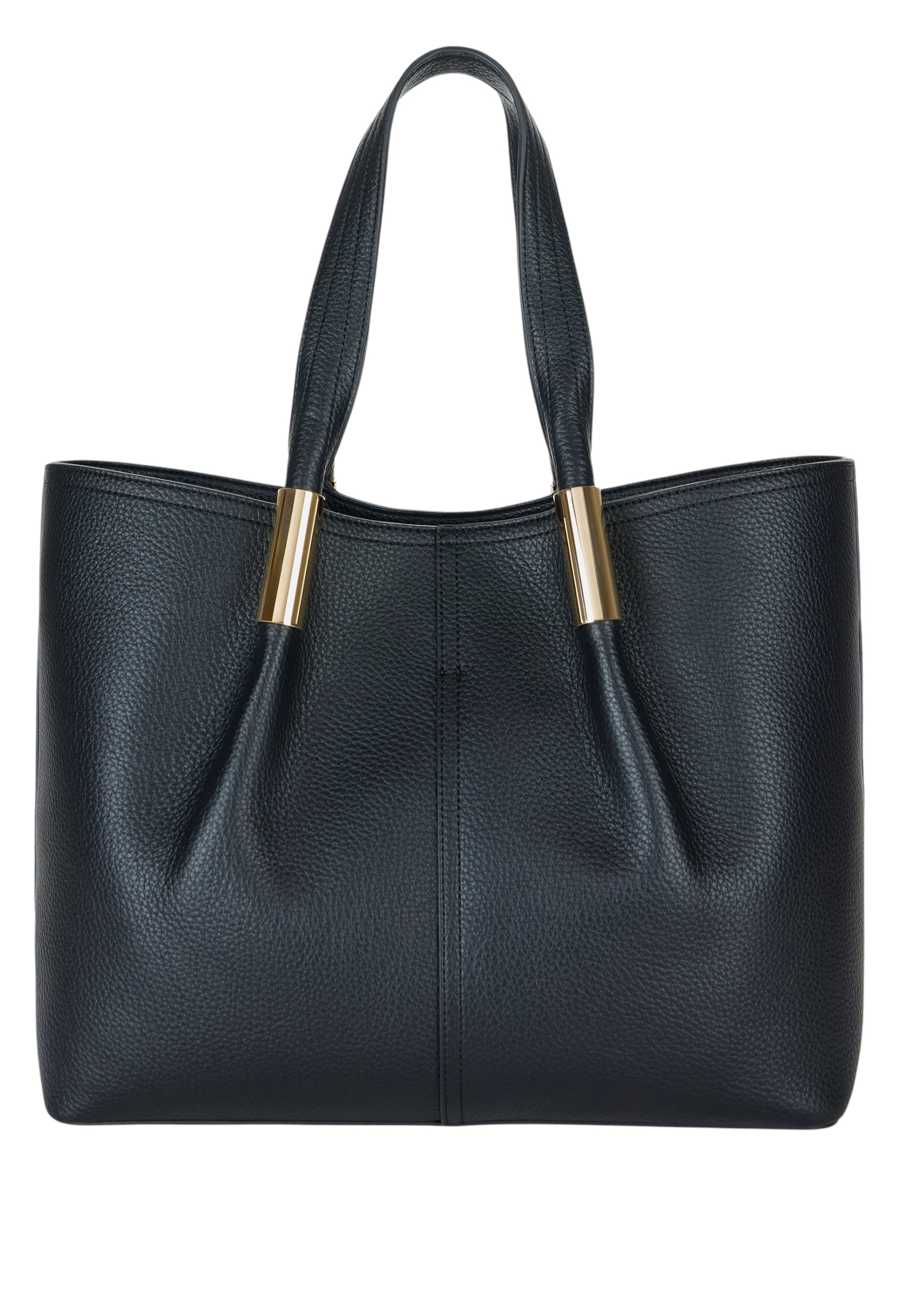 Large tote bag in synthetic leather-like material. With a minimalist and elegant shape, it is embellished with gold-tone metal logo details. Logo on the bottom.