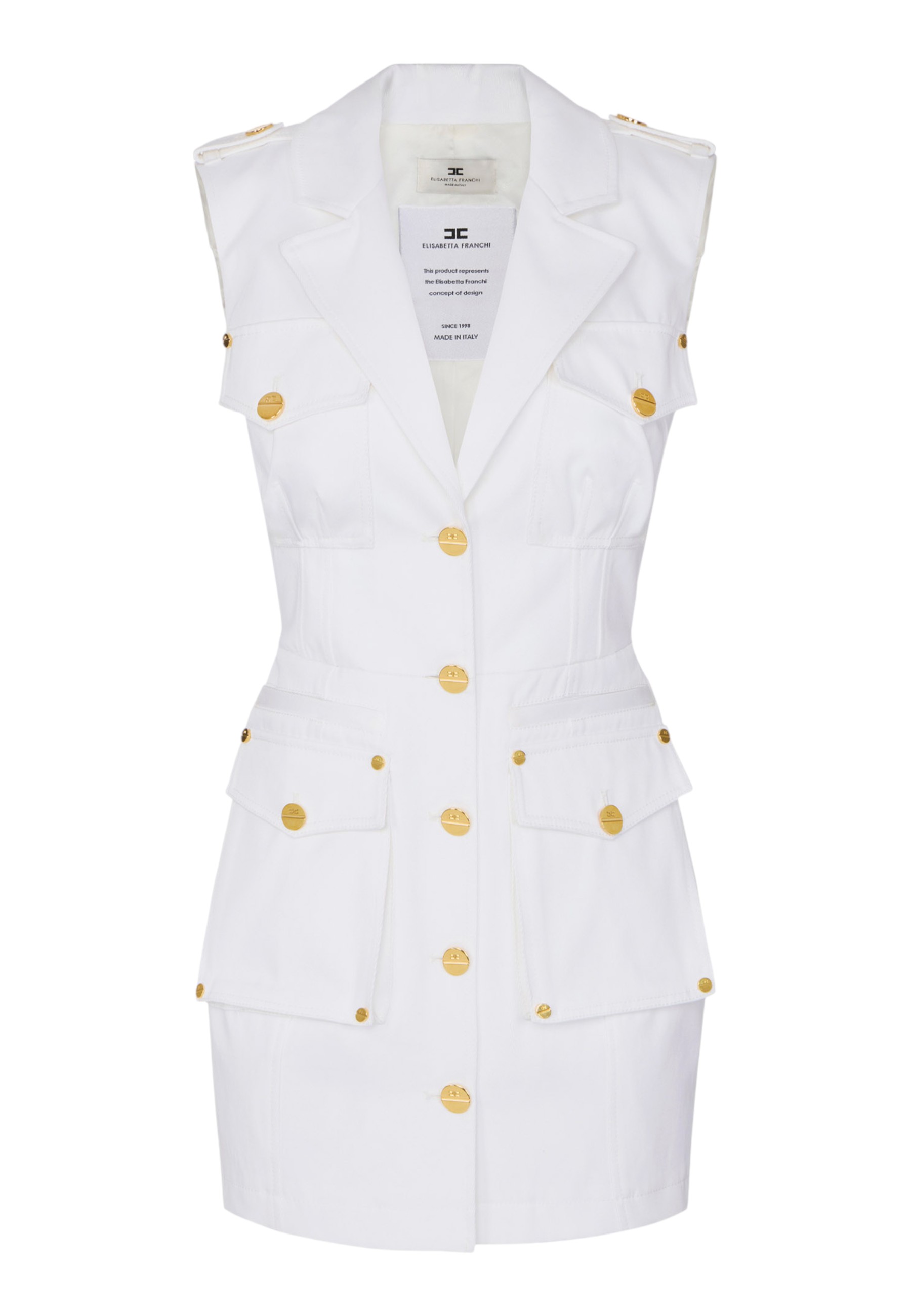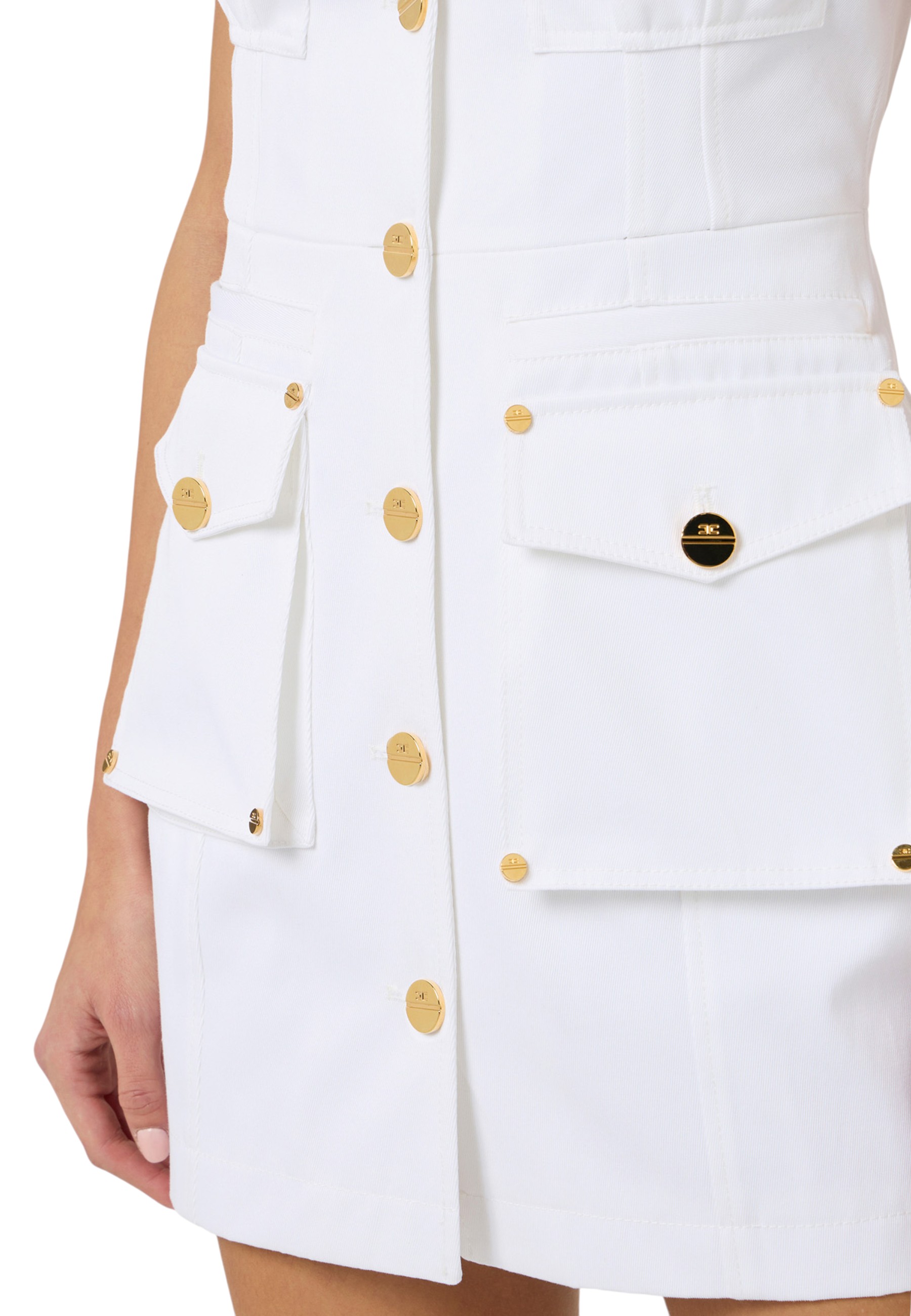 Regular fit cotton gabardine dress. The dress is sleeveless and has structured shoulders with toggles. It stands out for its lapel collar and large flap pockets on the top and skirt. Gold metal buttons with logo add a touch of sparkle.