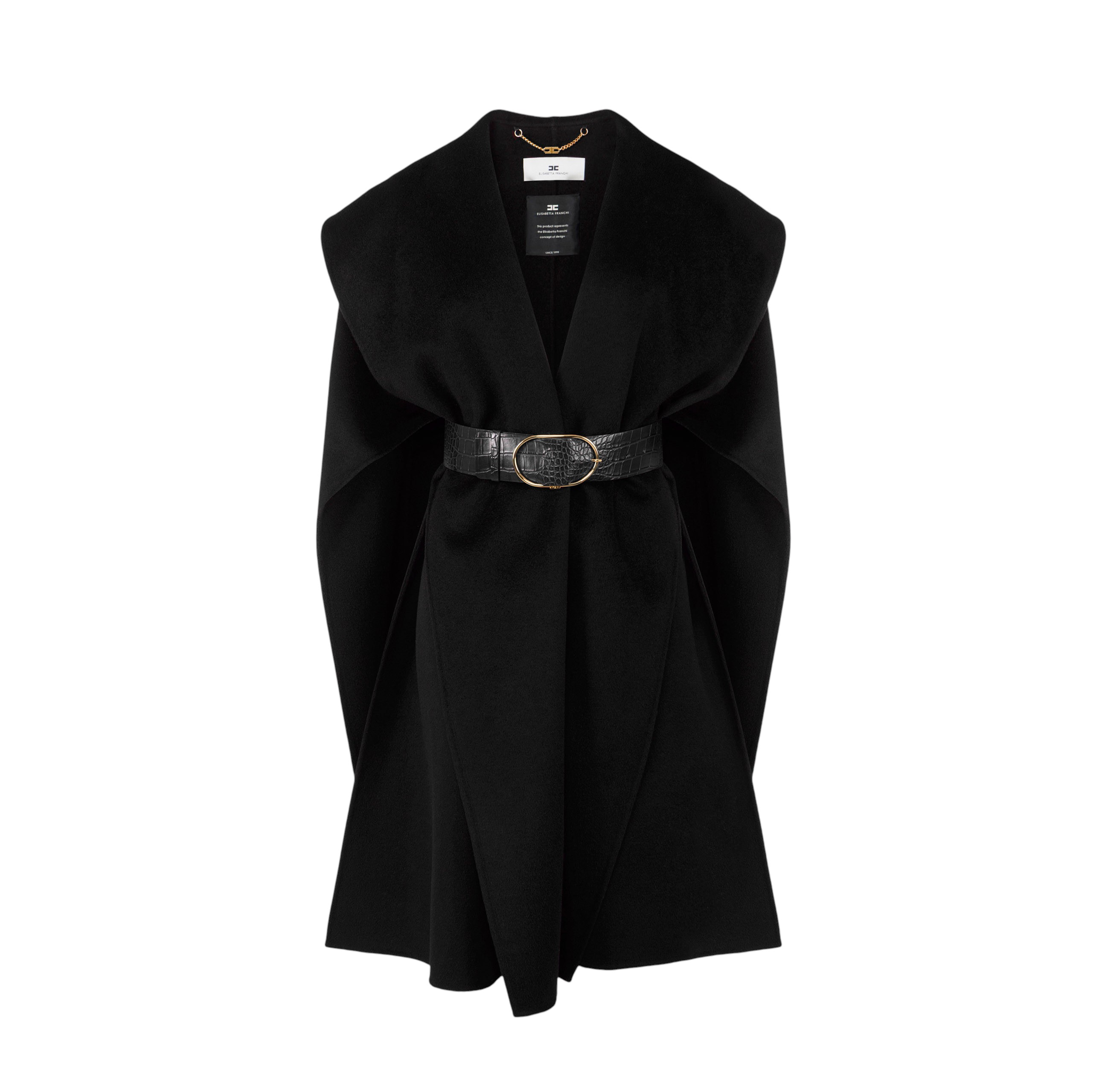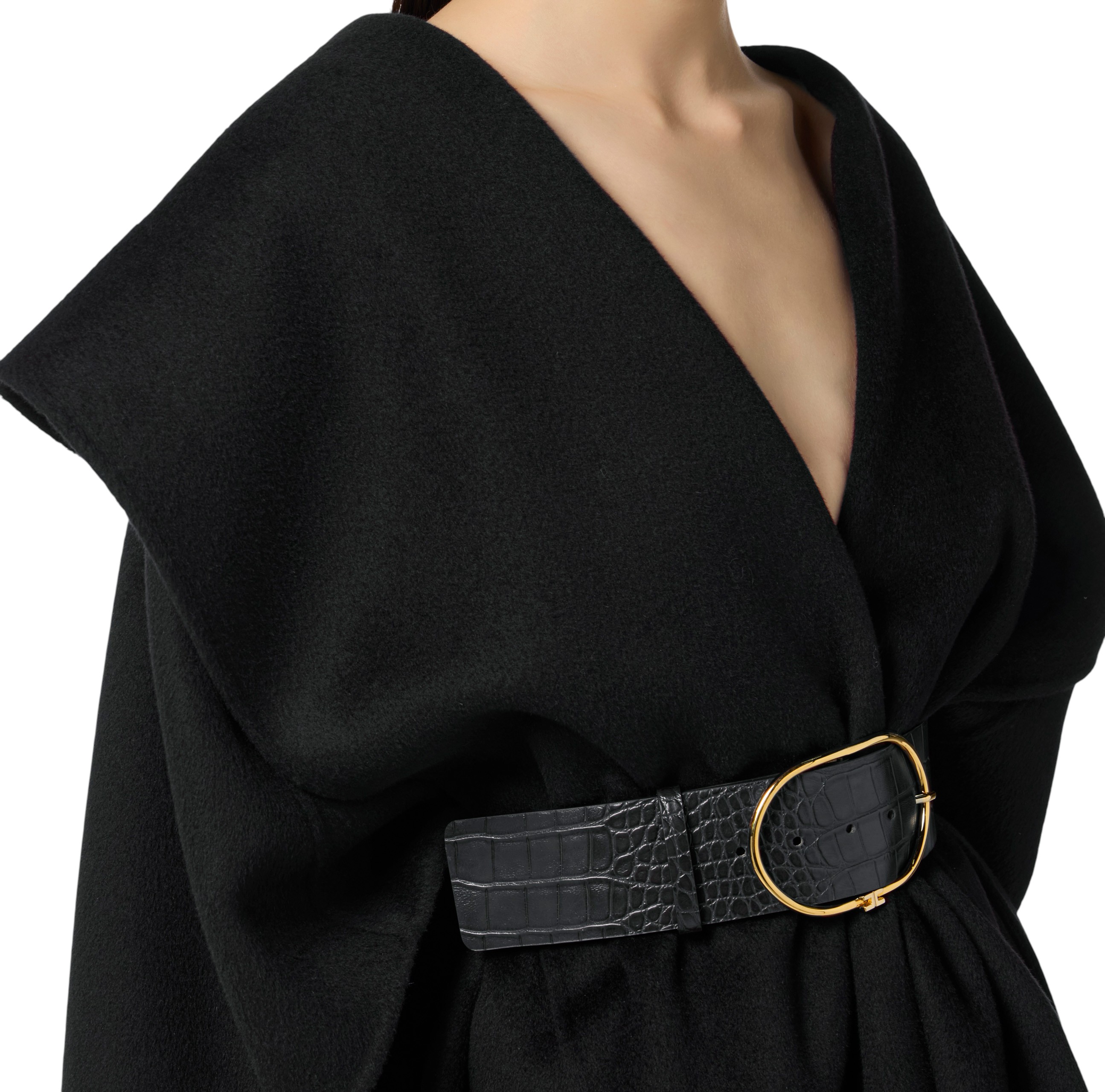 Unlined double wool cloth cape with an oversized fit. The enveloping volumes are defined by the high, matching belt with a crocodile print texture that adds character and is completed by a pin buckle with a gold metal logo.