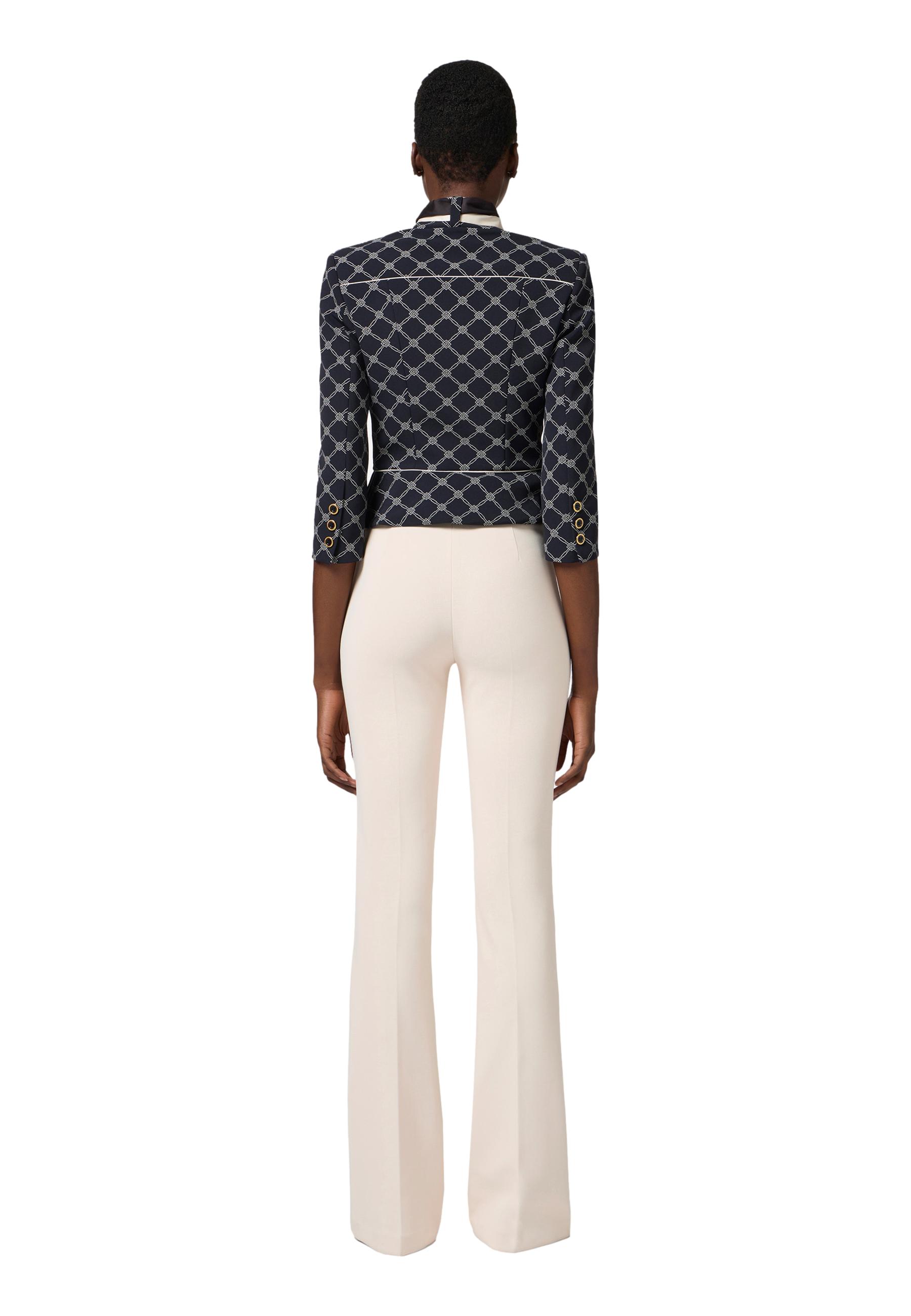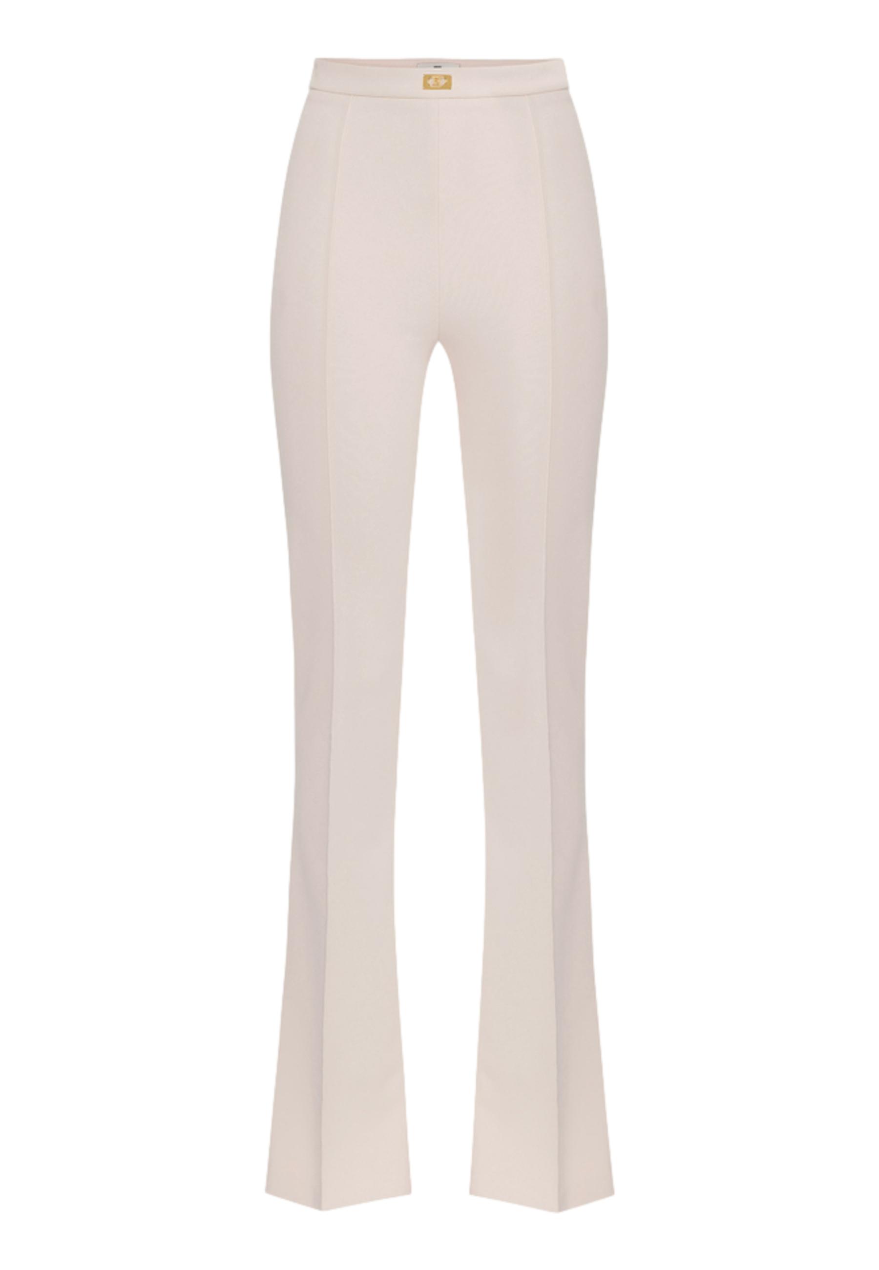 Stretch crepe flared trousers with fitted fit and flared leg at the bottom. The gold-coloured metal logo plaque on the waistband brightens up the garment. Part of the Essential collection, to build the perfect wardrobe.