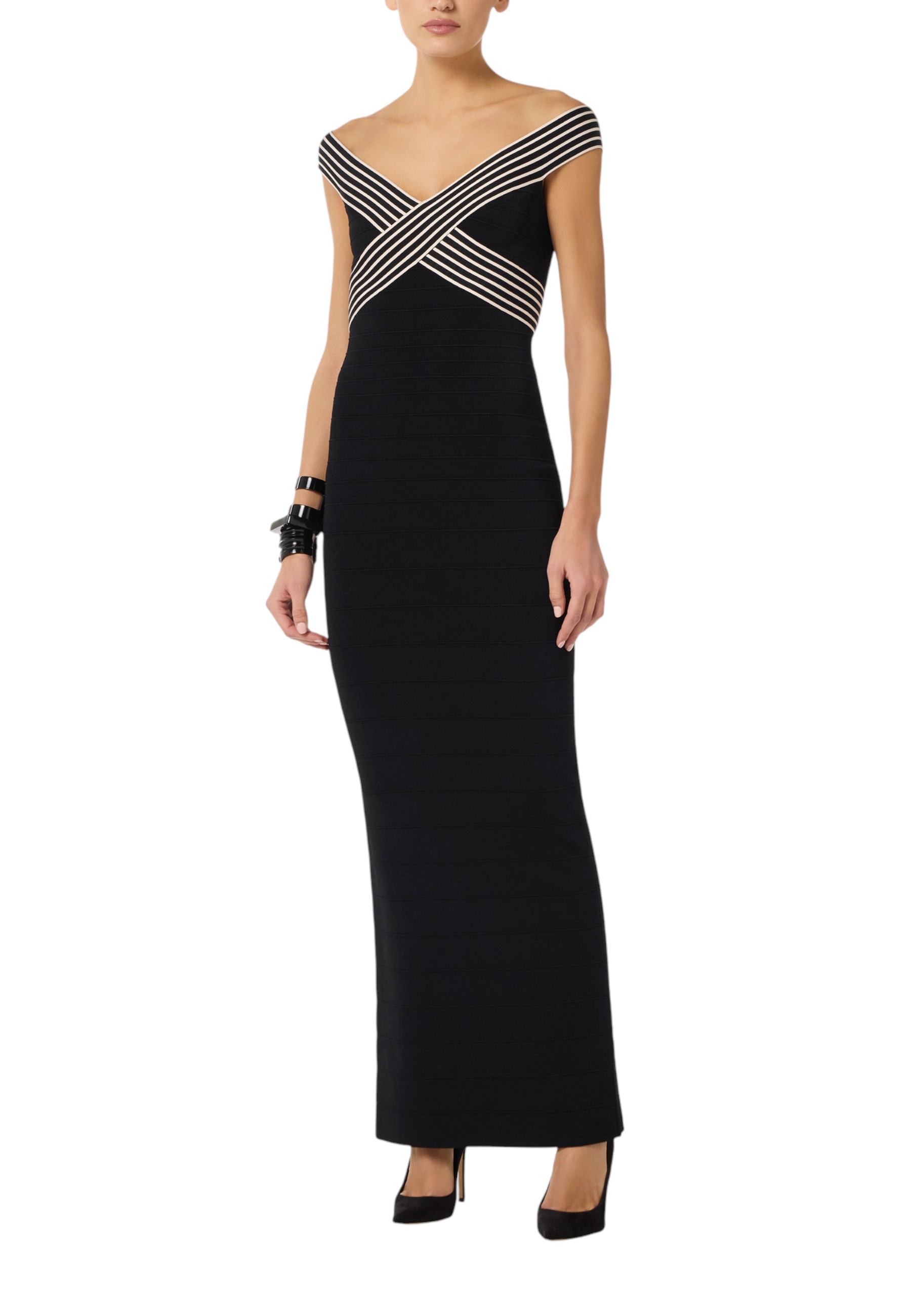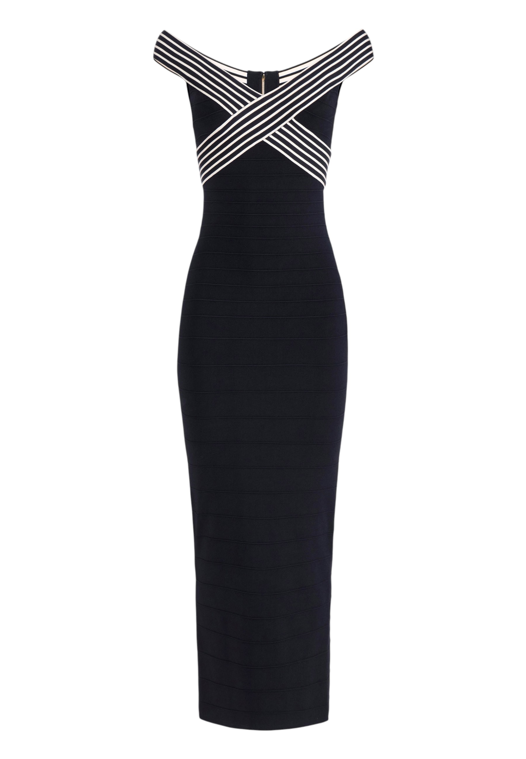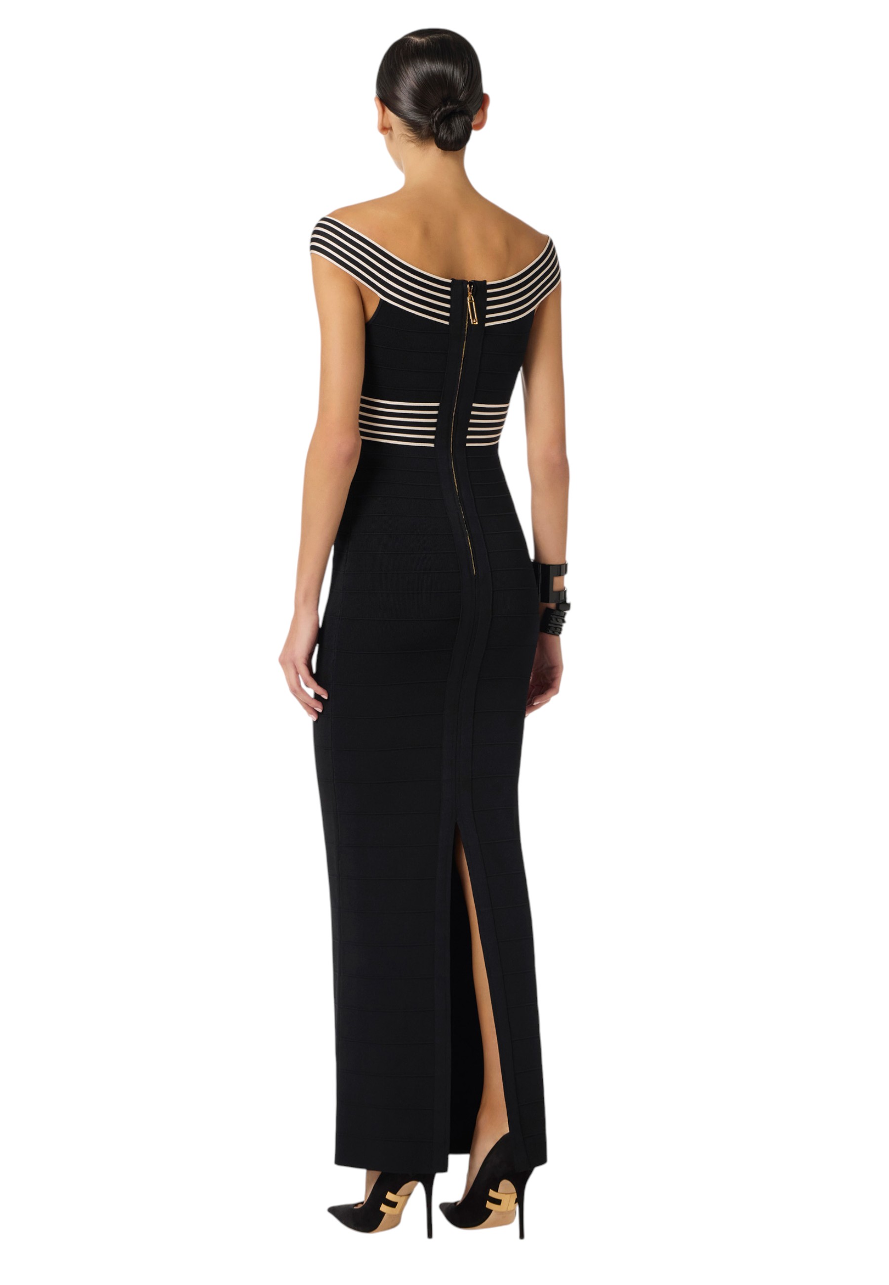 Long knitted dress with a fitted silhouette. The dress stands out for its decorative bands that frame the bust with contrasting stripes. The ribbed texture and horizontal ribbing create a vibrant pattern. The slit at the back enhances the geometric silhouette of the garment.