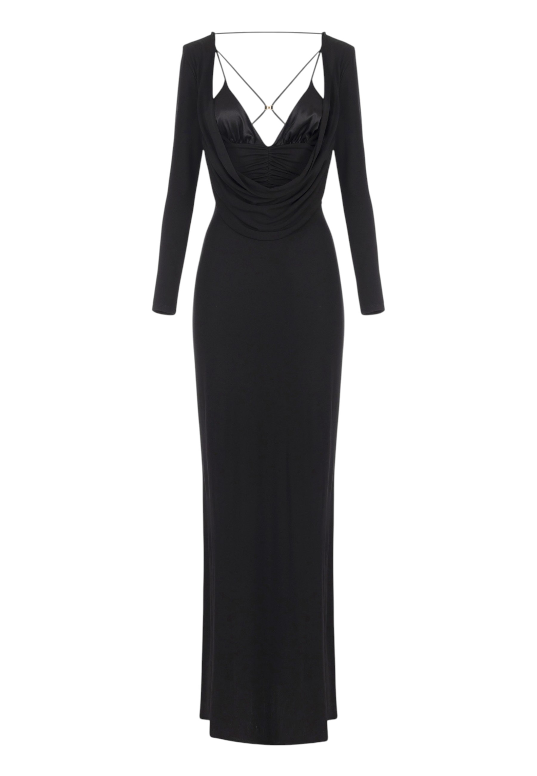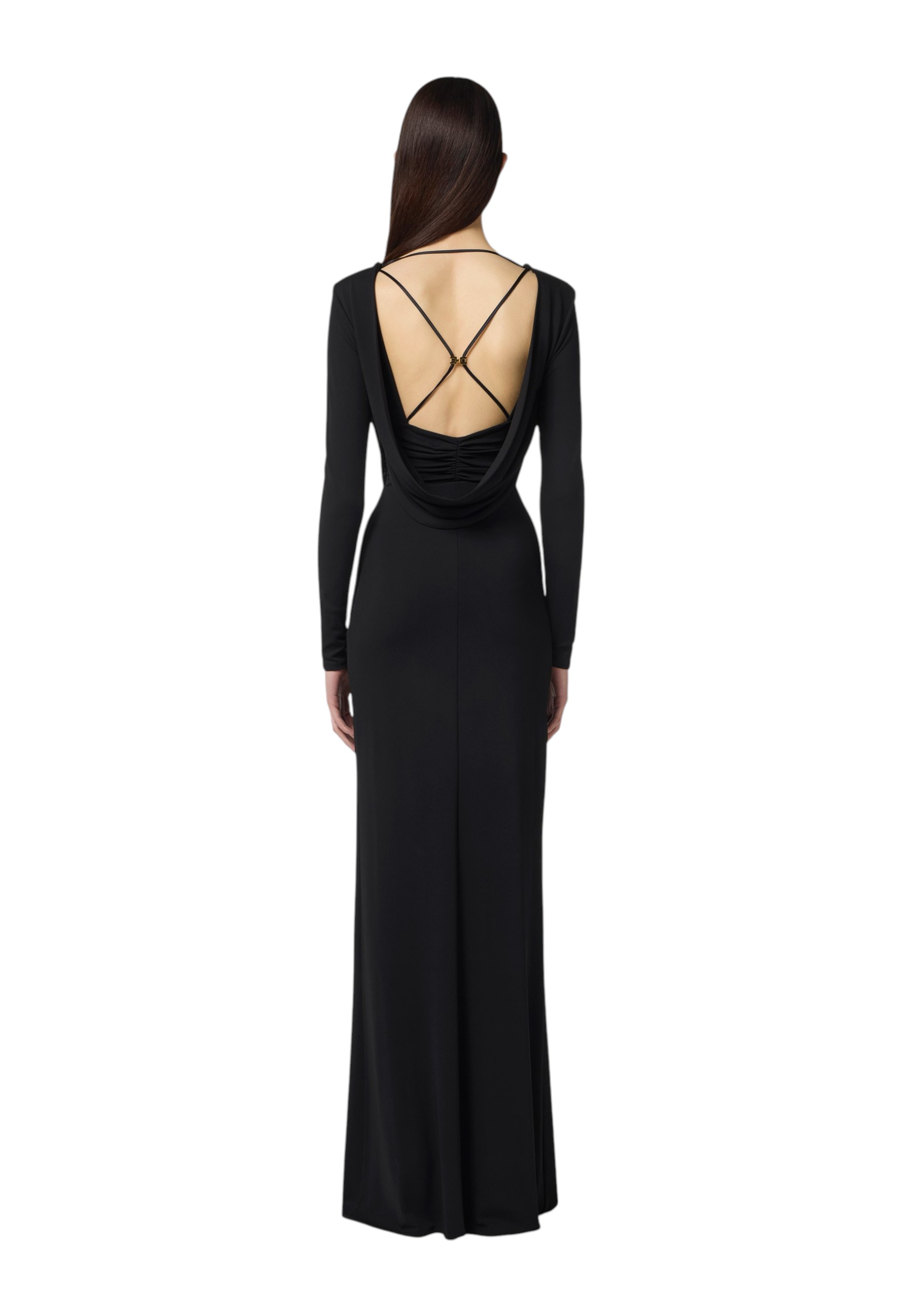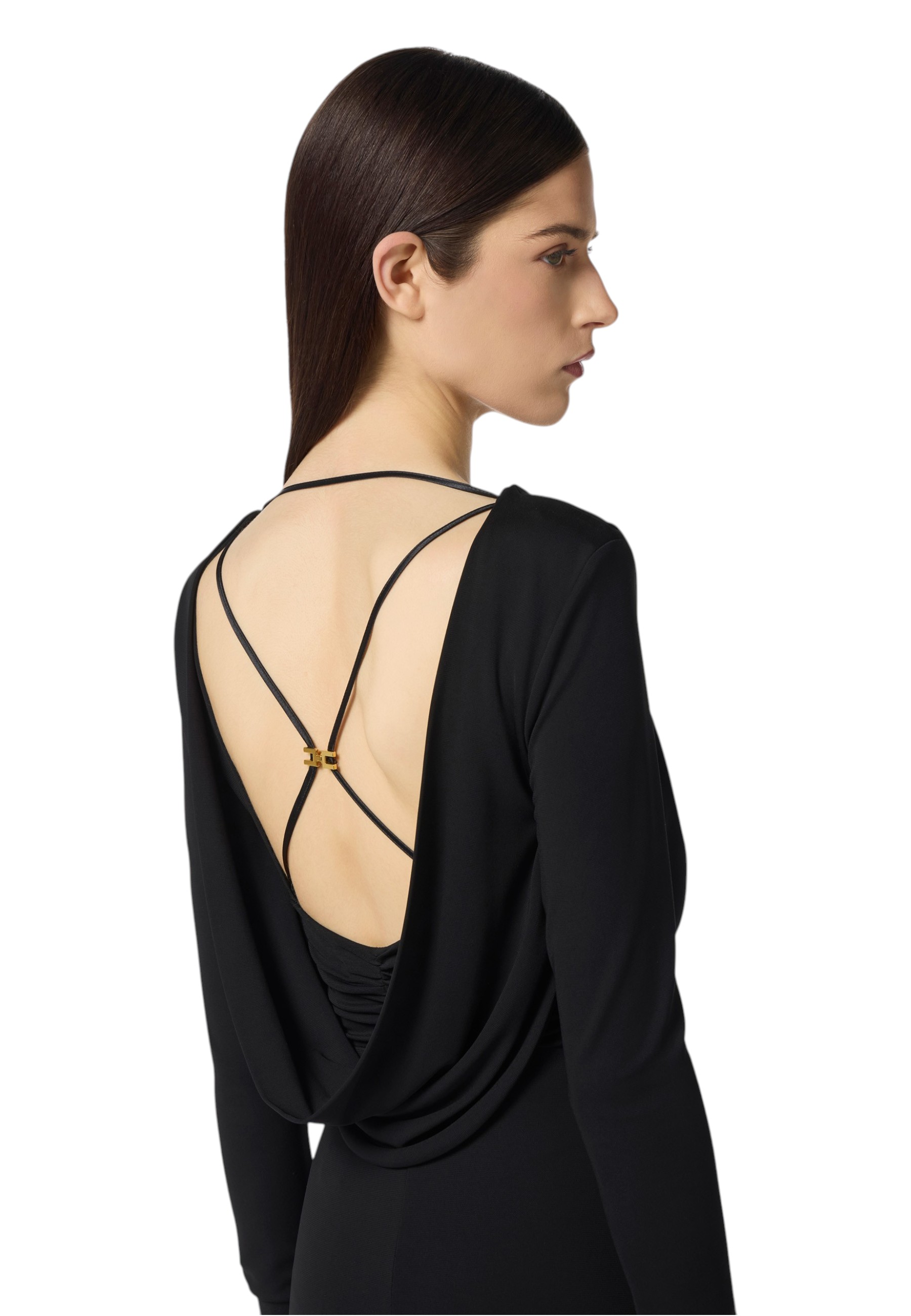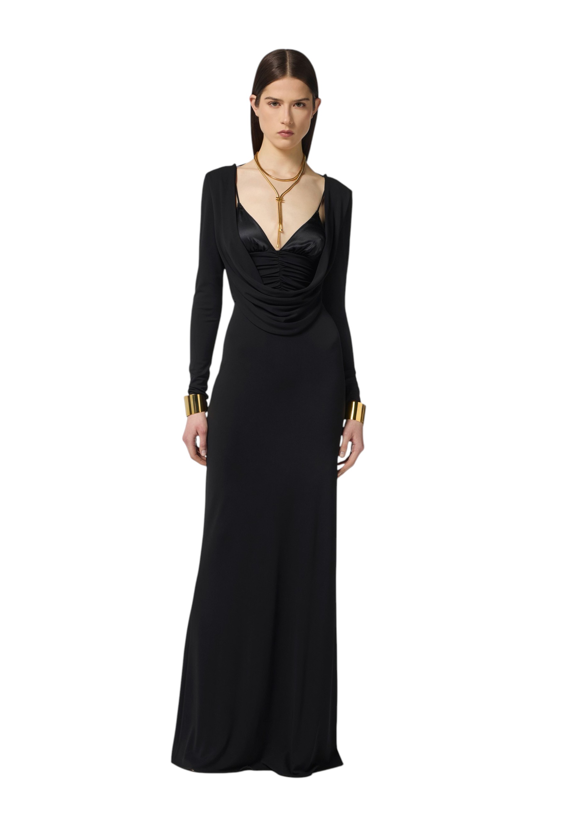 Evening dress in fluid crêpe jersey. The dress stands out for its wide draped neckline that frames a satin triangle bra. The back reveals the back and is defined by straps held in place with logo detailing.