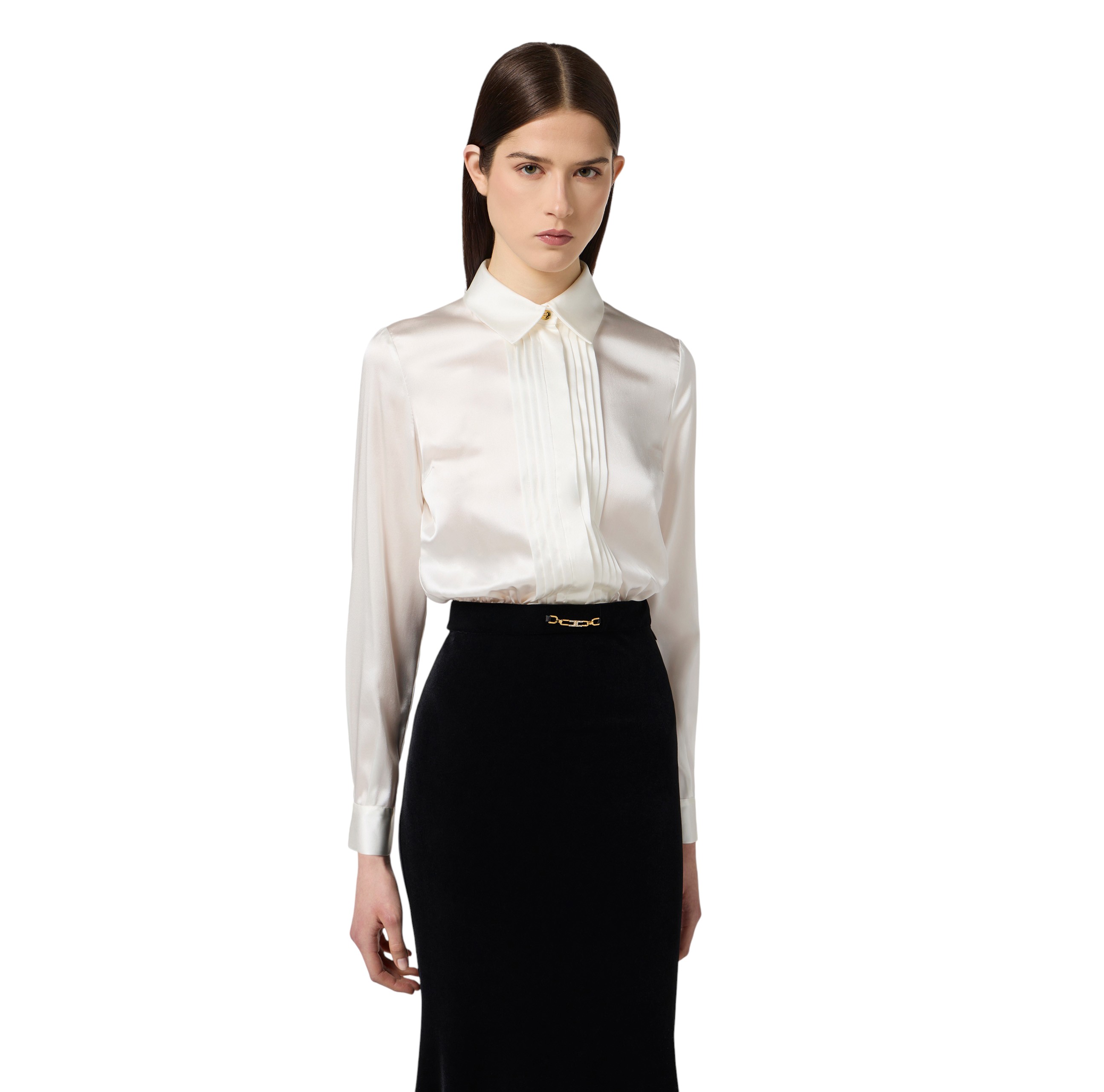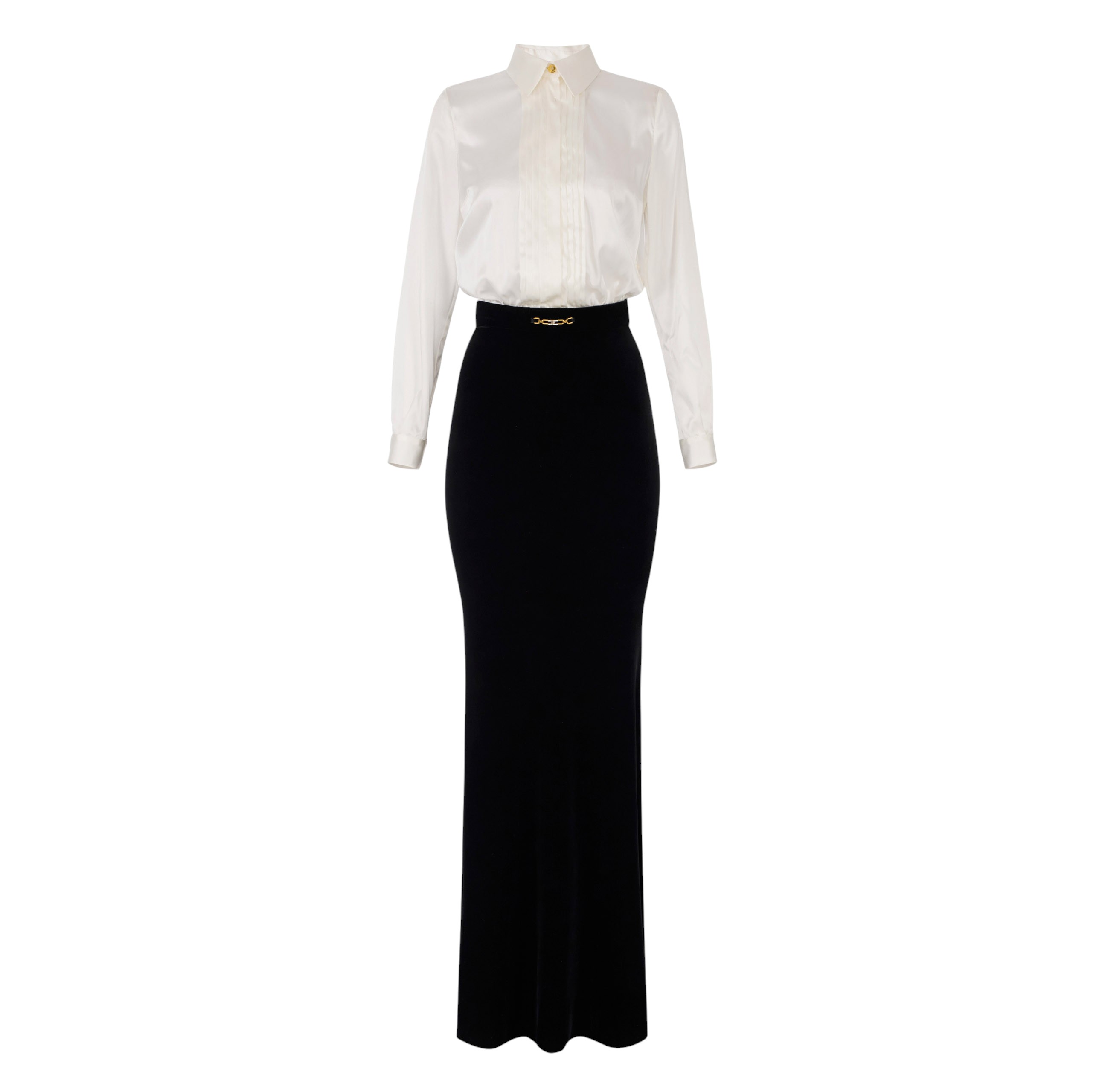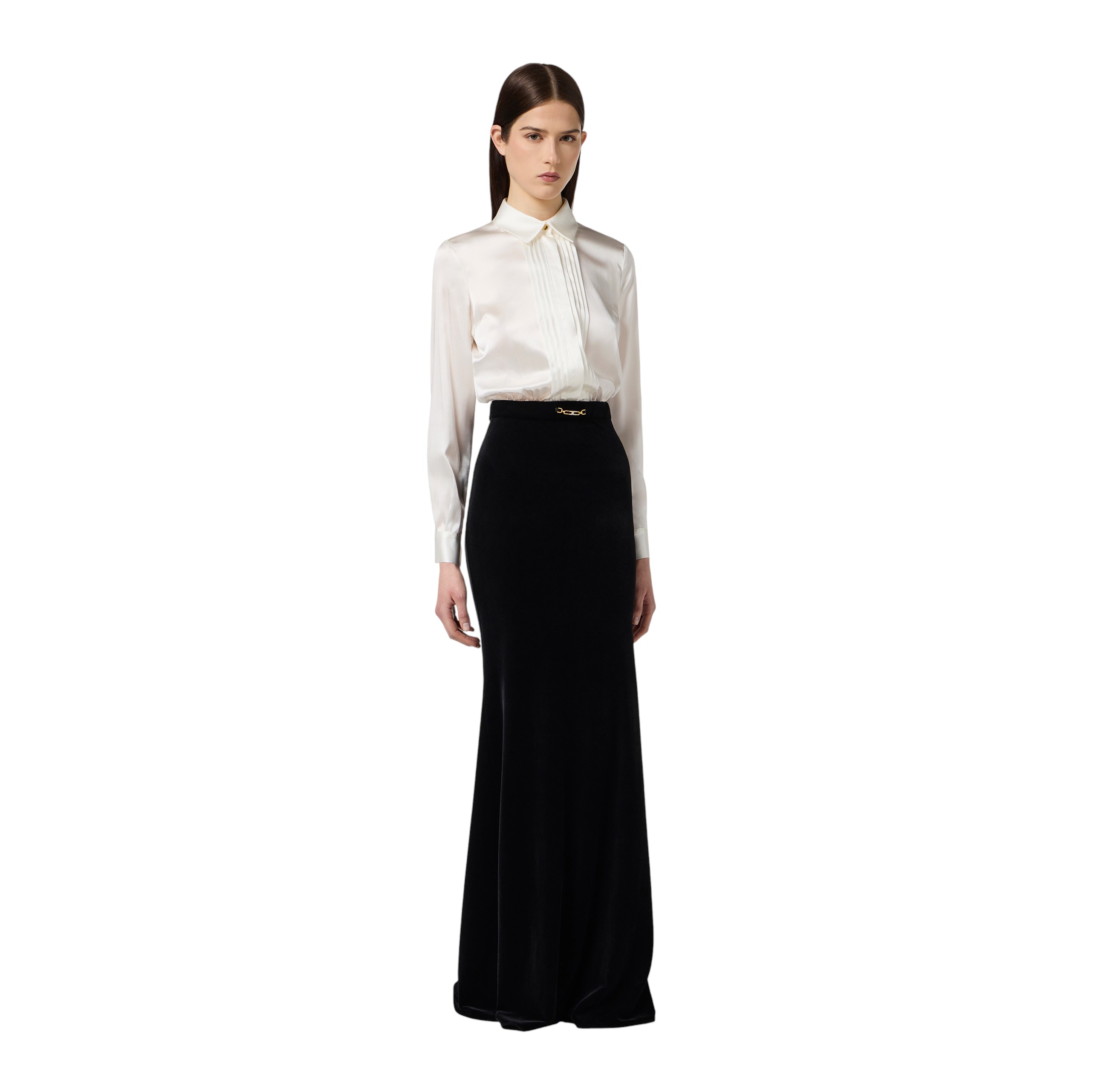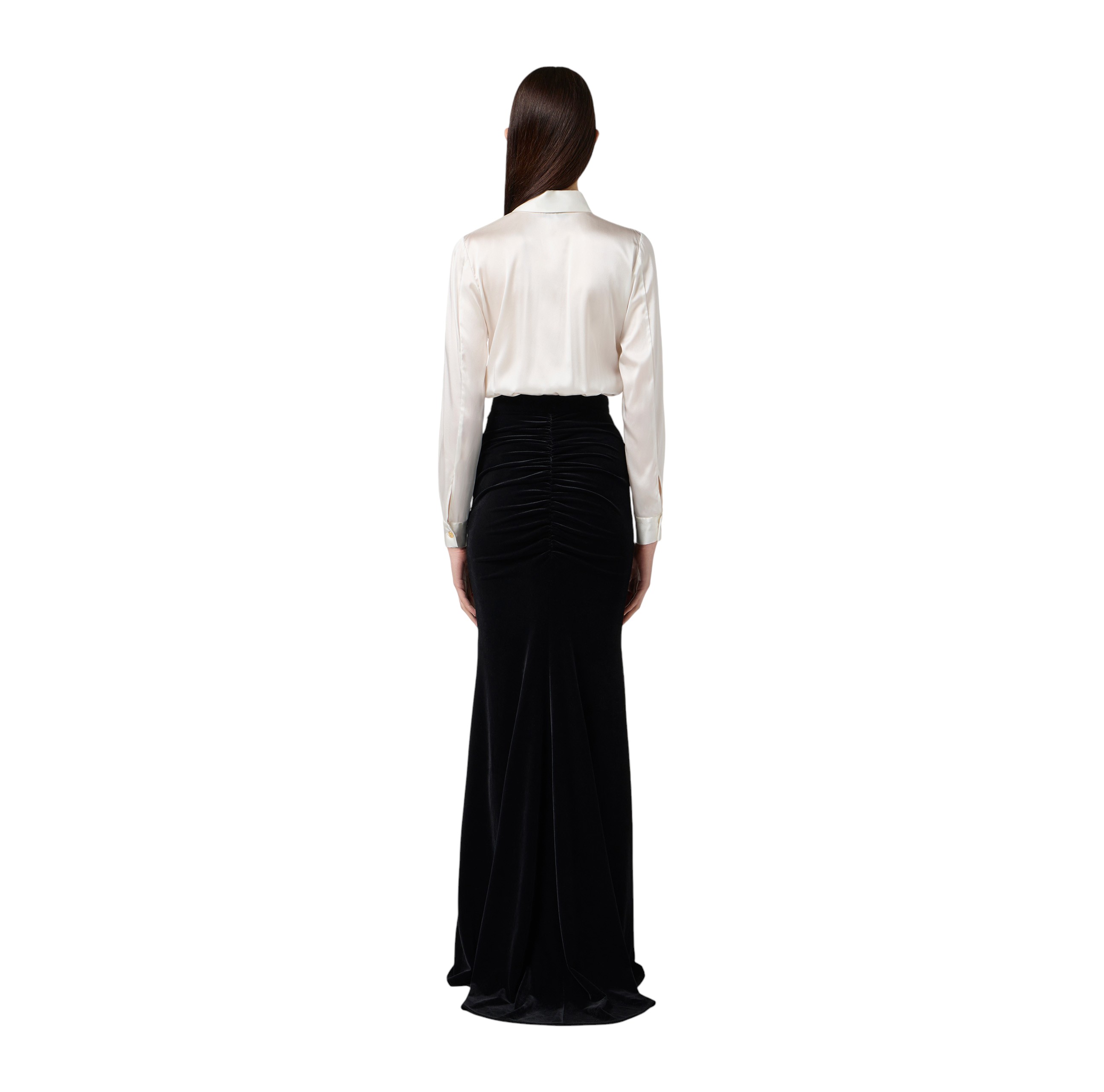 Slim-fit evening dress. The garment consists of a removable shirt made of satin with a plastron framing the closure. The velvet skirt has a mermaid line and reveals a gathered pattern at the back to create movement. Jewelled detail with logo to illuminate the waistline.
