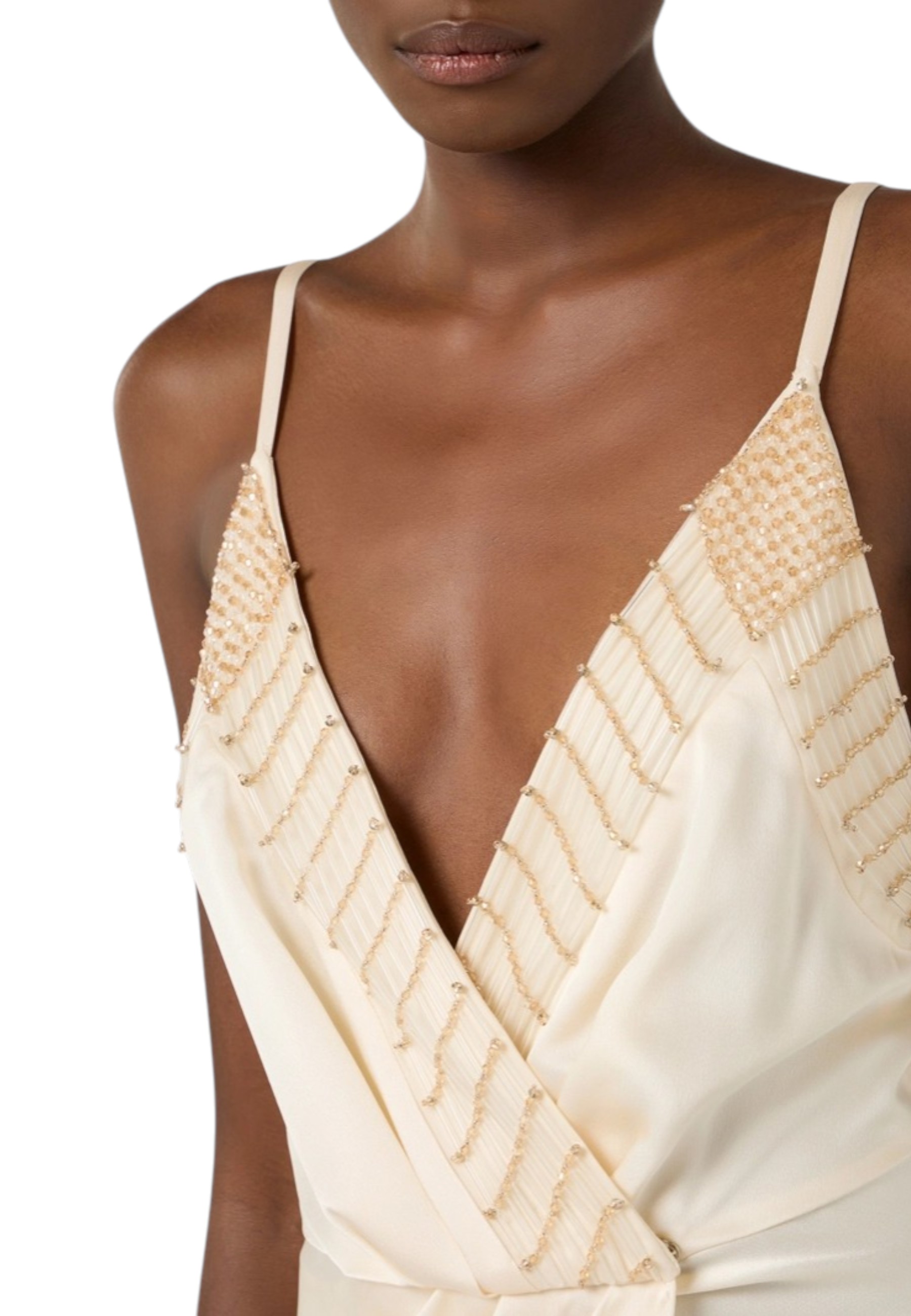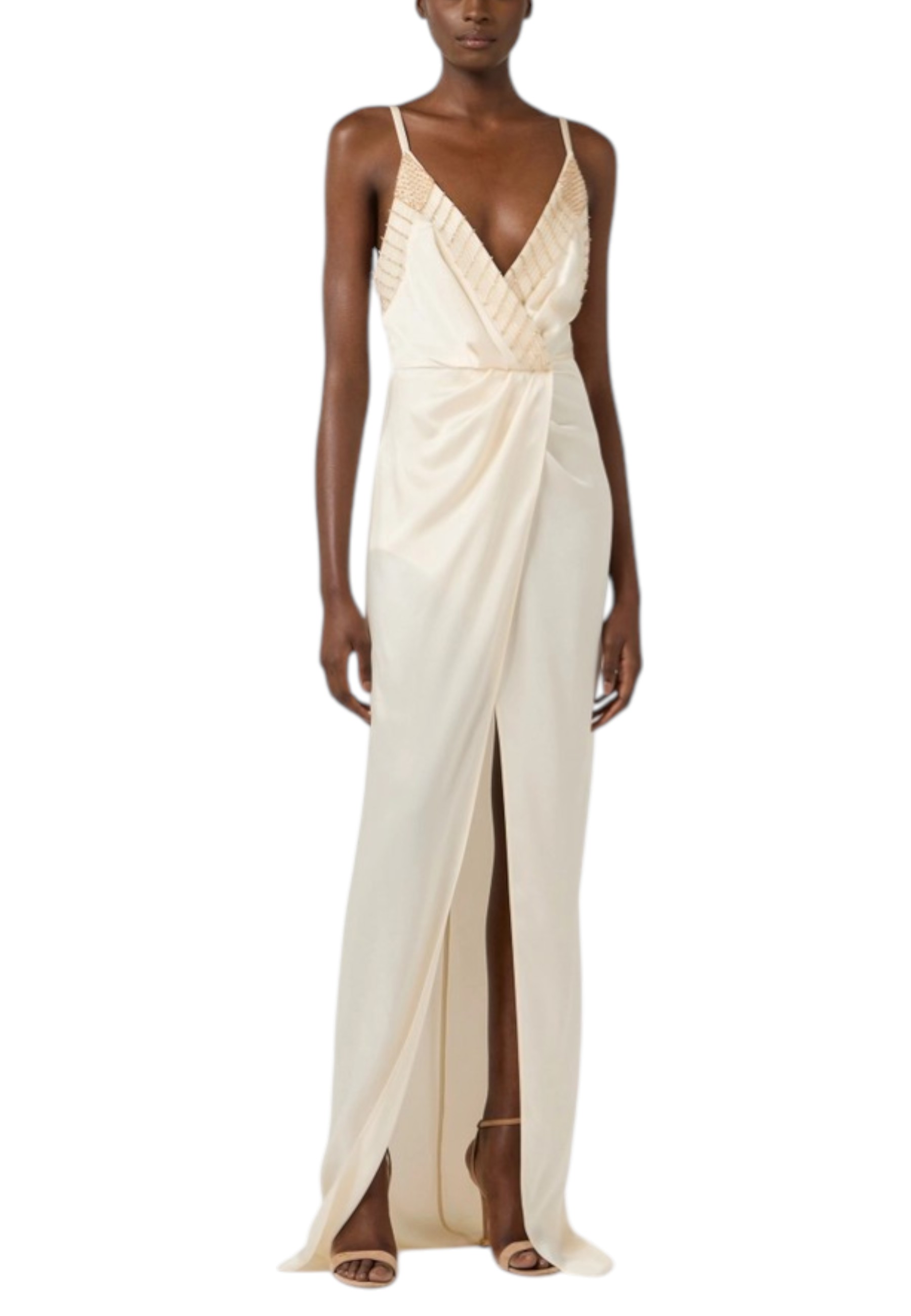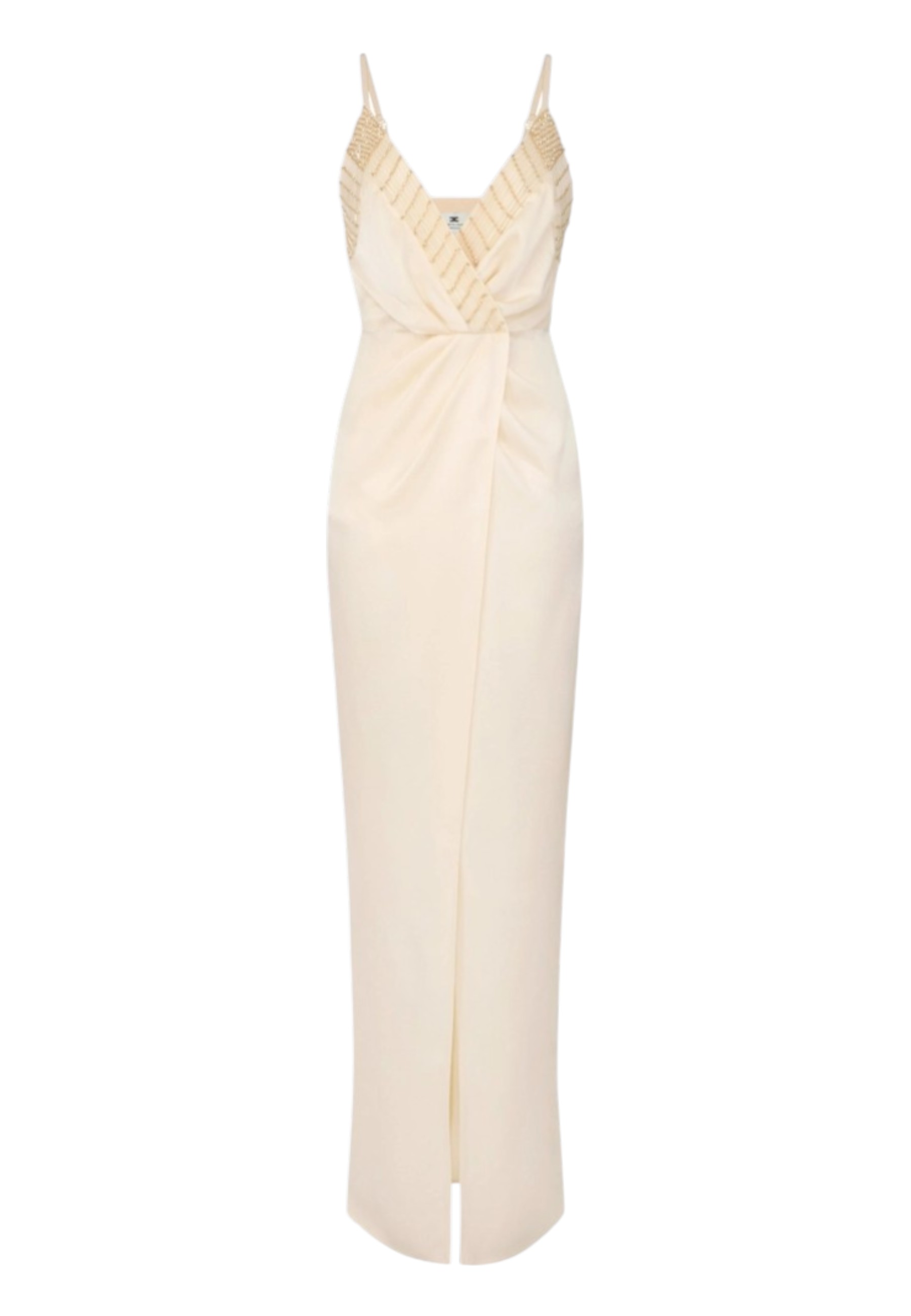 Slim-fit satin evening dress. The dress has thin straps and stands out for its embroidered crystals on the neckline with geometric patterns, adding light and symmetry. The wrap-style skirt opens with a central slit.