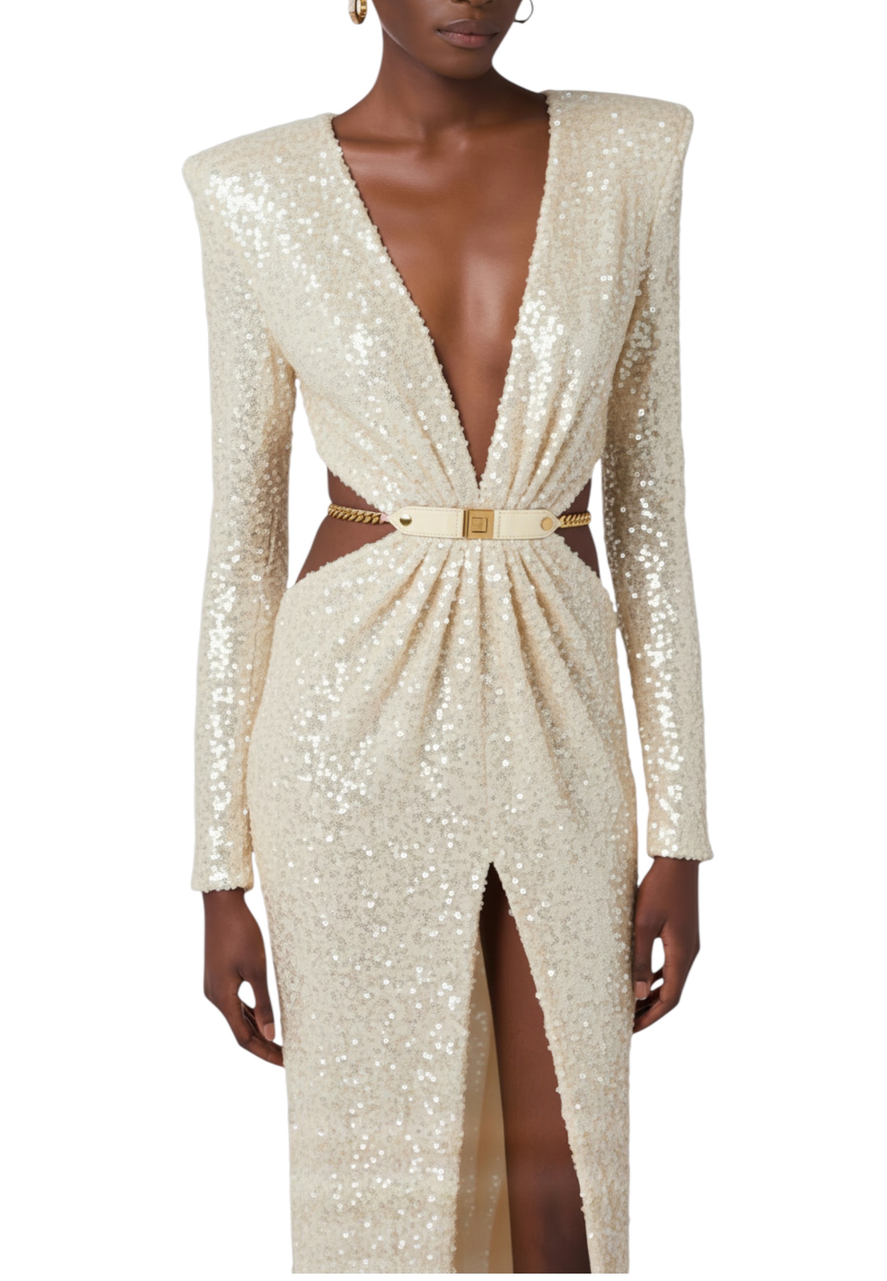 Full sequinned evening dress for a dazzling look. The dress has structured shoulders, long sleeves and open sides. The groumette chain jewelled belt has a logo plaque and enhances the central draping. Skirt with front slit. Close fit.