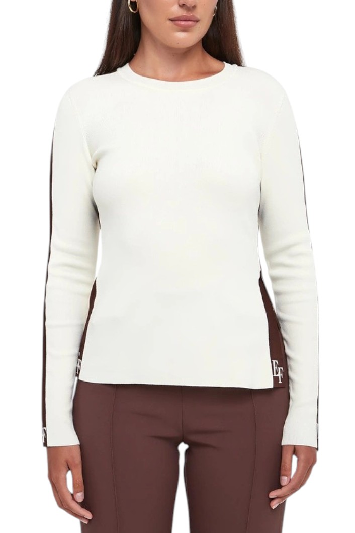 Fitted viscose knit. Featuring a crew neck and long sleeves, it is embellished with shiny viscose bands for an elegant contrast of textures. With inlaid logos in contrasting colours for a graphic look, it has a side slit that reveals a final logo detail.