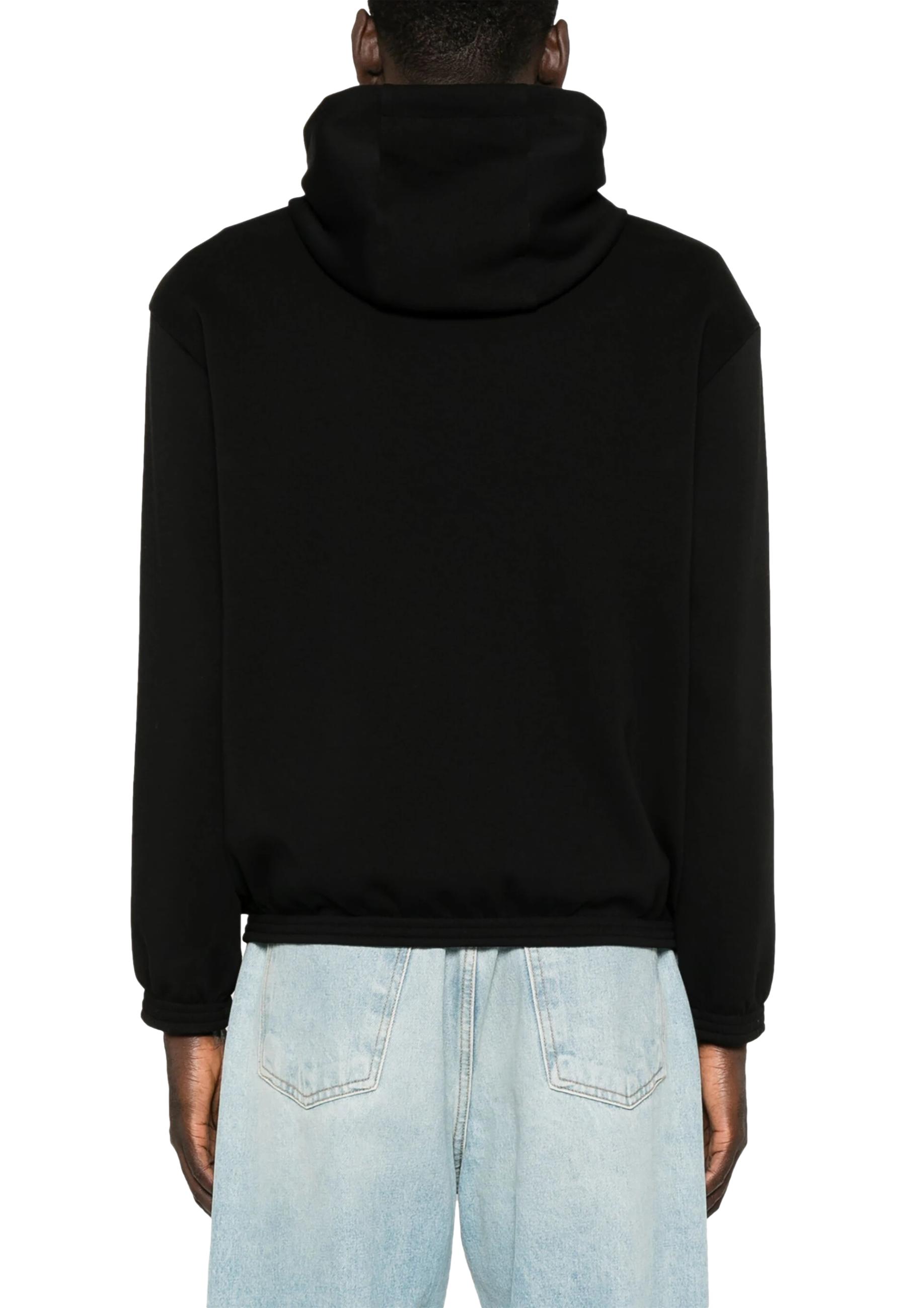 Regular fit sweatshirt with drawstring hood and zip fastening. A garment characterised by its reversibility: the outer side is softly textured in plain double jersey, while the nylon inner side is embellished with thick jacquard lettering. A versatile and sophisticated garment that goes with every occasion.