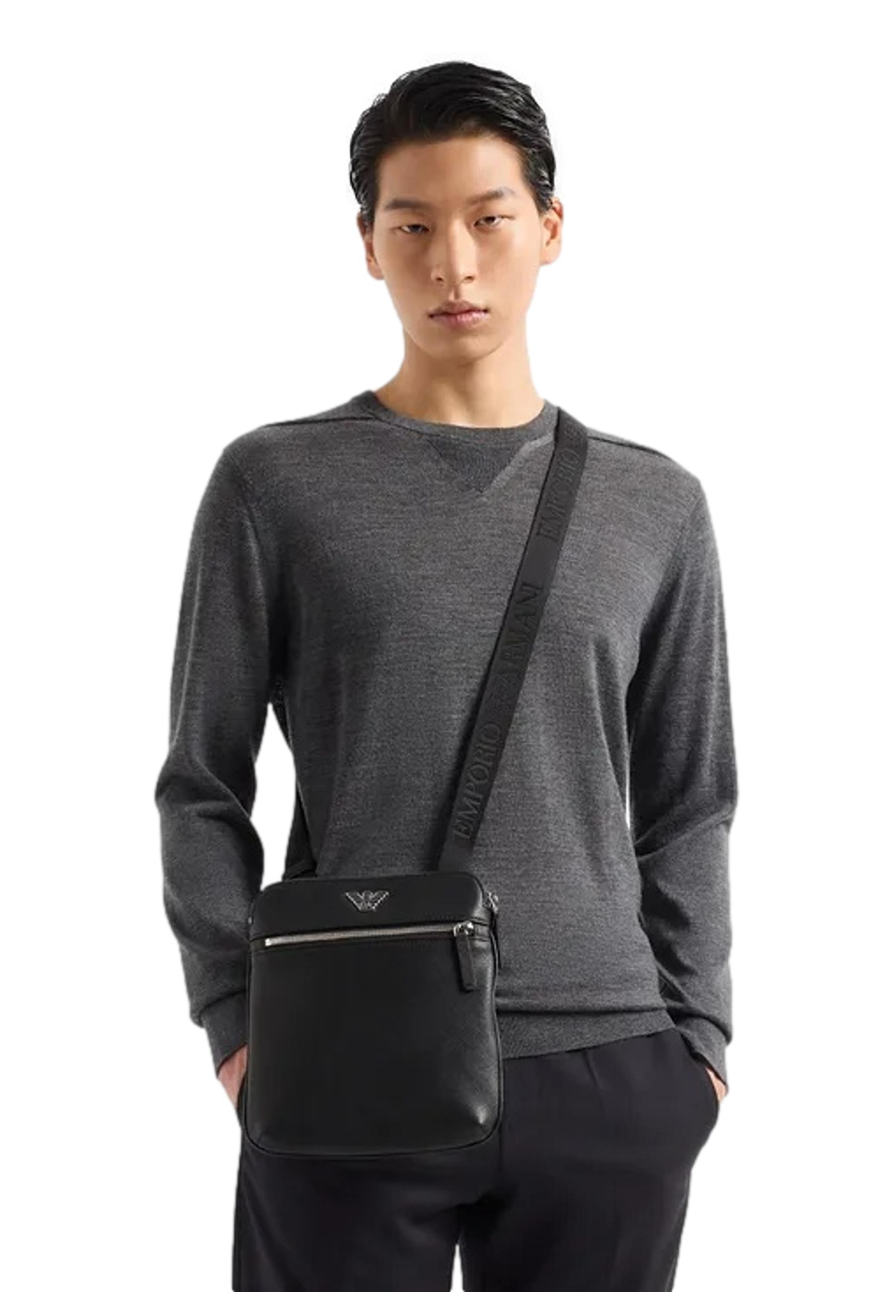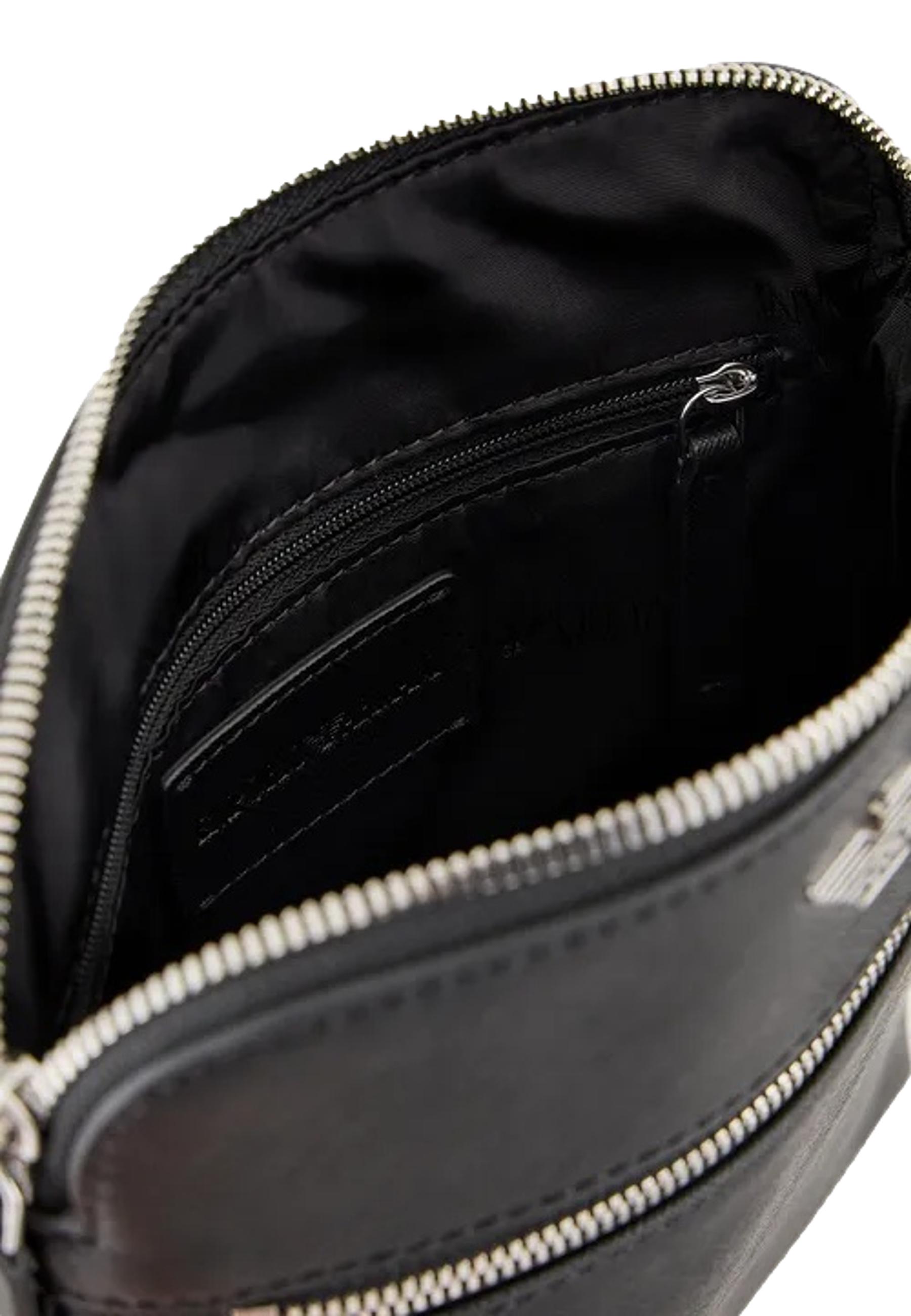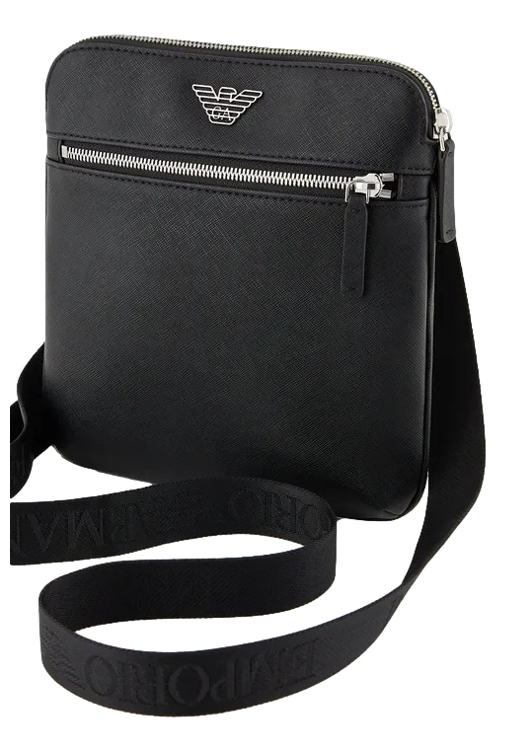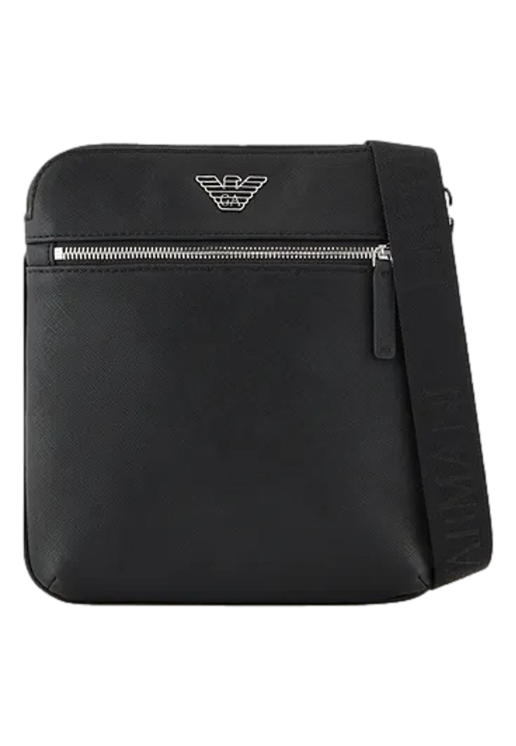 Emporio Armani shoulder bag in black saffiano. Adjustable shoulder strap in logoed nylon webbing. Front metal logo appliqué. Front pocket with zip. Zip closure. 2 inside pockets, one with zip. Lined interior.