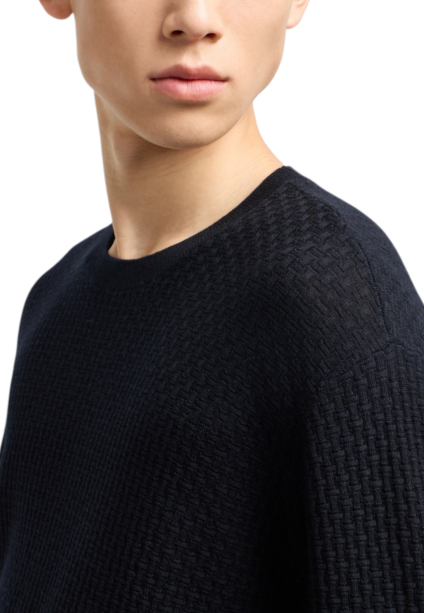 Crewneck sweater made of pure virgin wool with a particularly textured finish, featuring a raised jacquard pattern that creates a natural intersection of structured and sophisticated motifs all over.