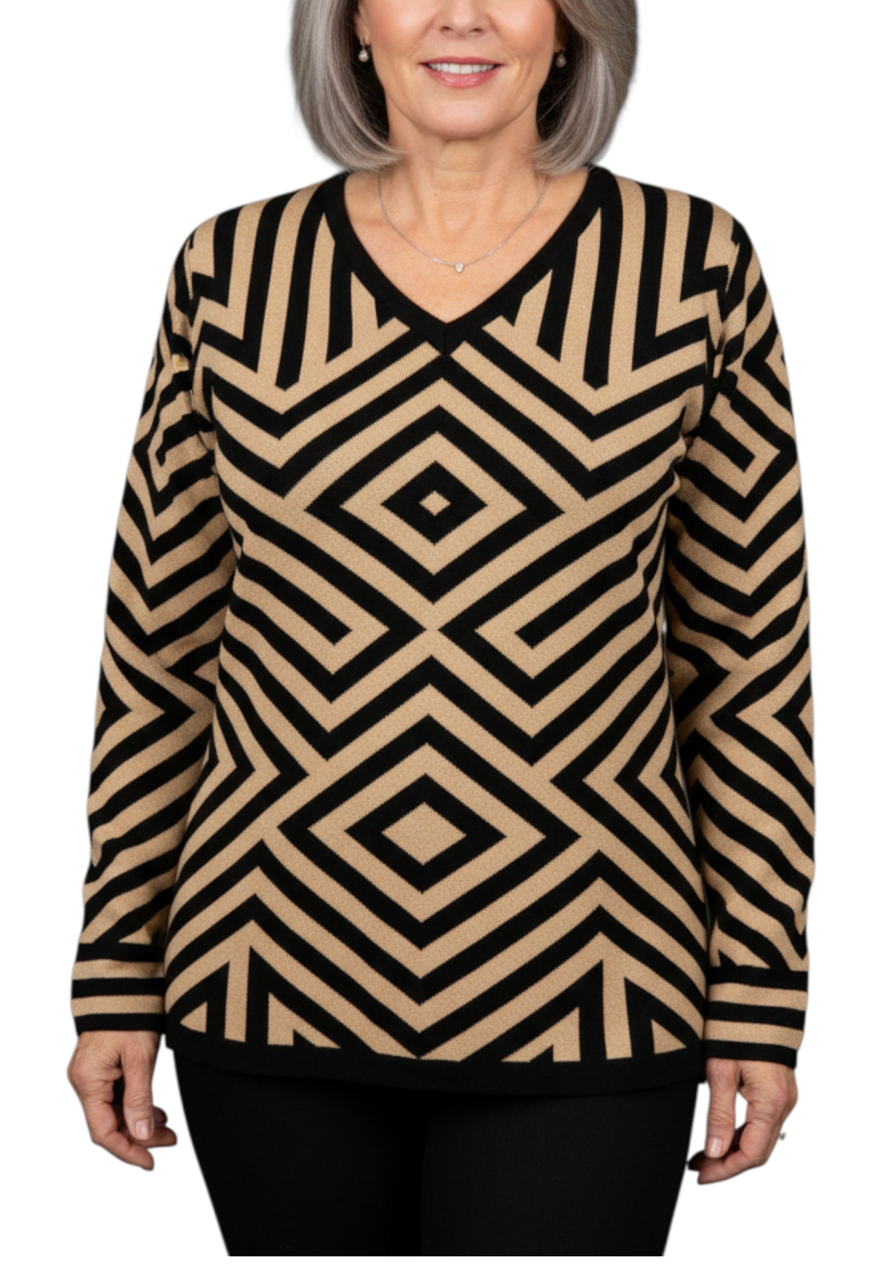 Geometric patterned V-neck sweater with lurex weave
