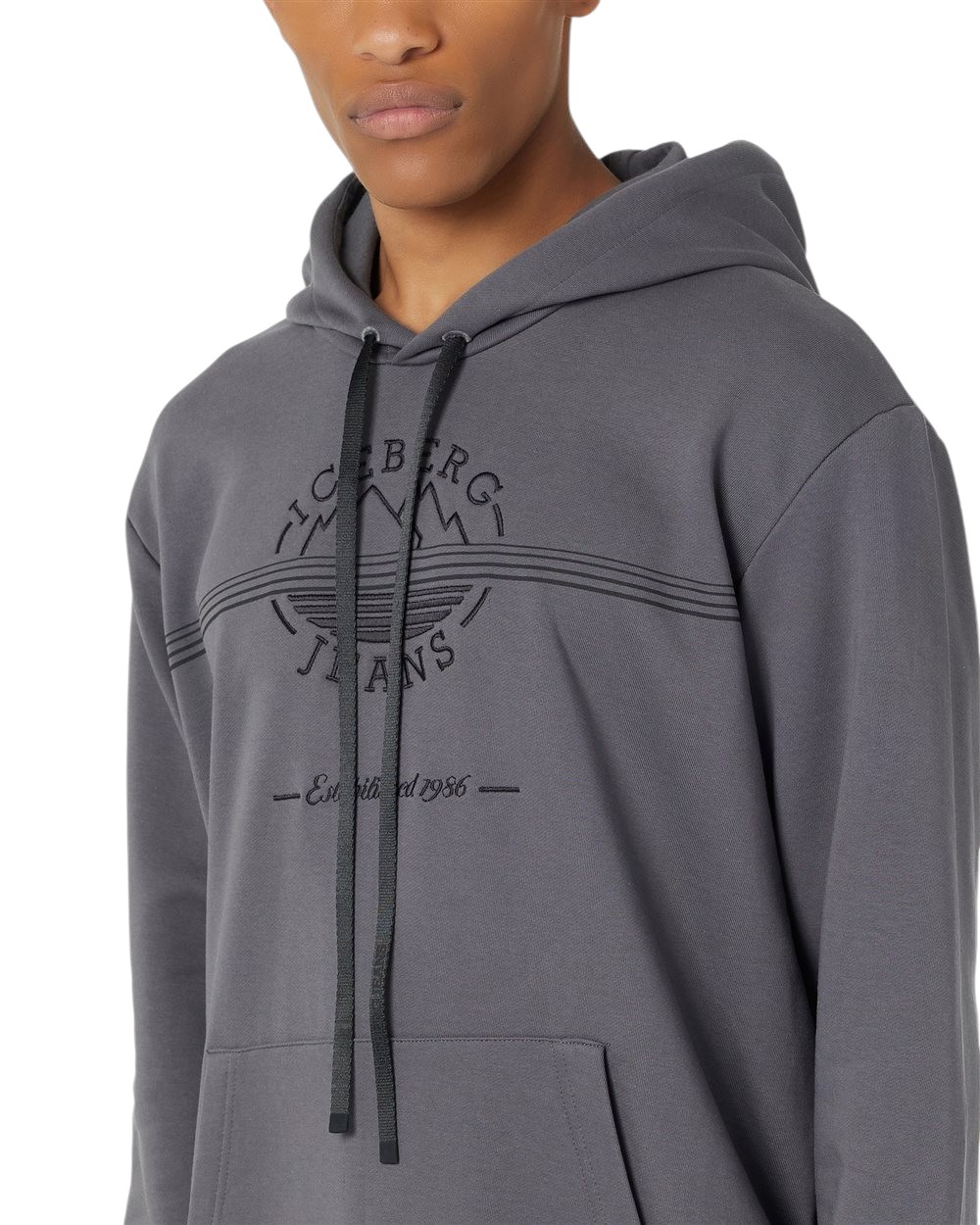 Chill Fit hoodie in lead grey diagonal cotton fleece with Iceberg logo and mountain details