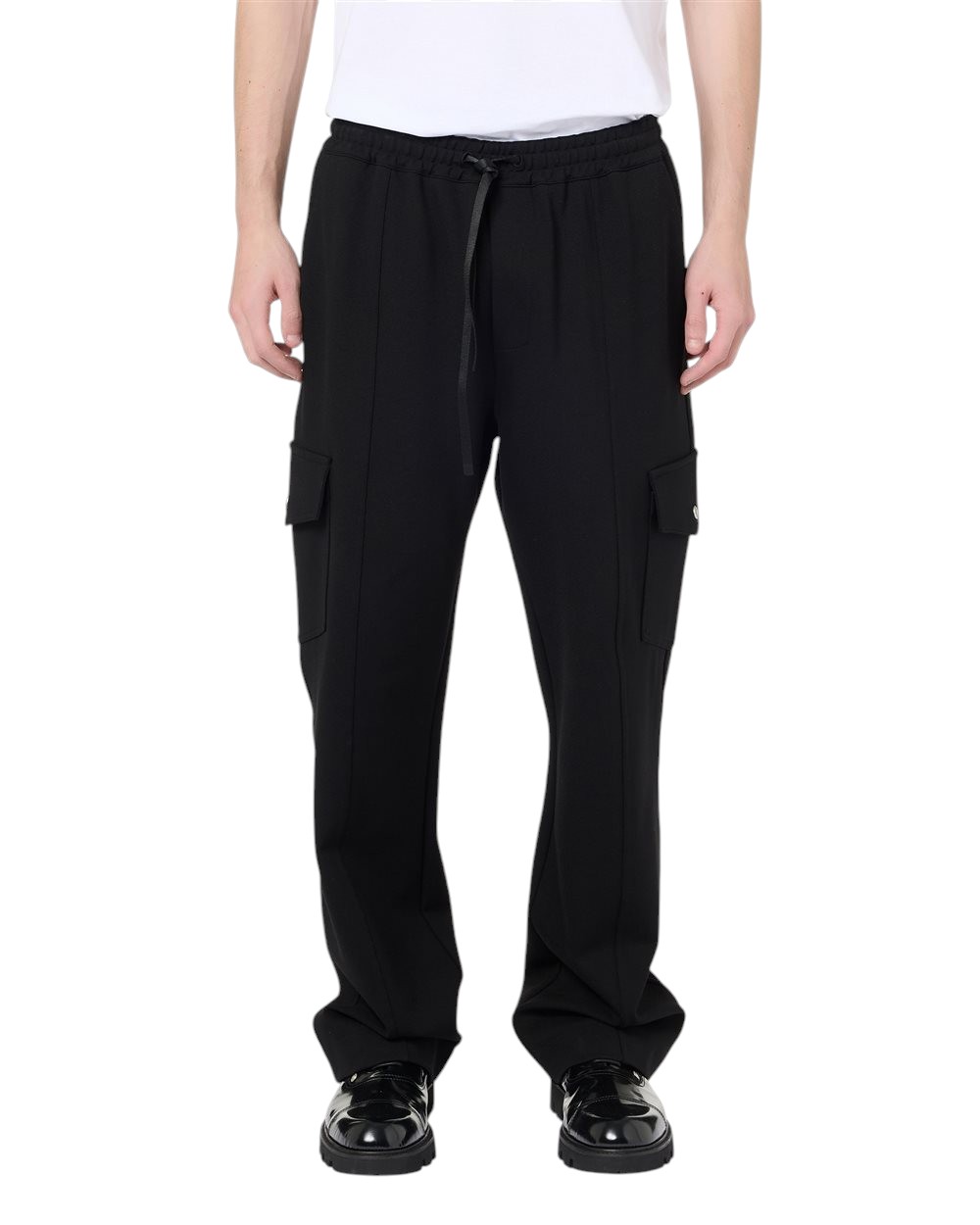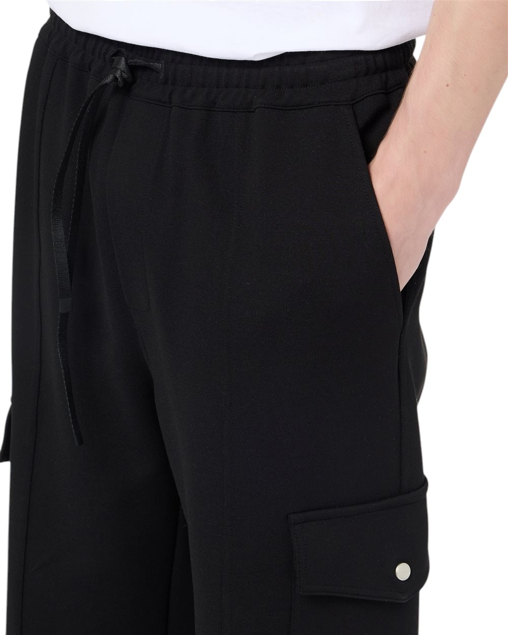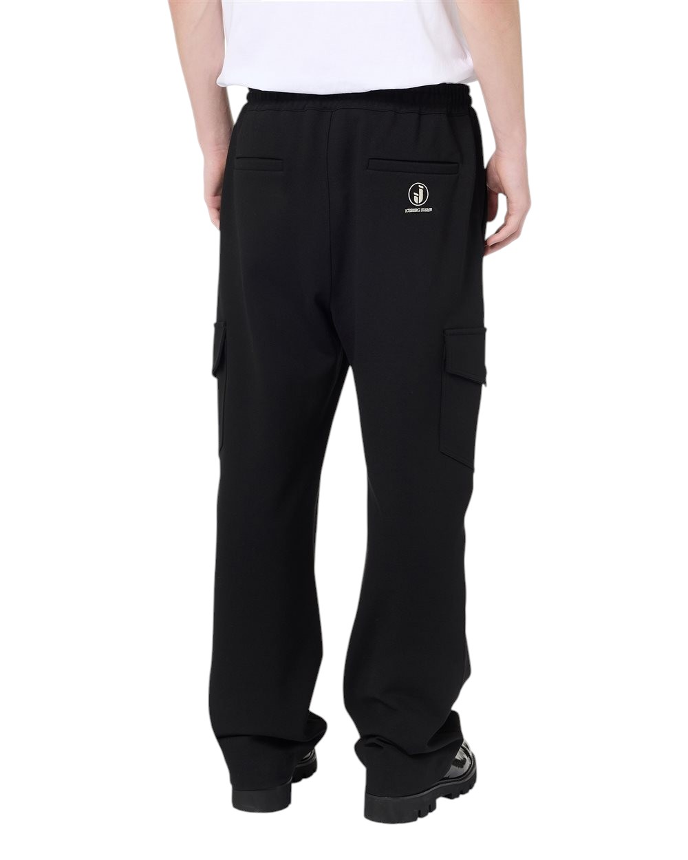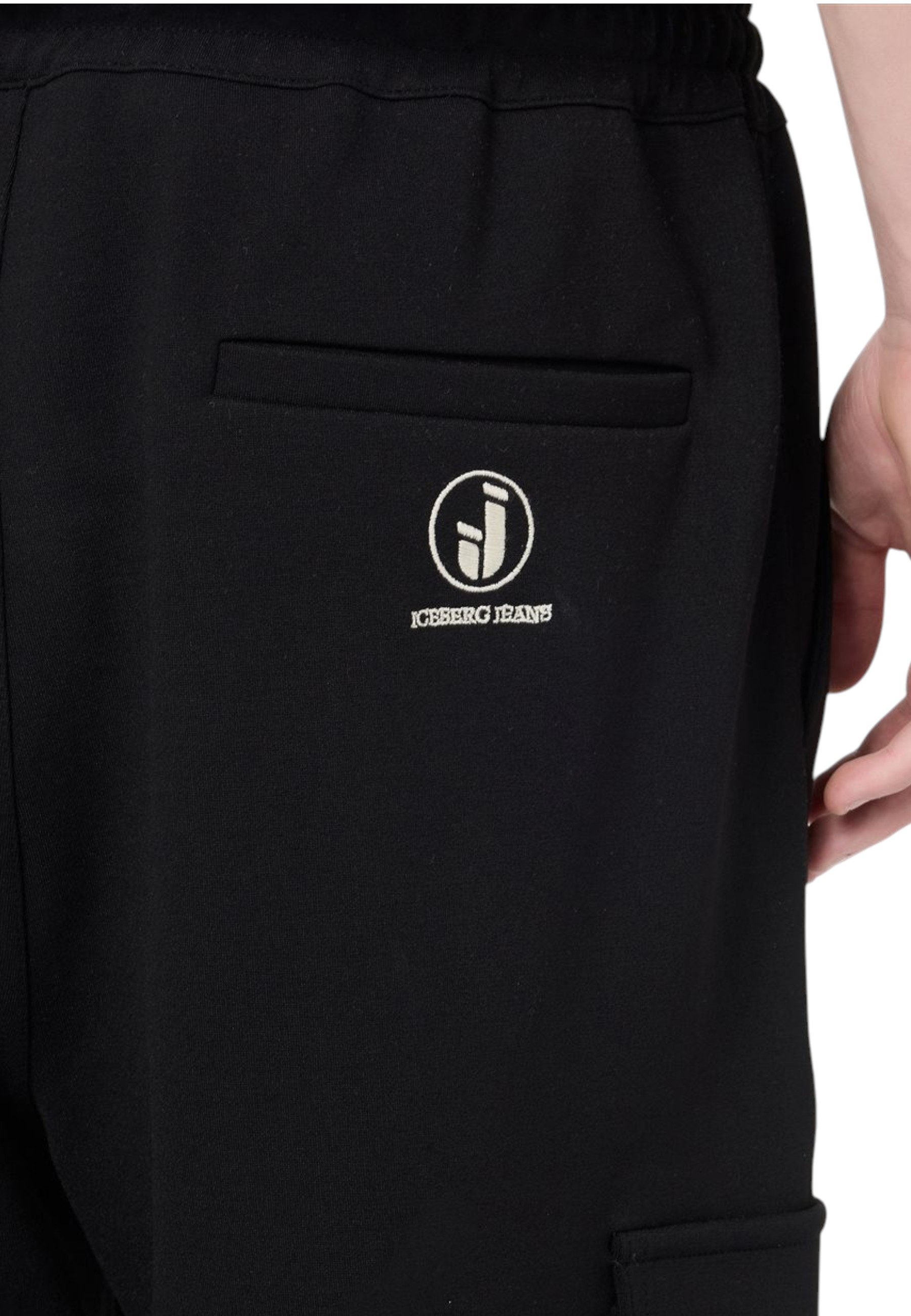These Couli Cargo Fit Trousers stand out for their refined black colour in a blend that gives the garment a sophisticated, textured look. The waist is adjustable with a drawstring in matching fabric, while the large patch pockets with flaps on the knees emphasise the utility inspiration. The Iceberg IJ logo embroidery, positioned below the right back welt pocket, adds a discreet and recognisable touch of elegance, making these trousers a functional and contemporary must-have.