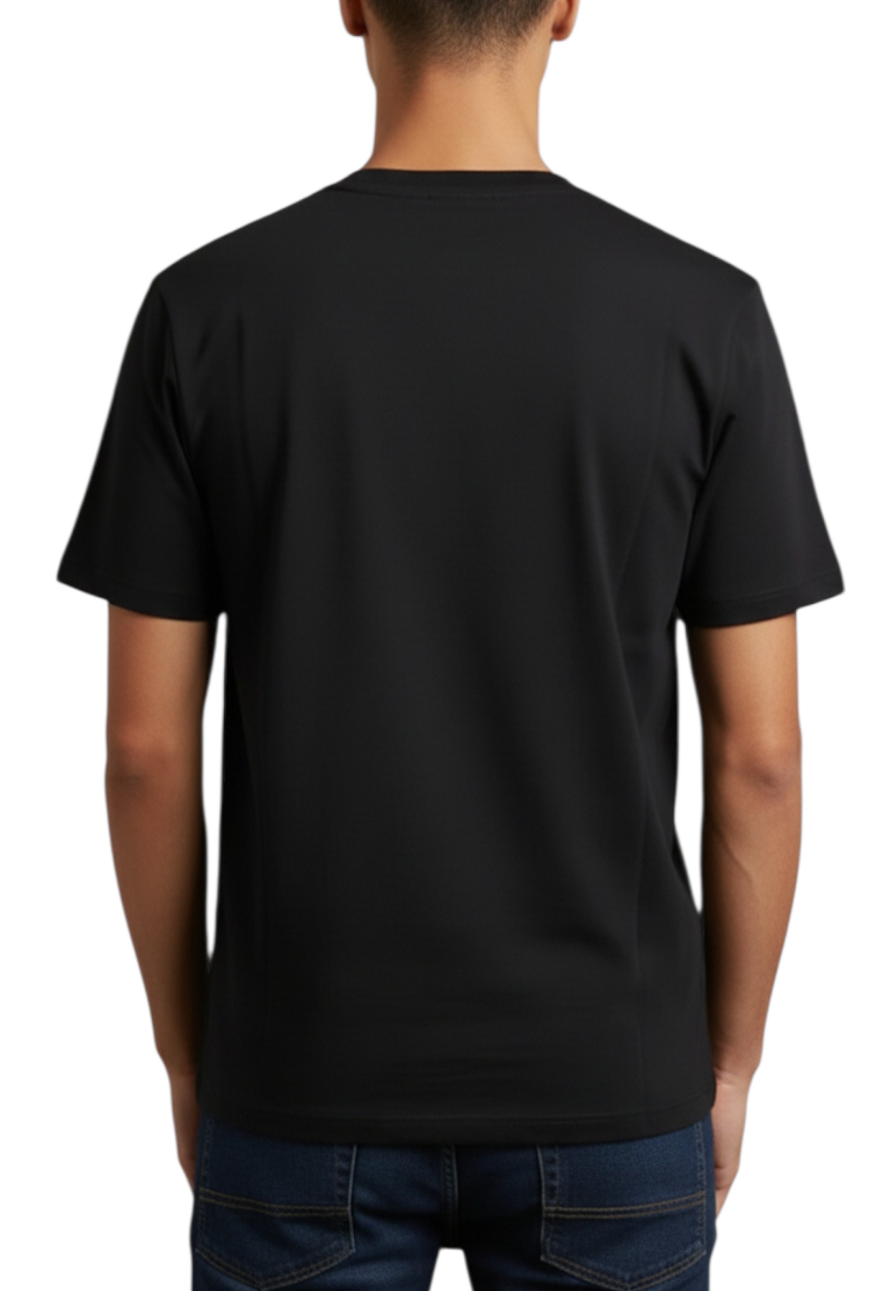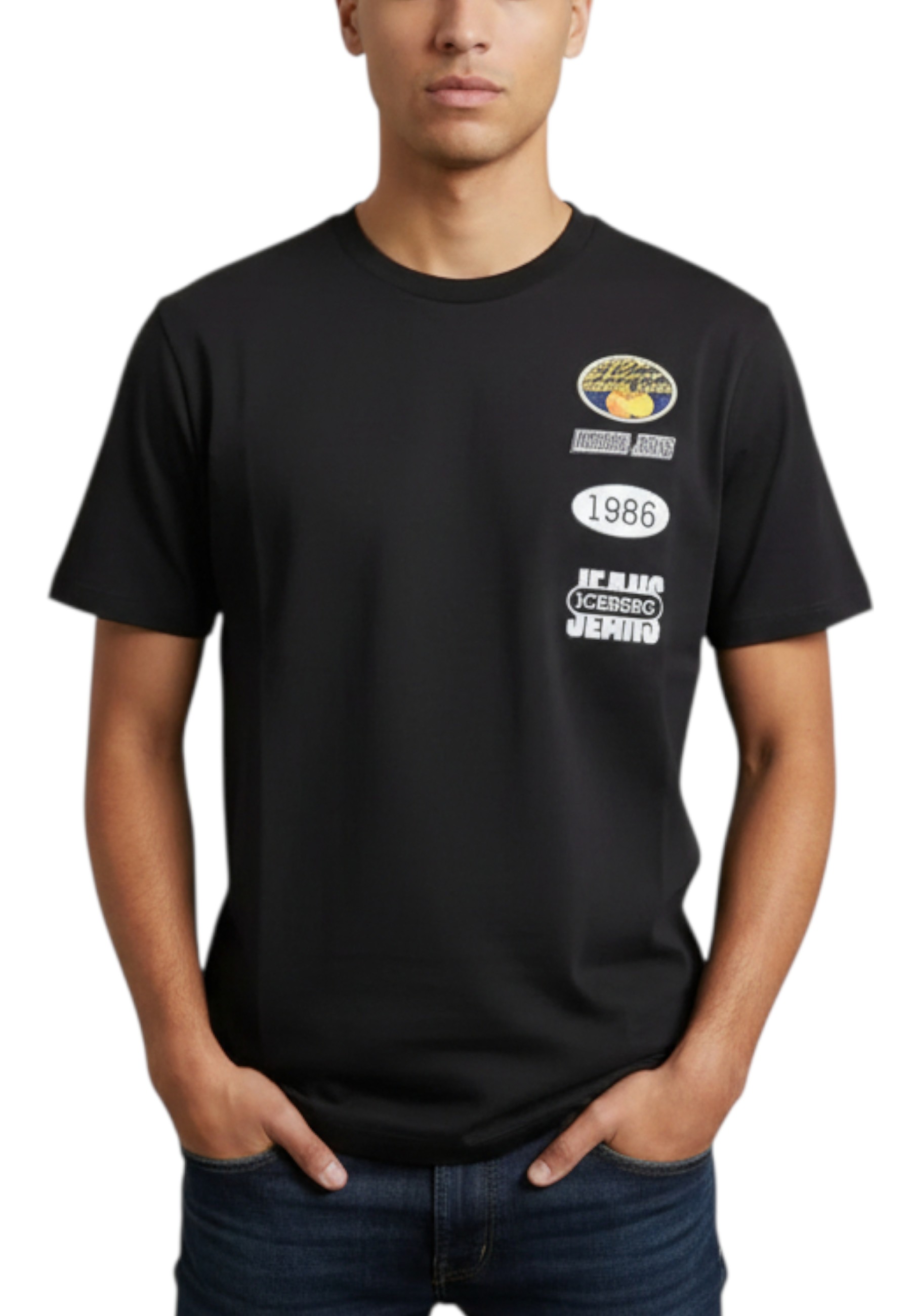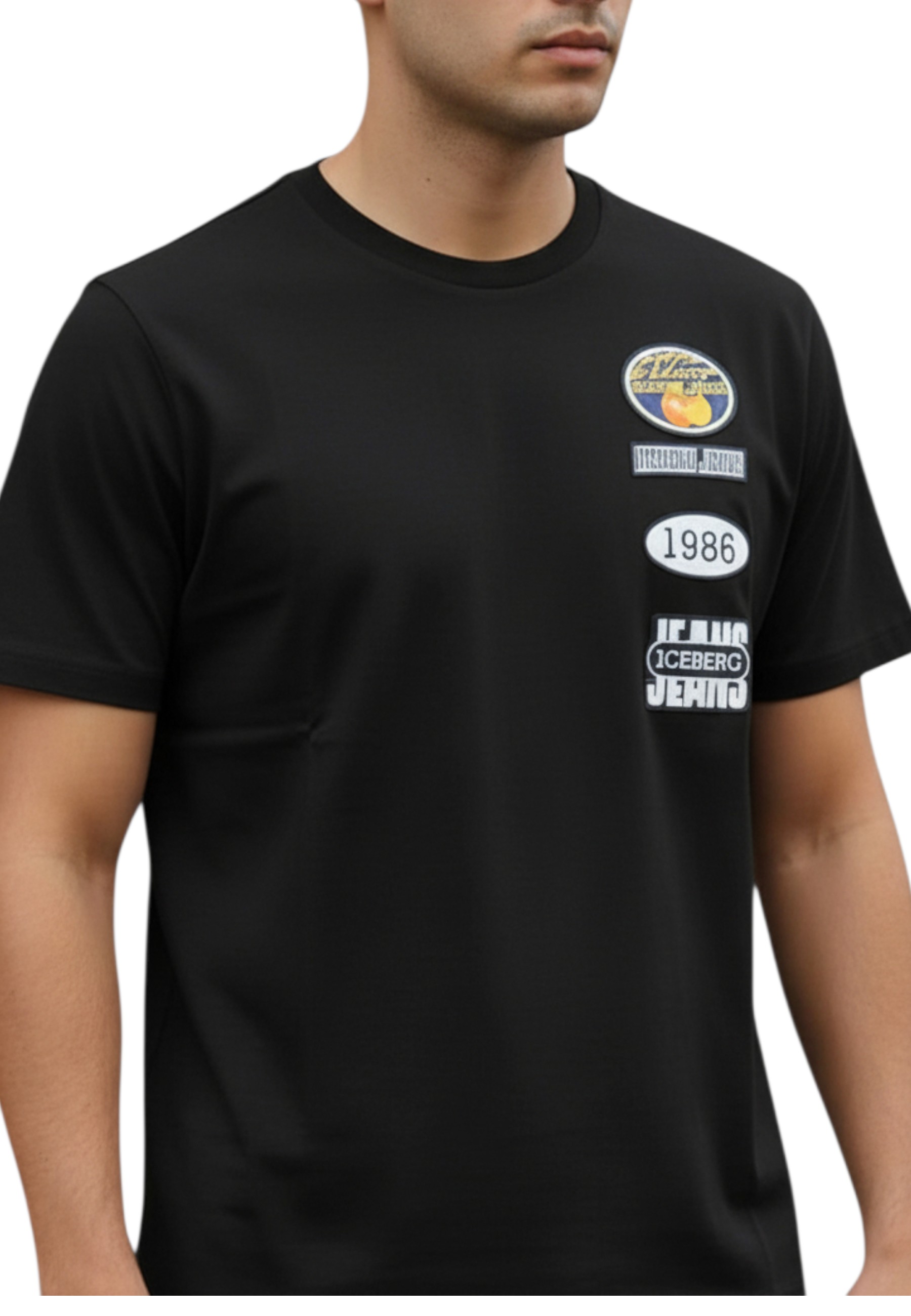 This black model features embroidered patches and prints on the chest, creating an original, visually striking graphic mix. The design is completed by a crew neck, short sleeves, and a comfortable fit, ideal for everyday wear.