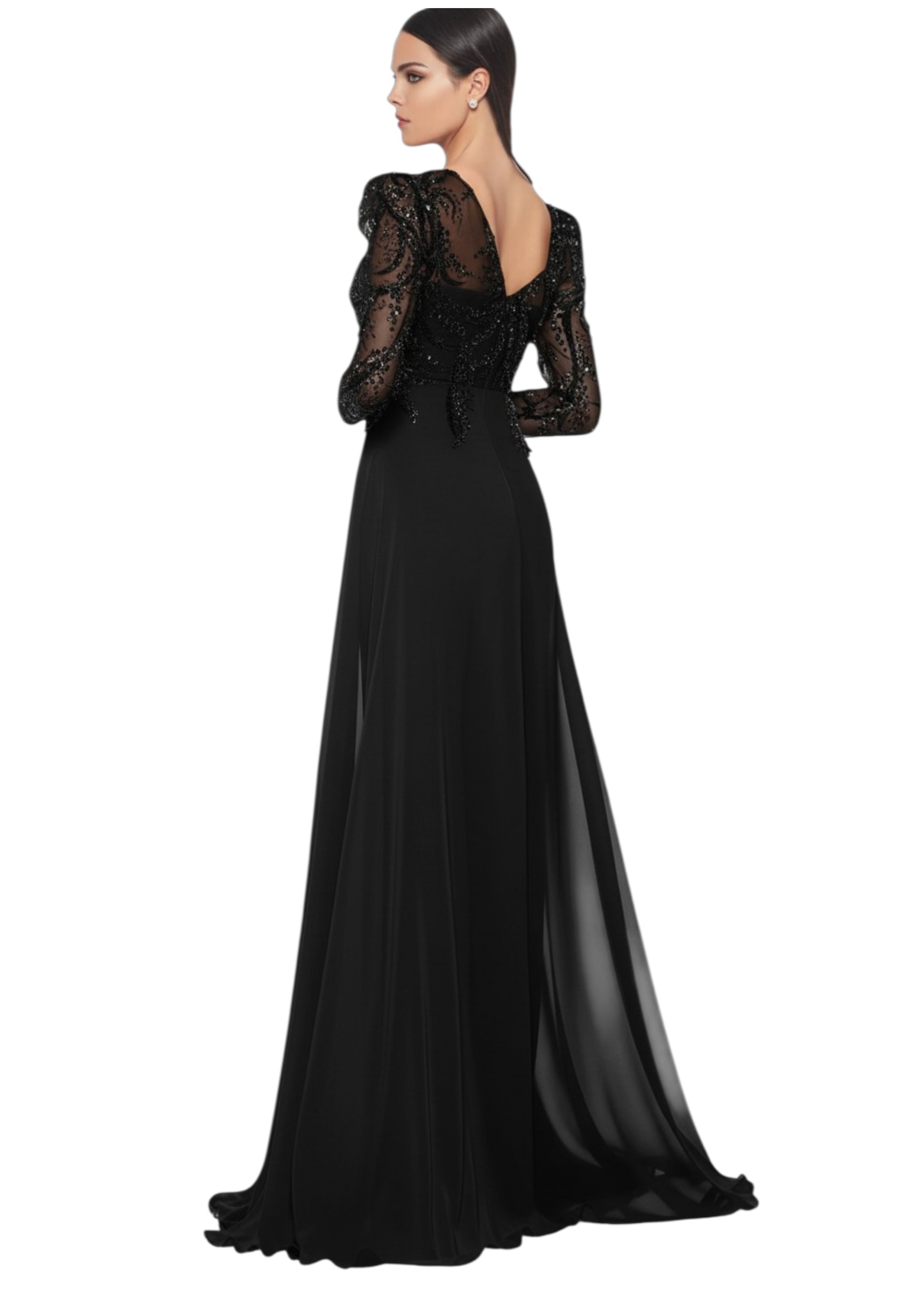 Long sleeves complete the piece, making it ideal for more formal occasions or cooler seasons. The Empire line, with its high waist, accentuates the figure and ensures a harmonious and comfortable fit.