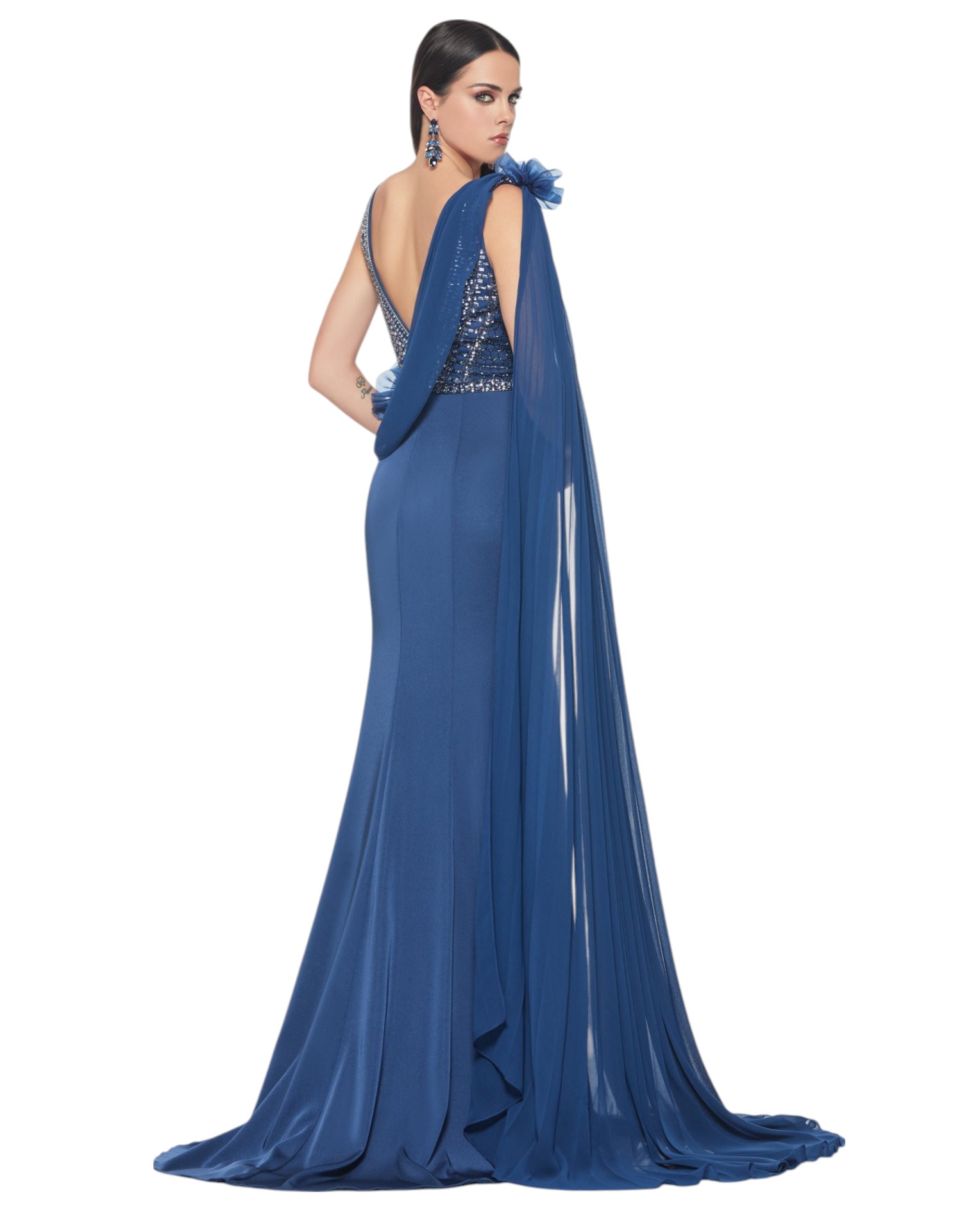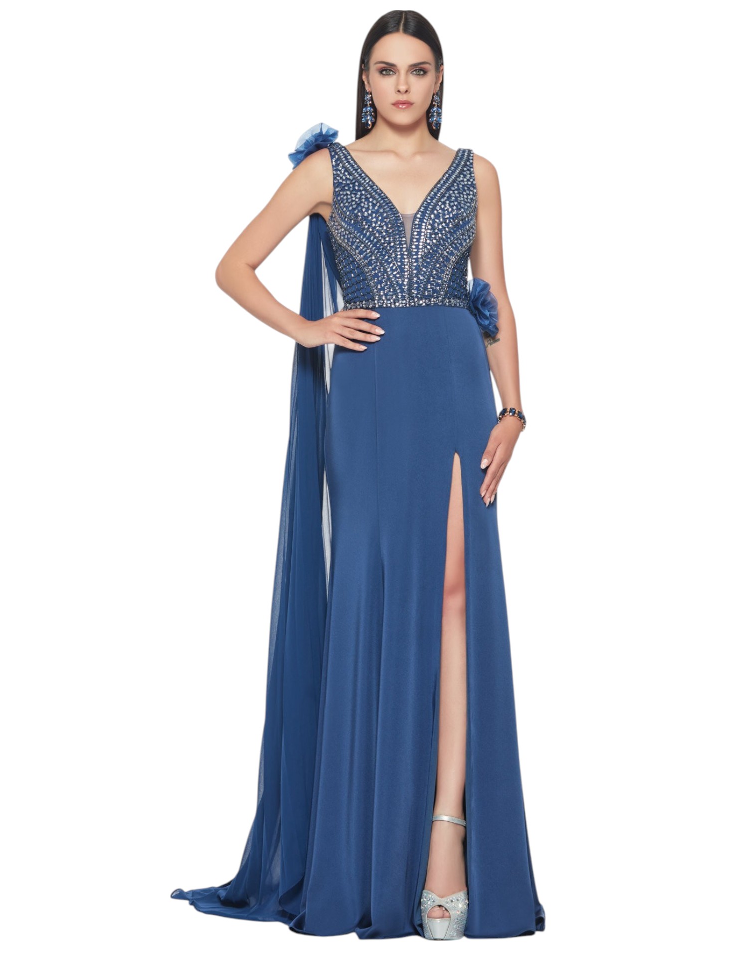 Elegance and femininity come together in this long formal dress, perfect for the most special occasions. The bodice, with thin straps and rich workmanship embellished with appliqués, enhances the décolleté with taste and refinement. The side slit lends movement and sensuality to the flowing skirt, while an appliquéd sash at the back adds a dramatic touch, complemented by a delicate organza flower for a romantic and sophisticated detail. A garment designed to leave a mark.