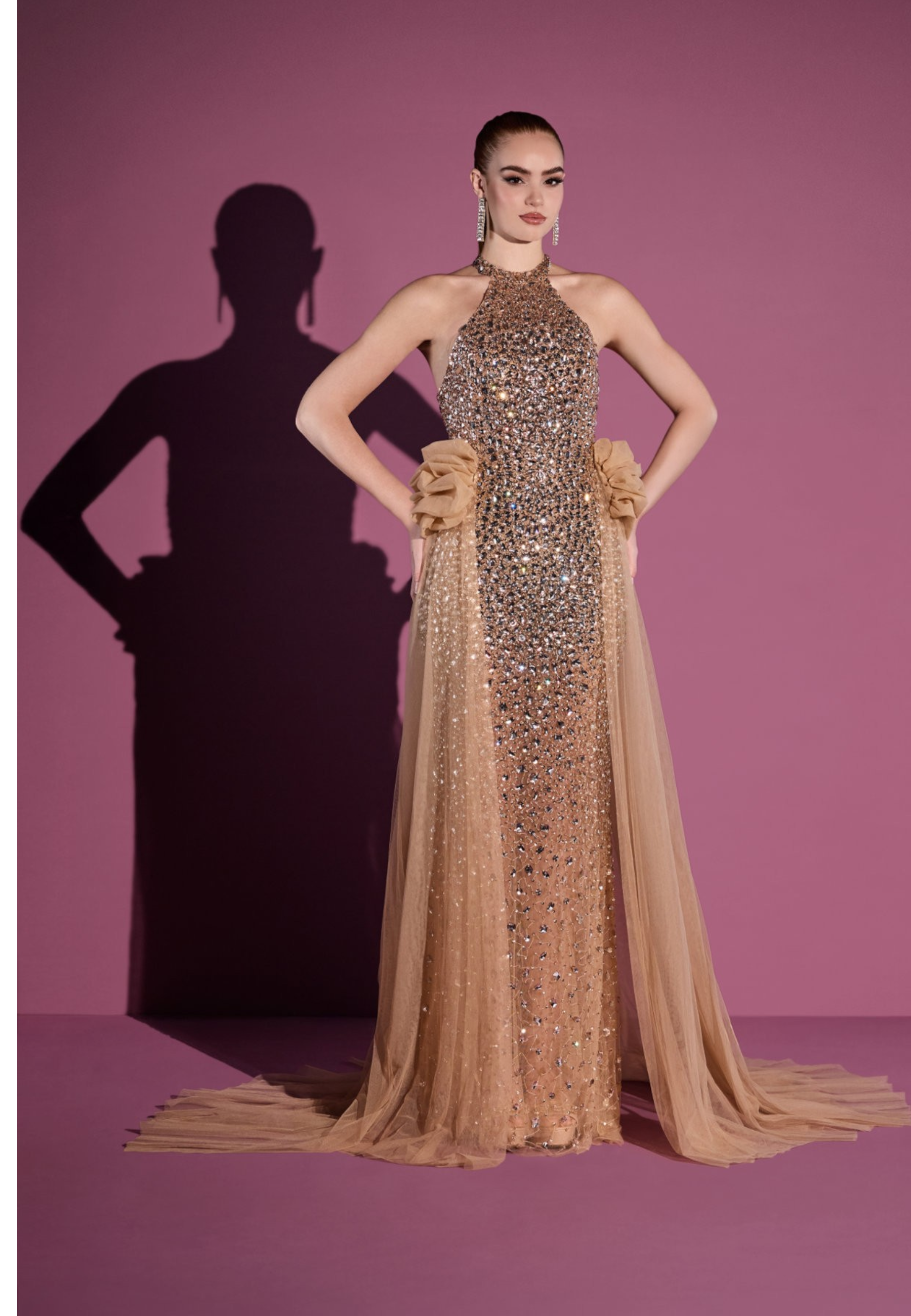 Long jewelled dress made from fabric with elegant sheer details, entirely covered with sparkling stone appliqués that enhance the silhouette with a dramatic and refined effect.