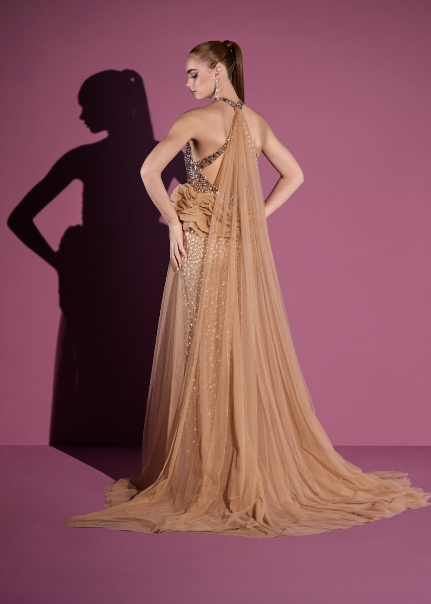 The design is embellished with tulle side panels, which add lightness and movement, and a tulle panel applied to the back of the neck, for a sophisticated and visually striking detail.