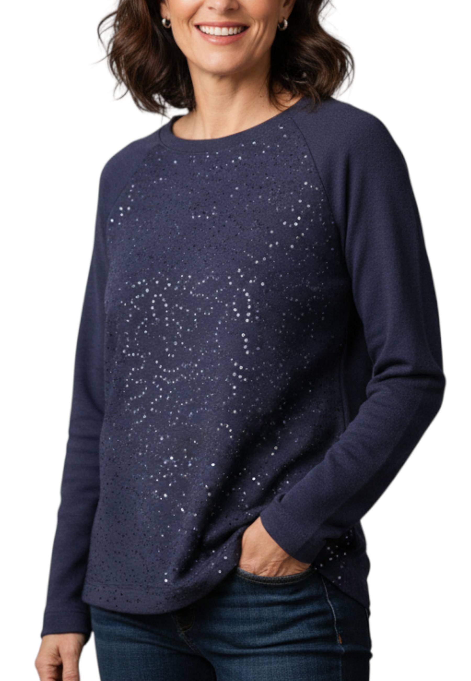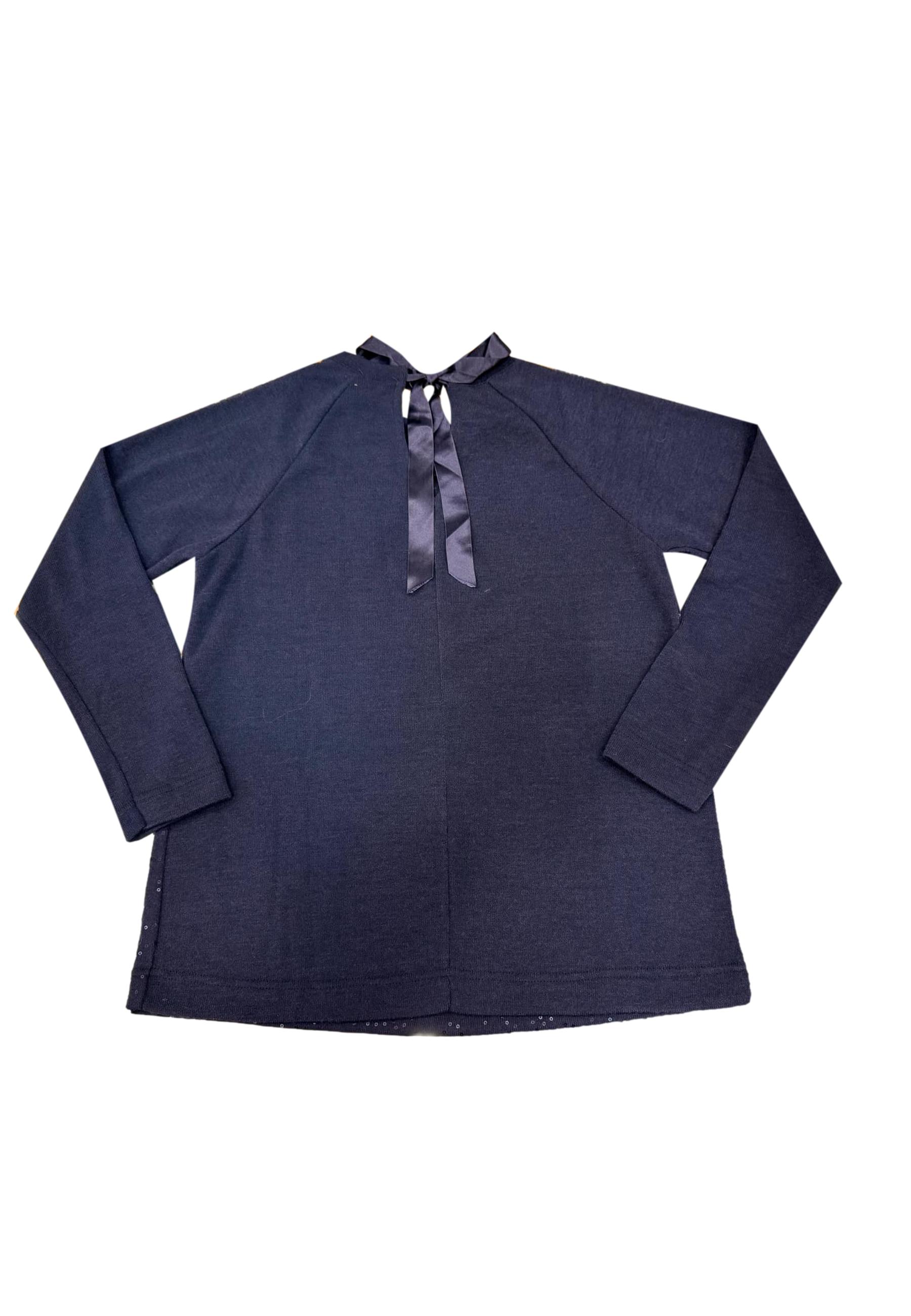 Long-sleeved crew-neck sweater with tone-on-tone micro sequins on the front and satin bow placket on the back