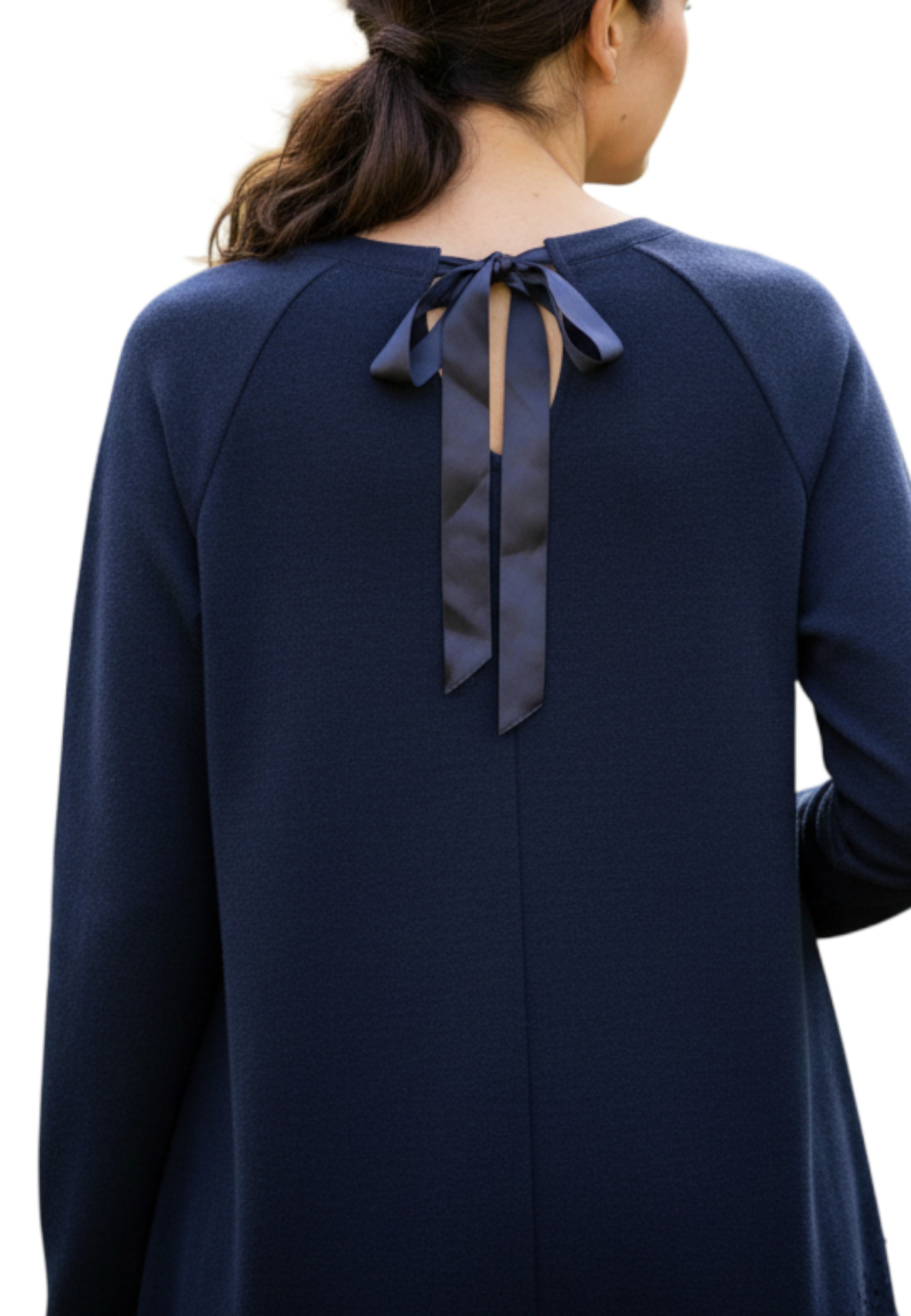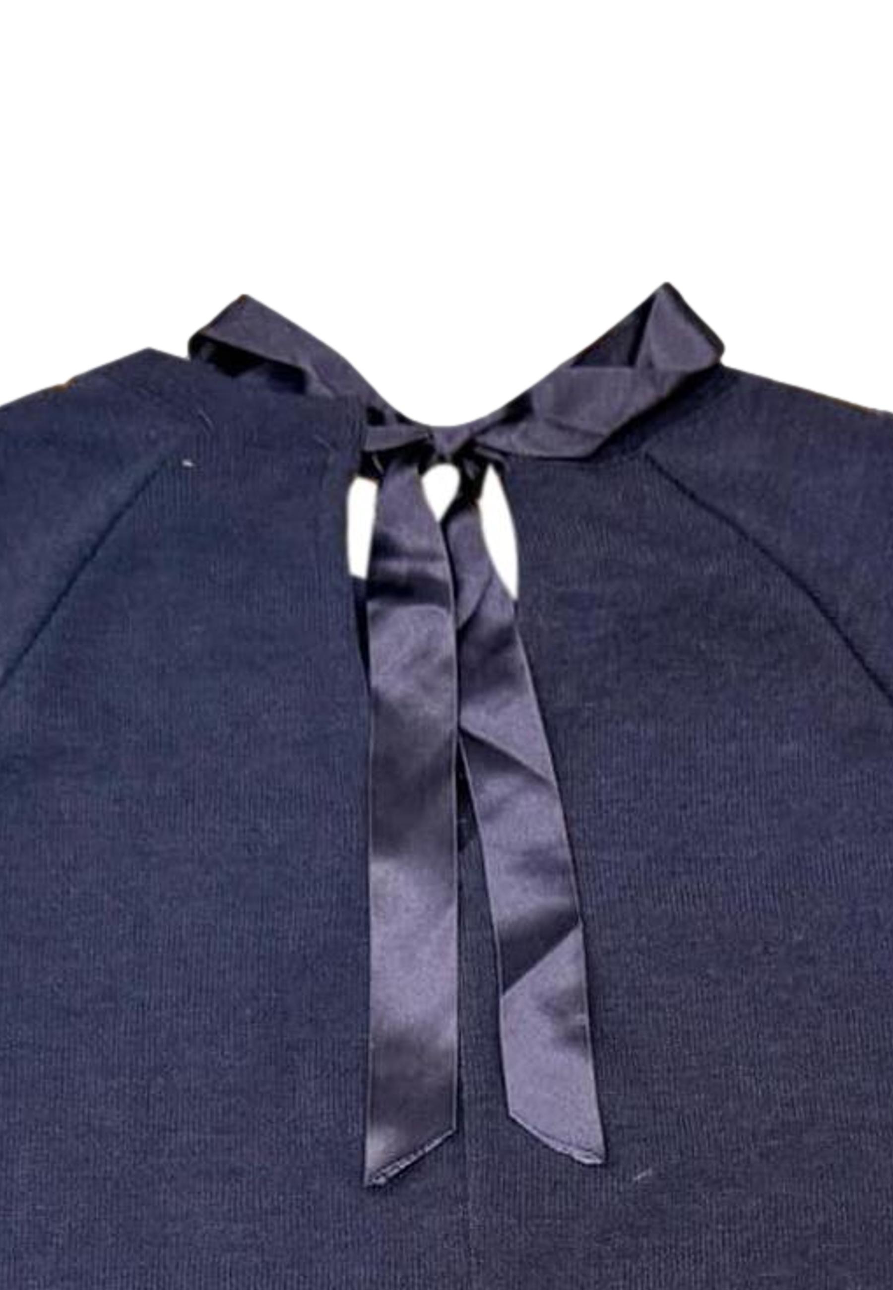 Long-sleeved crew-neck sweater with tone-on-tone micro sequins on the front and satin bow placket on the back