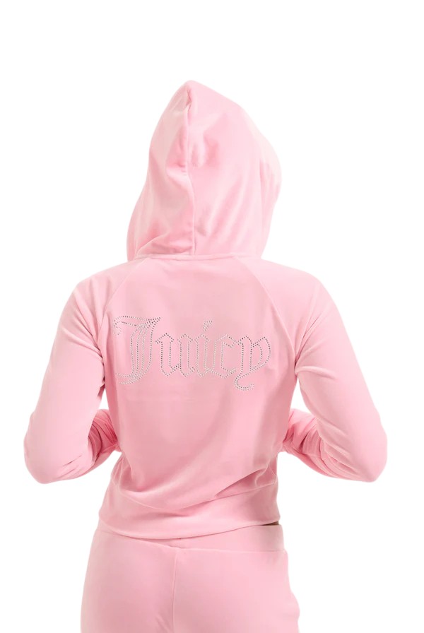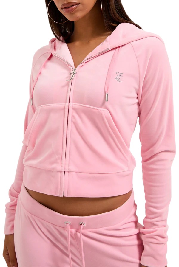 Black women's sweatshirt by Juicy Couture, made from soft stretch velvet. The model features a cropped cut with long sleeves, fitted cuffs and a comfortable hood. On the back, the 'Juicy' logo is decorated with tone-on-tone rhinestones, adding a touch of glamour and iconography to the garment. Ideal for casual yet polished looks, perfect for pairing with matching trousers or high-waisted jeans. A must-have for those who love Y2K style and comfort without compromising on style.
