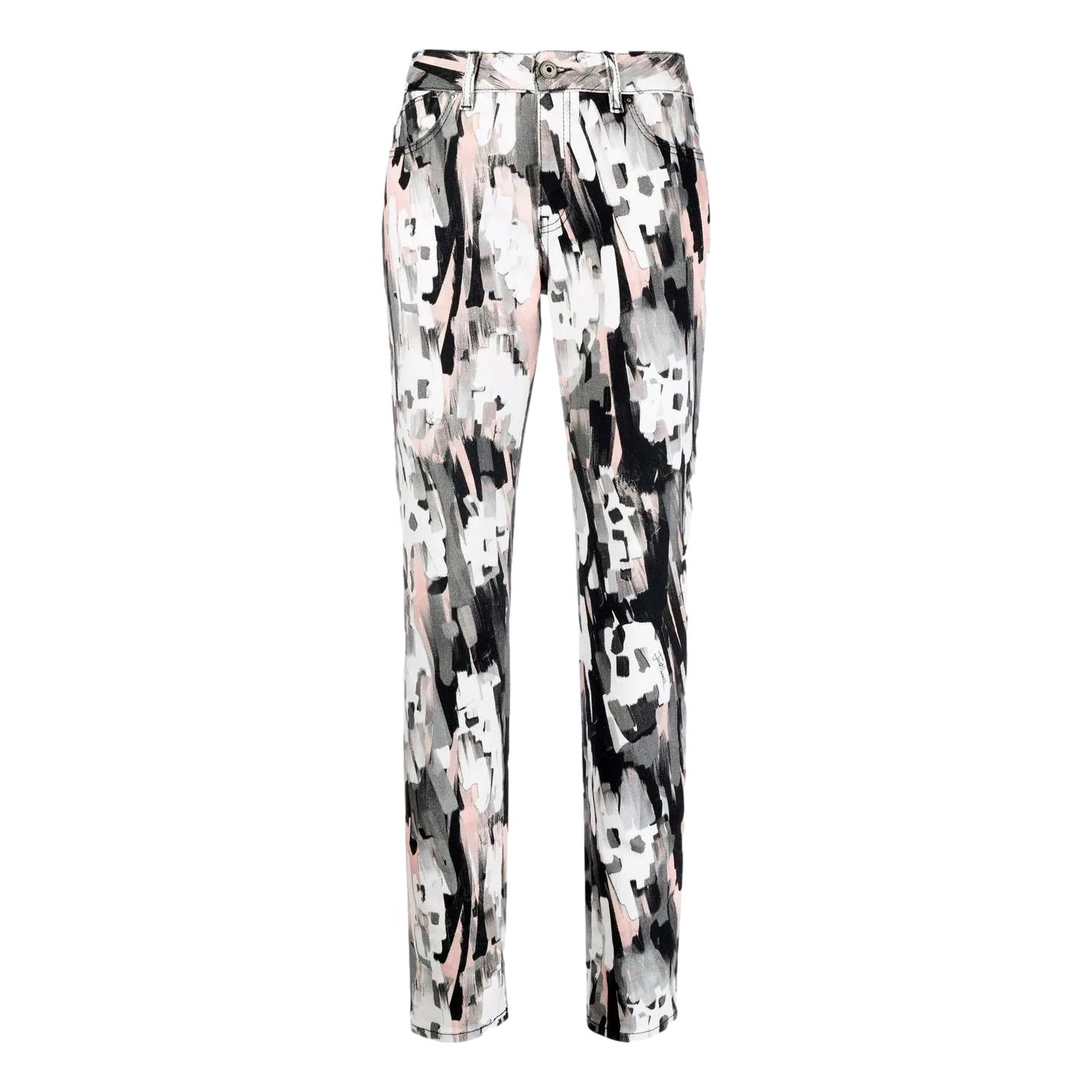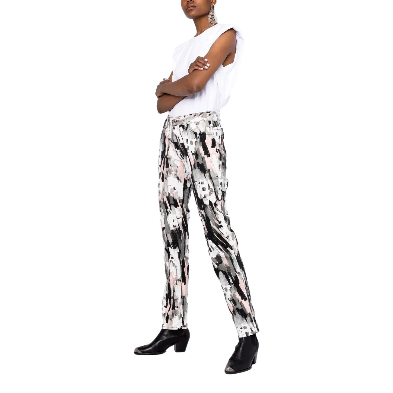 Skinny cut, abstract pattern, front closure with buttons and zip, back application with logo and belt loops. White color.