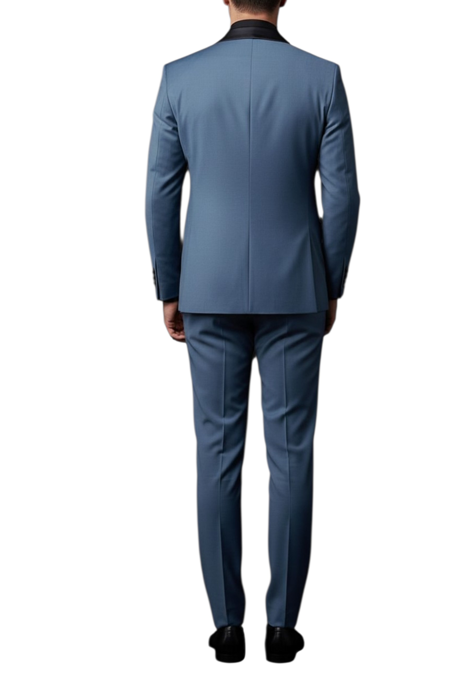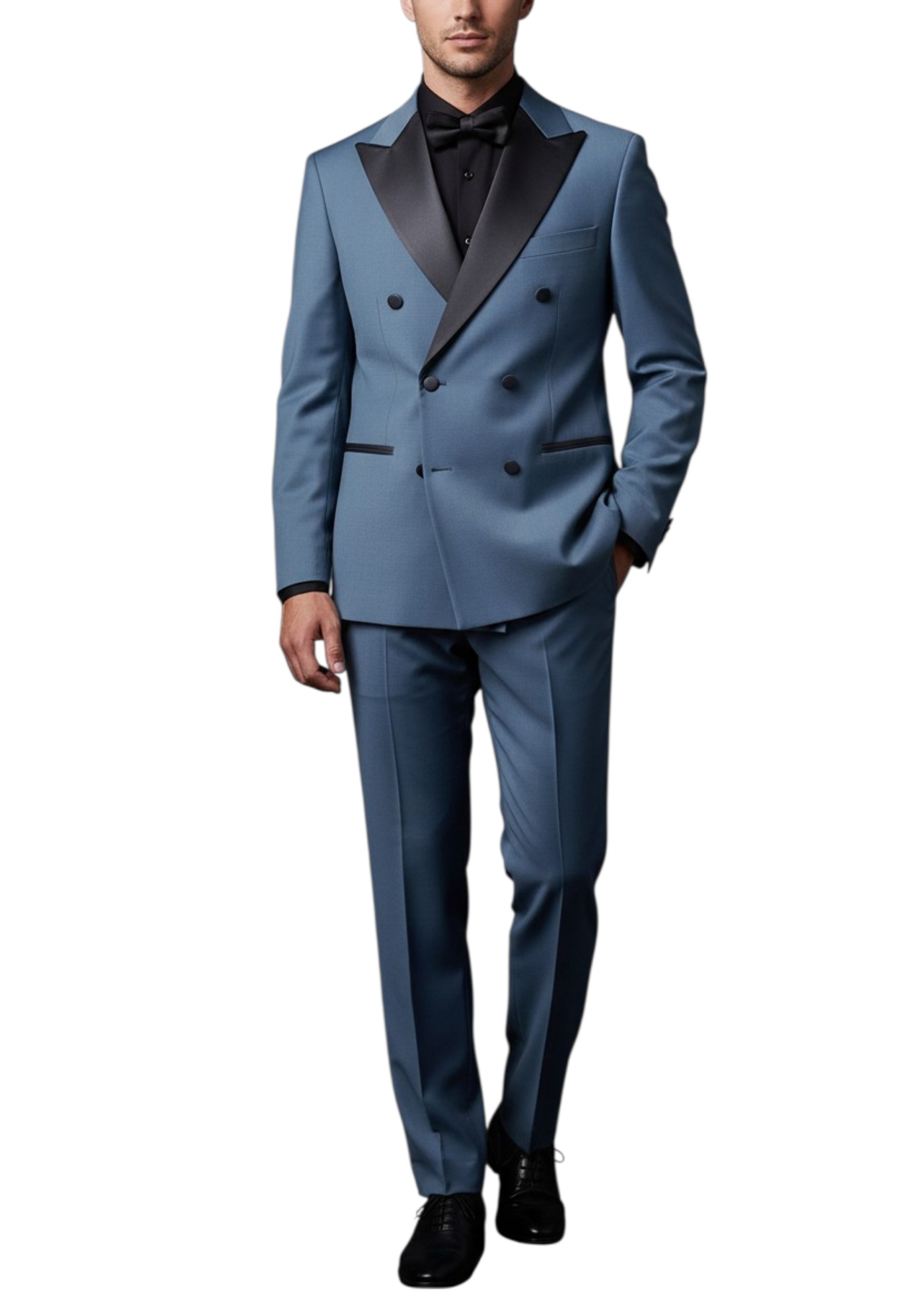 A double-breasted suit with an elegant, contemporary style, characterised by clean, structured lines. The jacket features refined lapels and buttons covered in satin fabric, a distinctive detail that lends the garment a luminous, sophisticated finish.