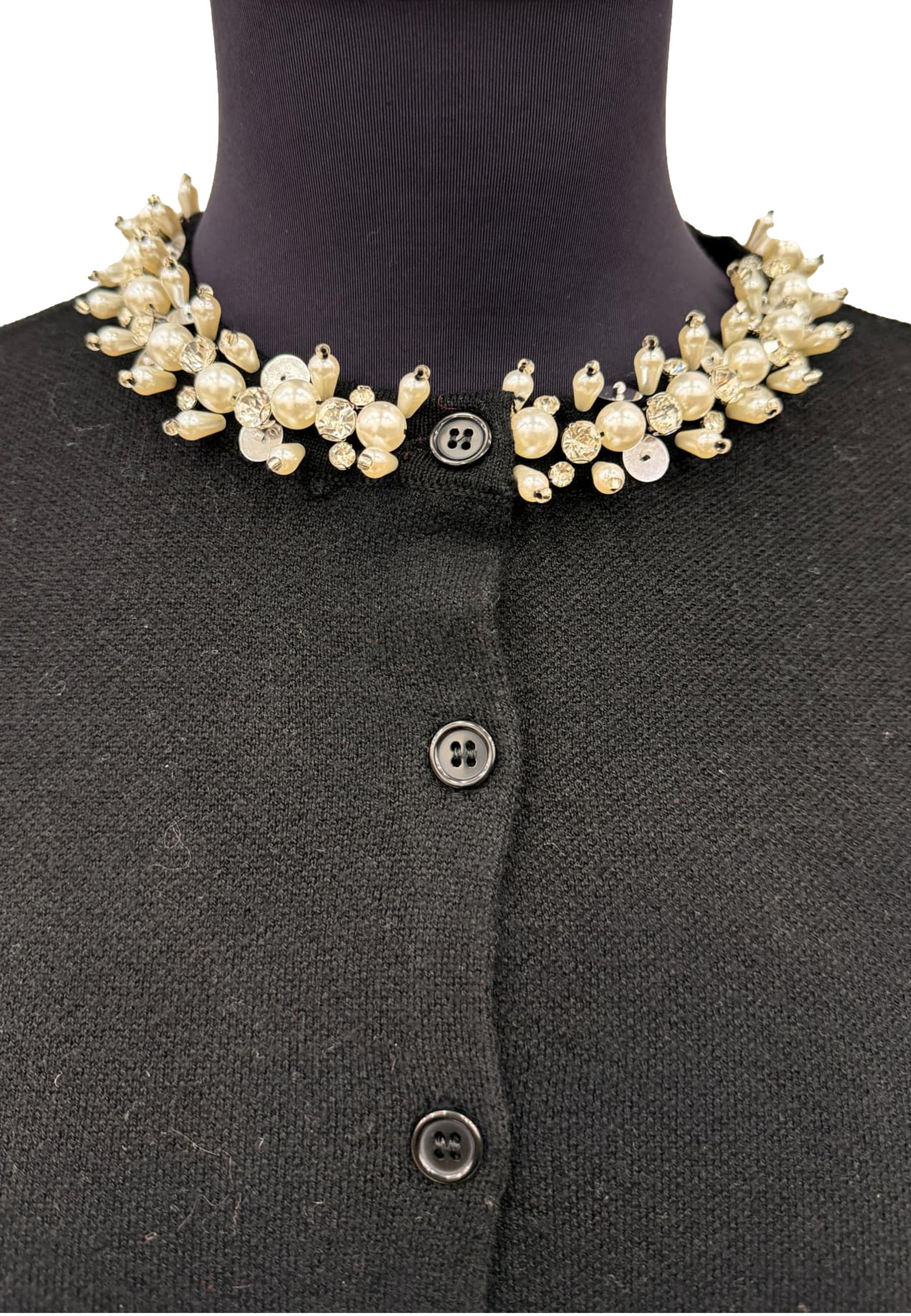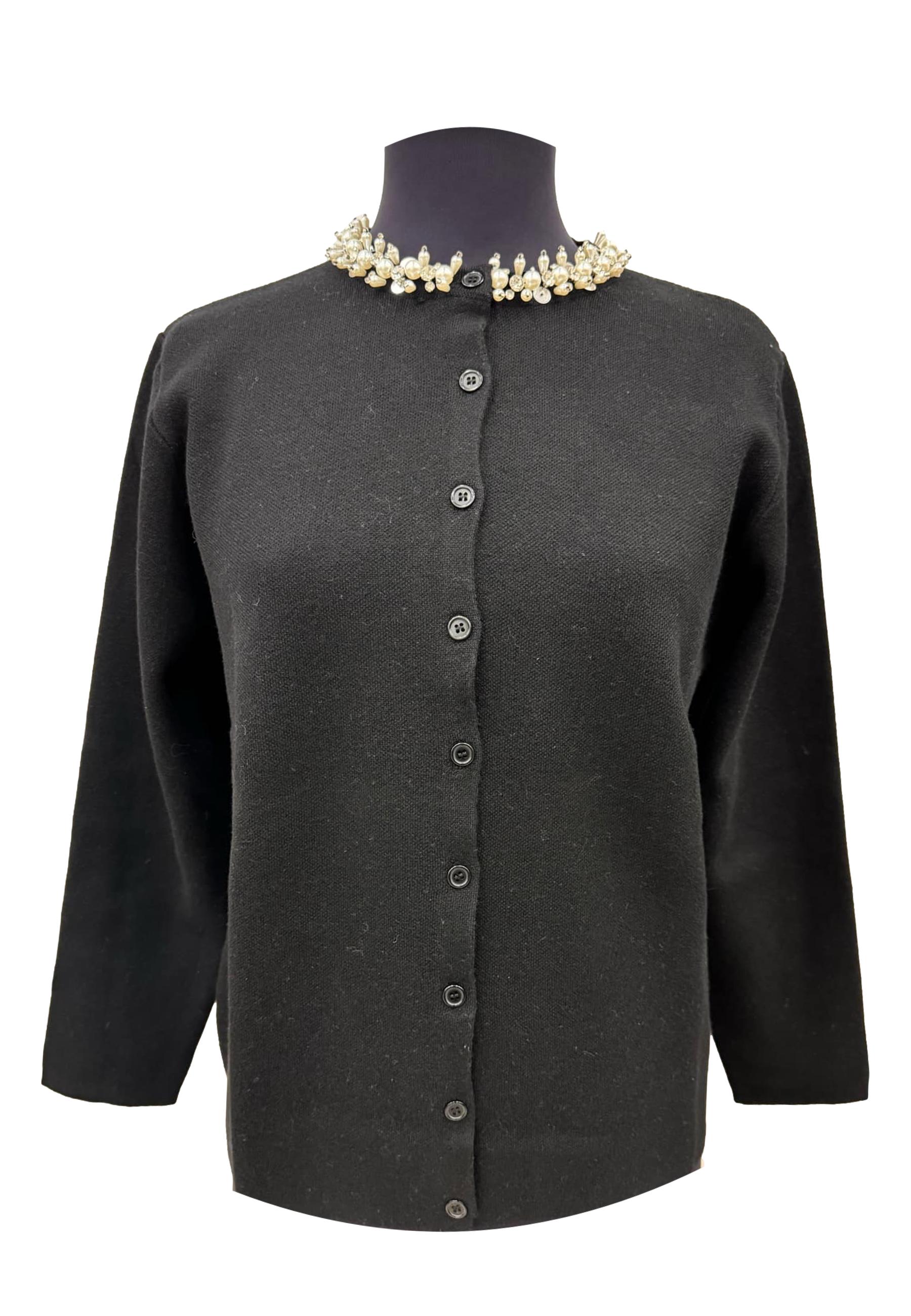 Cardigan with pearl and rhinestone appliqués on the neckline and central buttoning