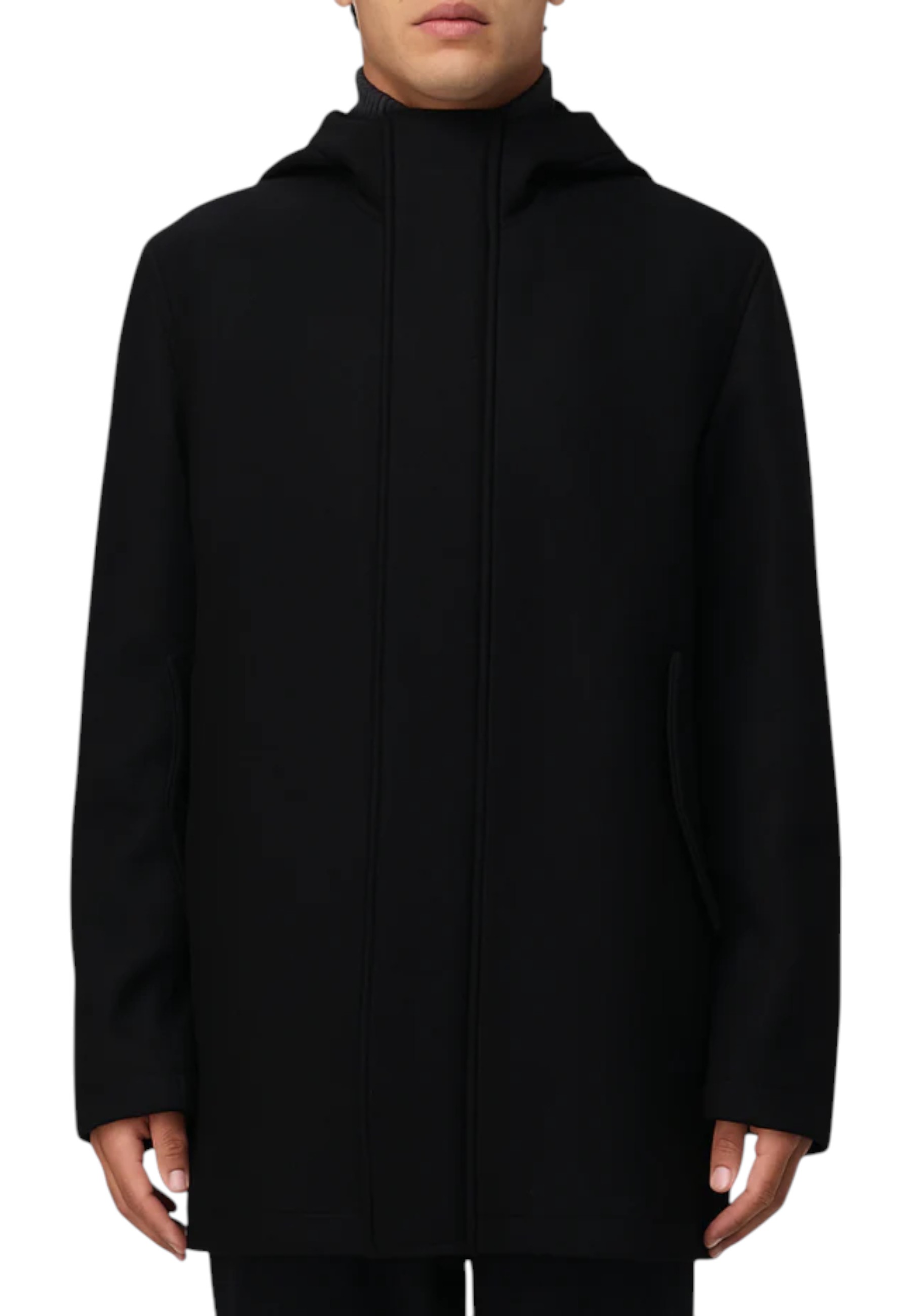 An elegant and functional men's coat, made from wool blend fabric to ensure comfort and protection in the colder seasons. Featuring a fixed hood, it has a front opening with a concealed zip and invisible press stud fastening for a clean and refined design. The front flap pockets add practicality and style.